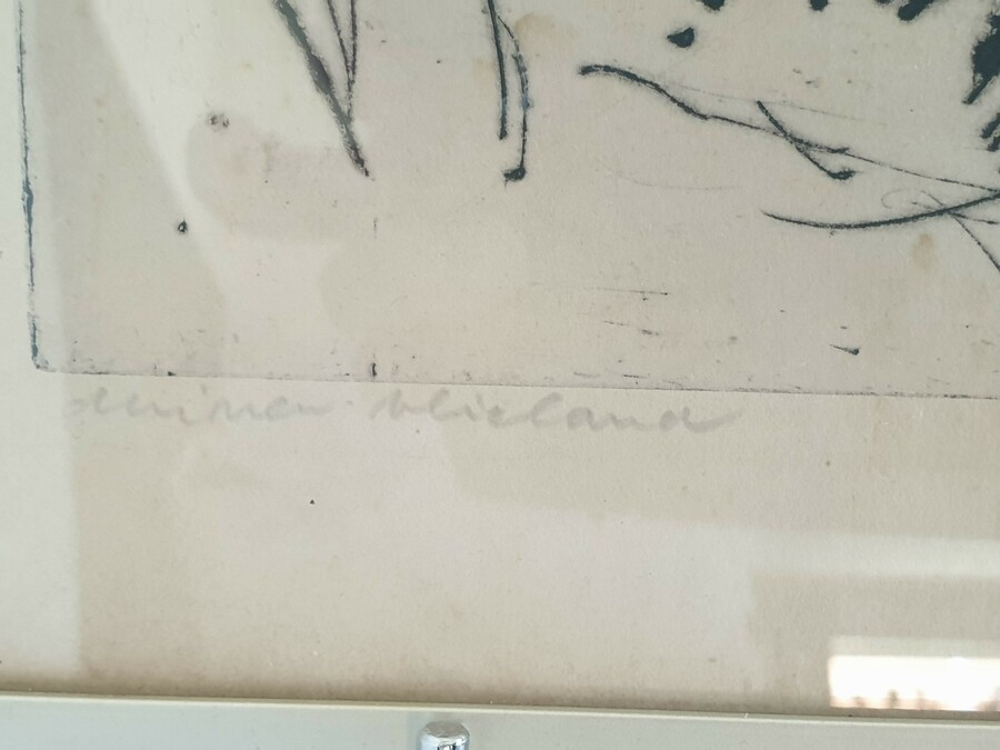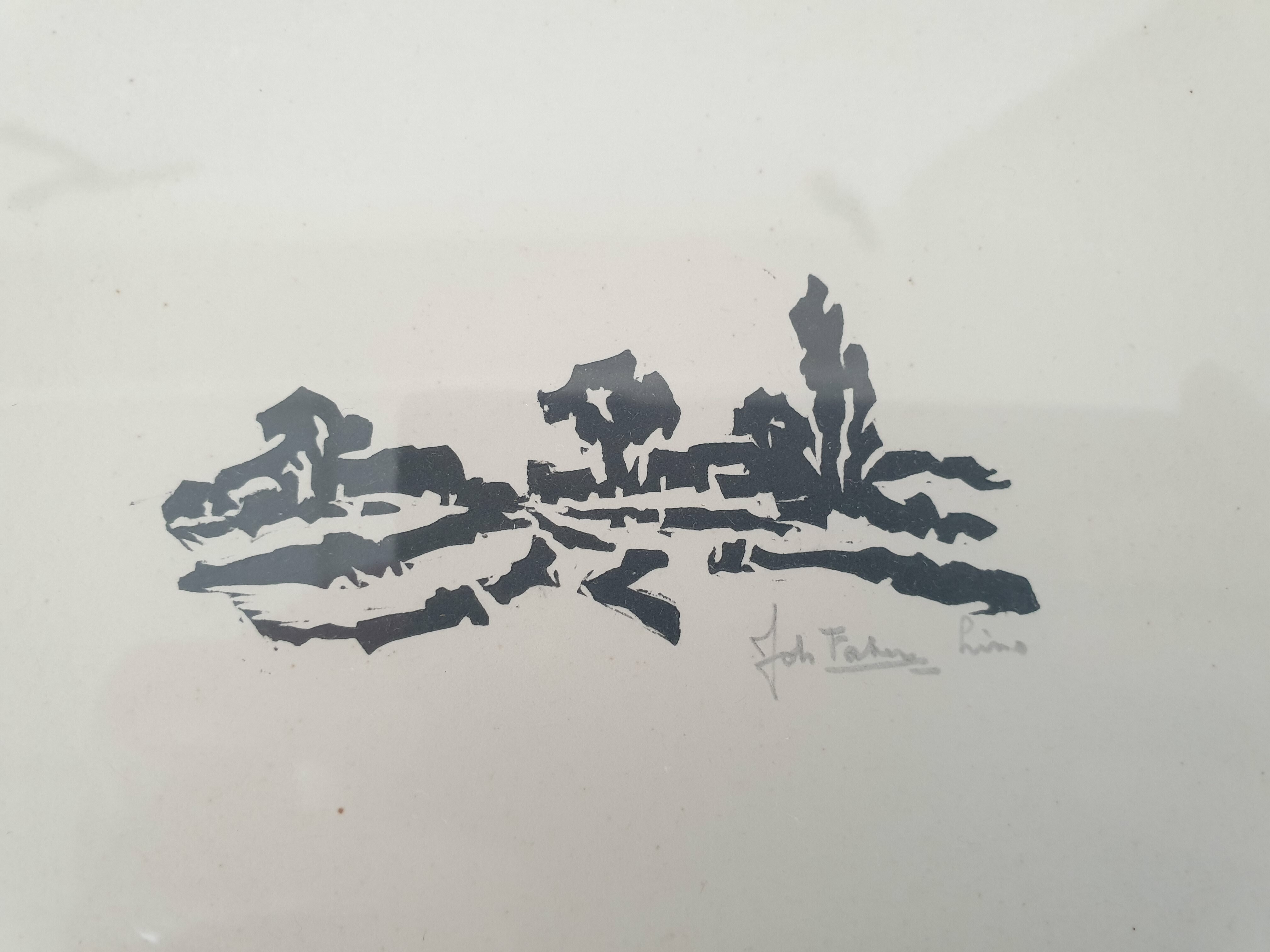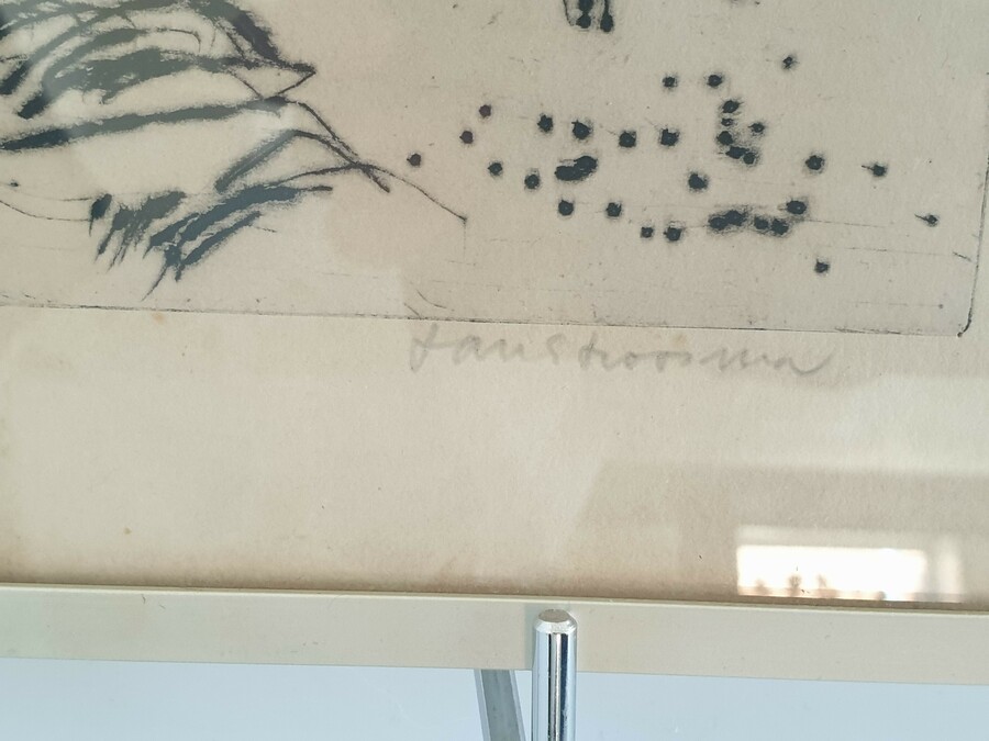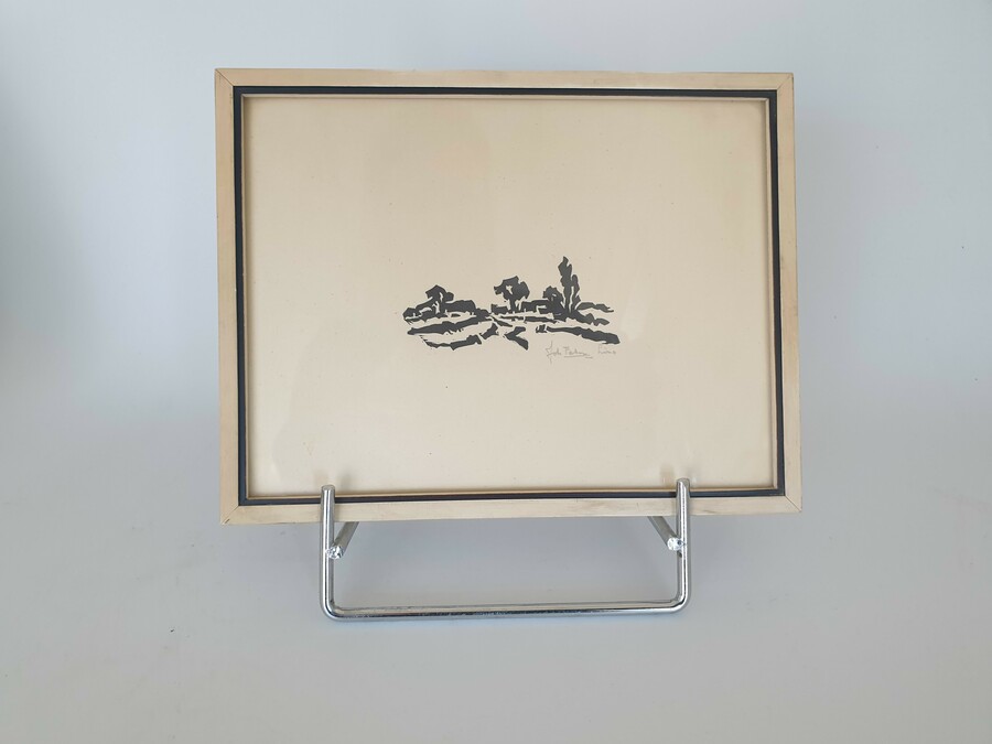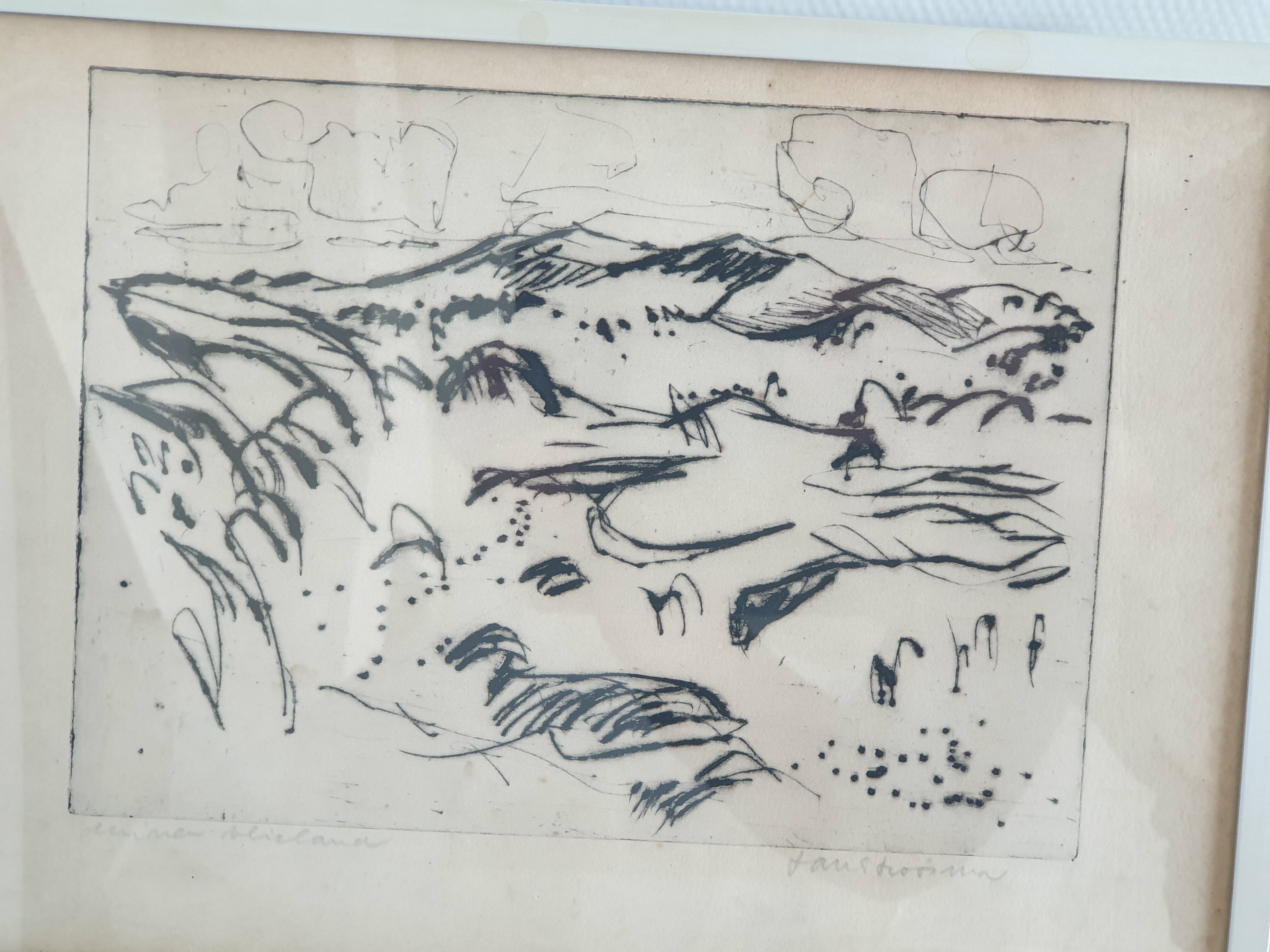 Een linosnede van Johan Faber (1902-1979), Groninger Ploeg en een ets van Jan Stroosma (Leeuwarden, 1928- 1983). Titel "Duinen van Vlieland". Beide kunstwerken met potlood gesigneerd, 20e eeuw. |