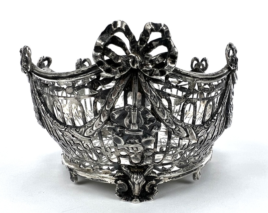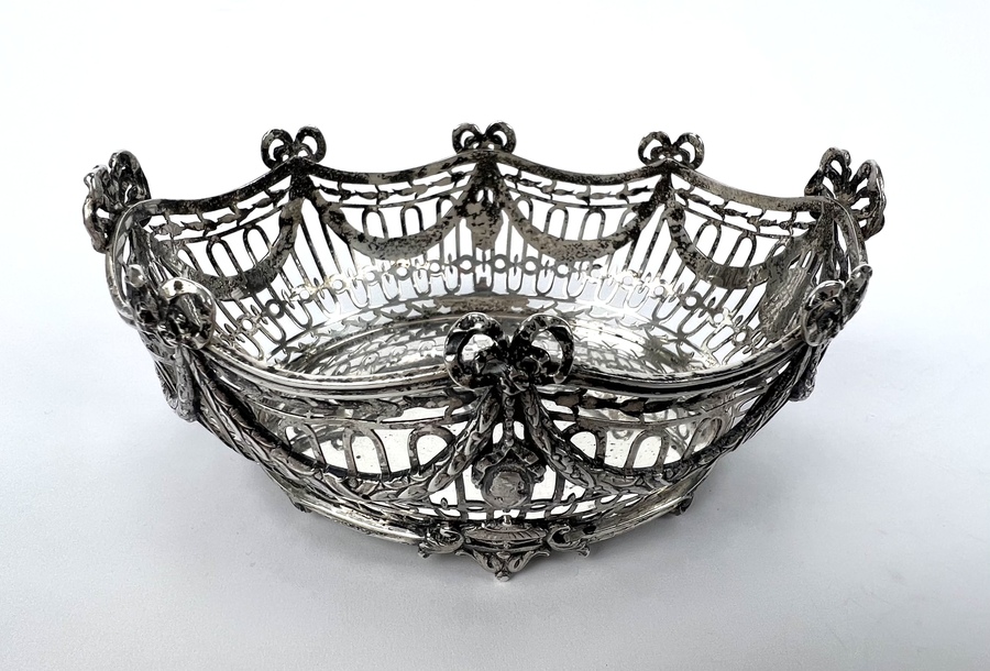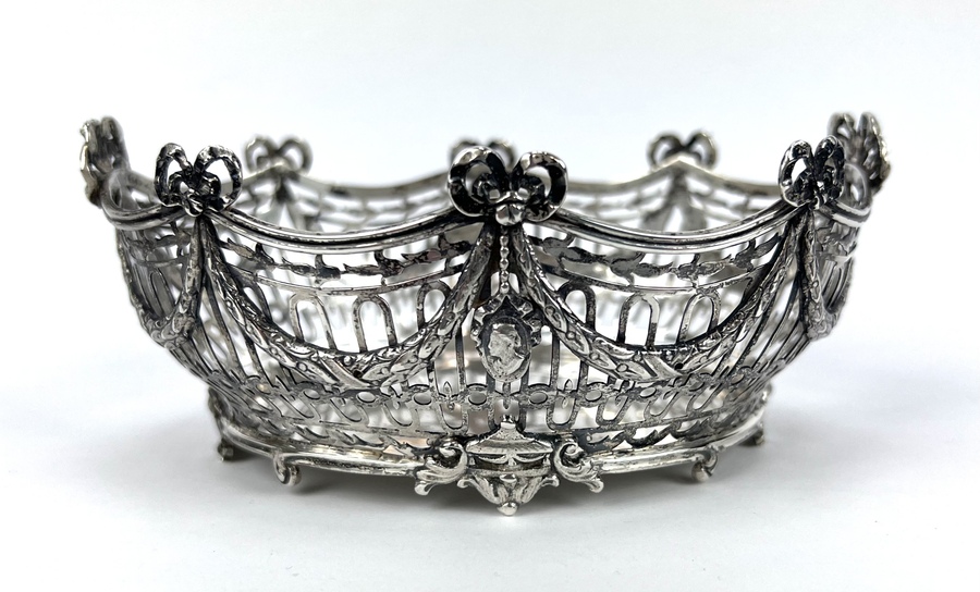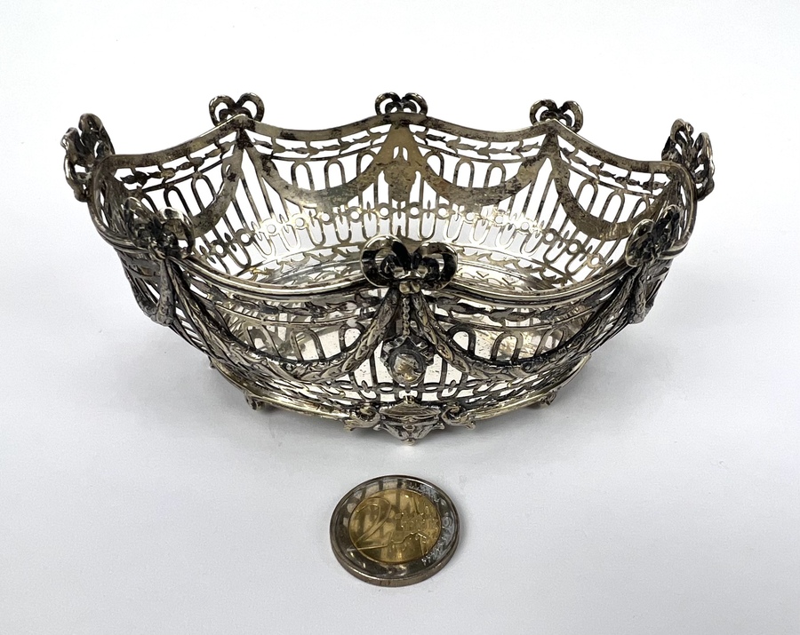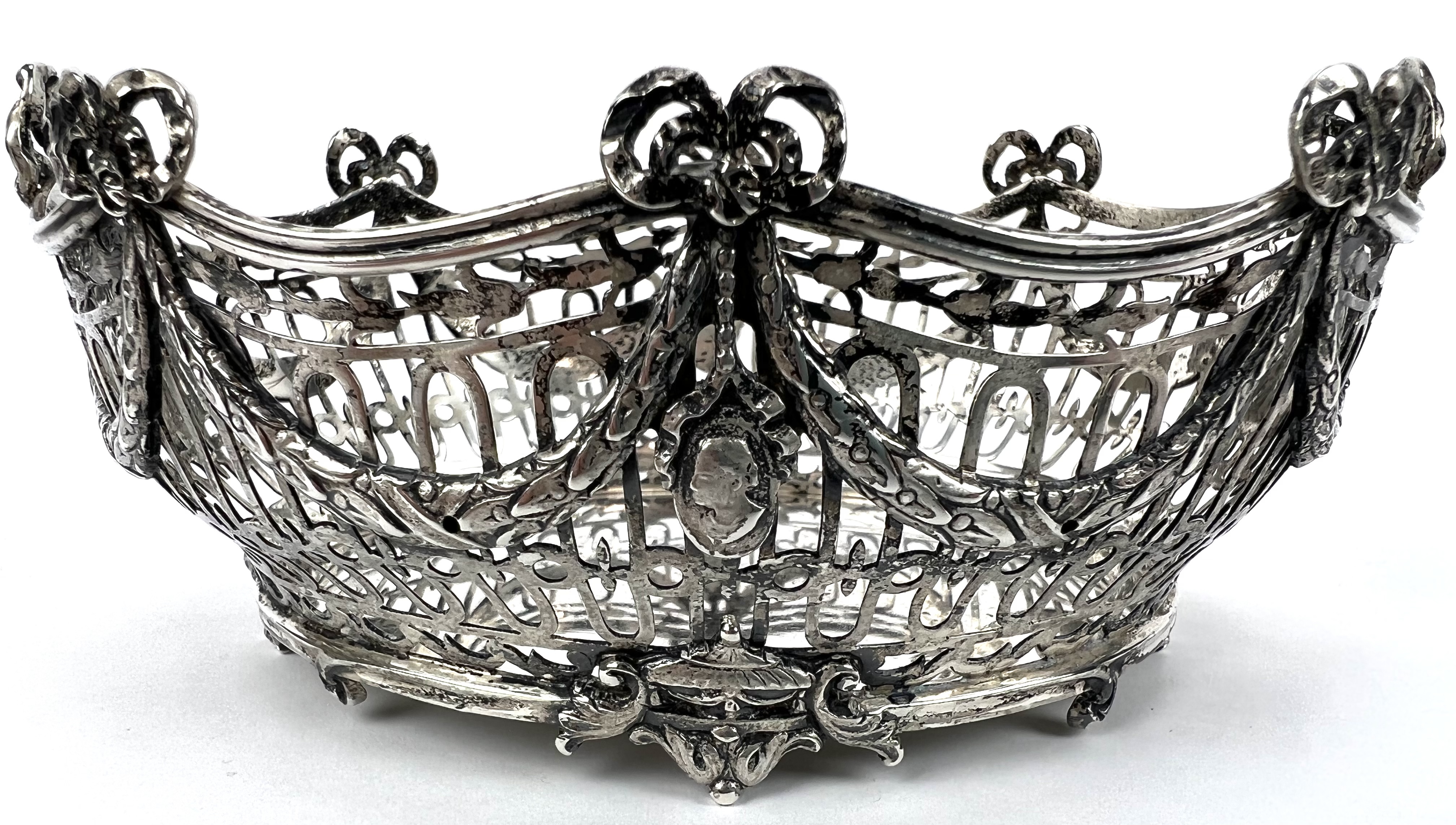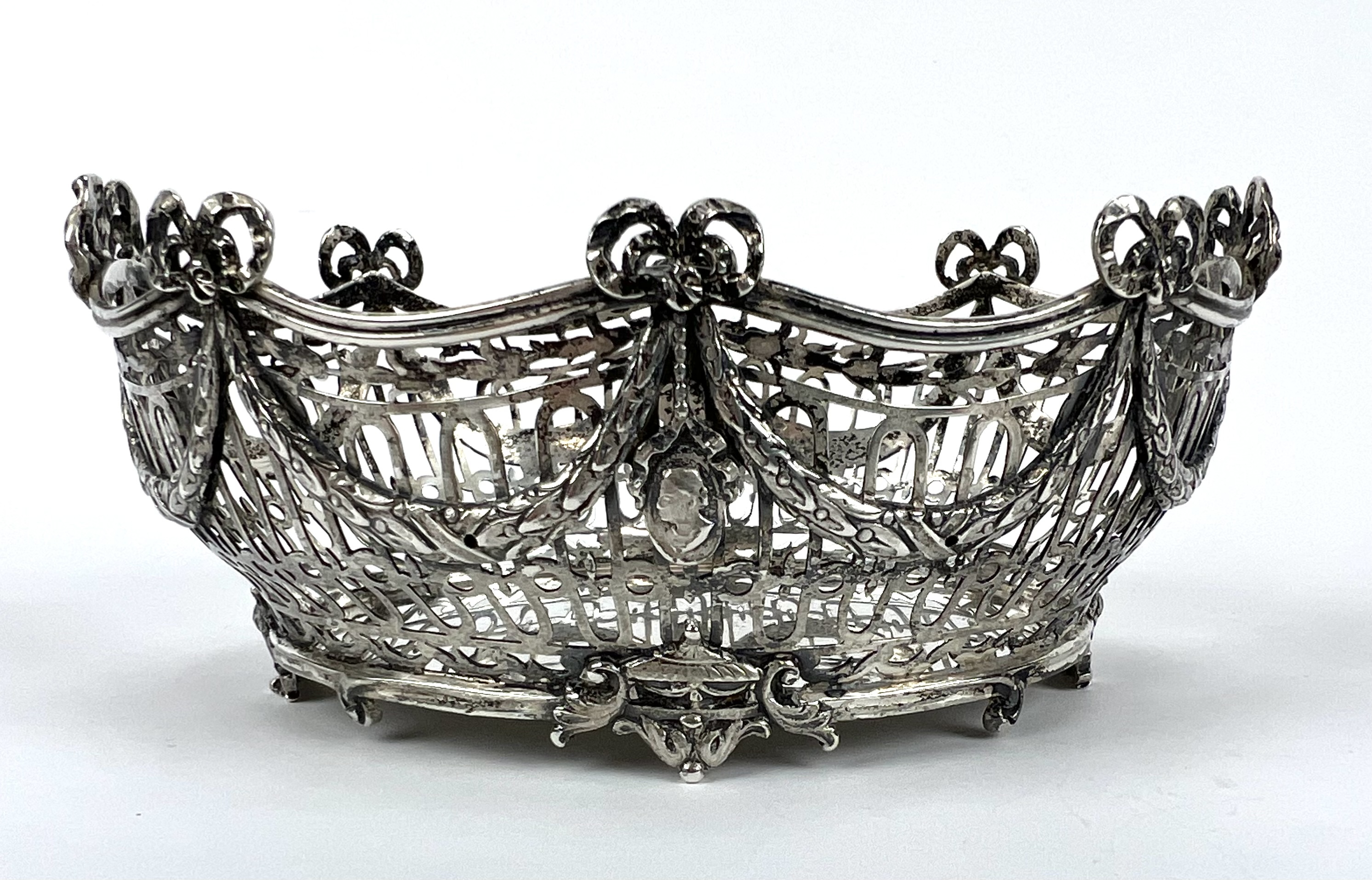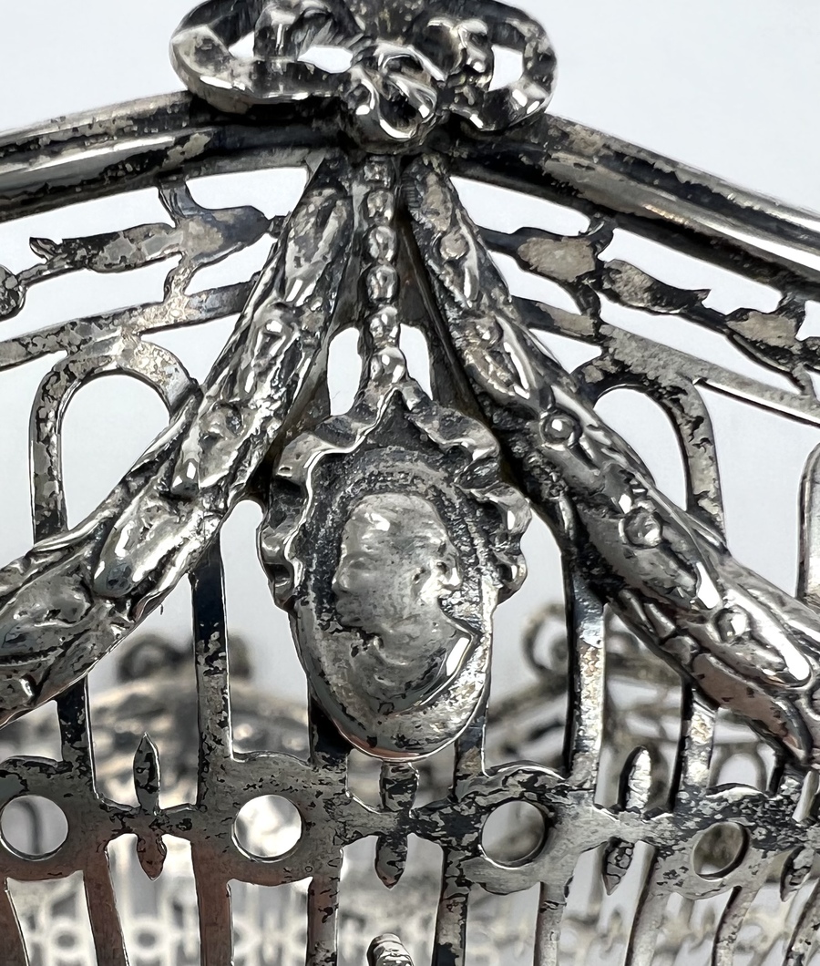 Verzilverde ajour bonbonmandje voorzien van guirlandes en medaillons met portretten. Aan de onderzijde gemerkt lopende leeuw 2 (835/1000) en meesterteken. |
