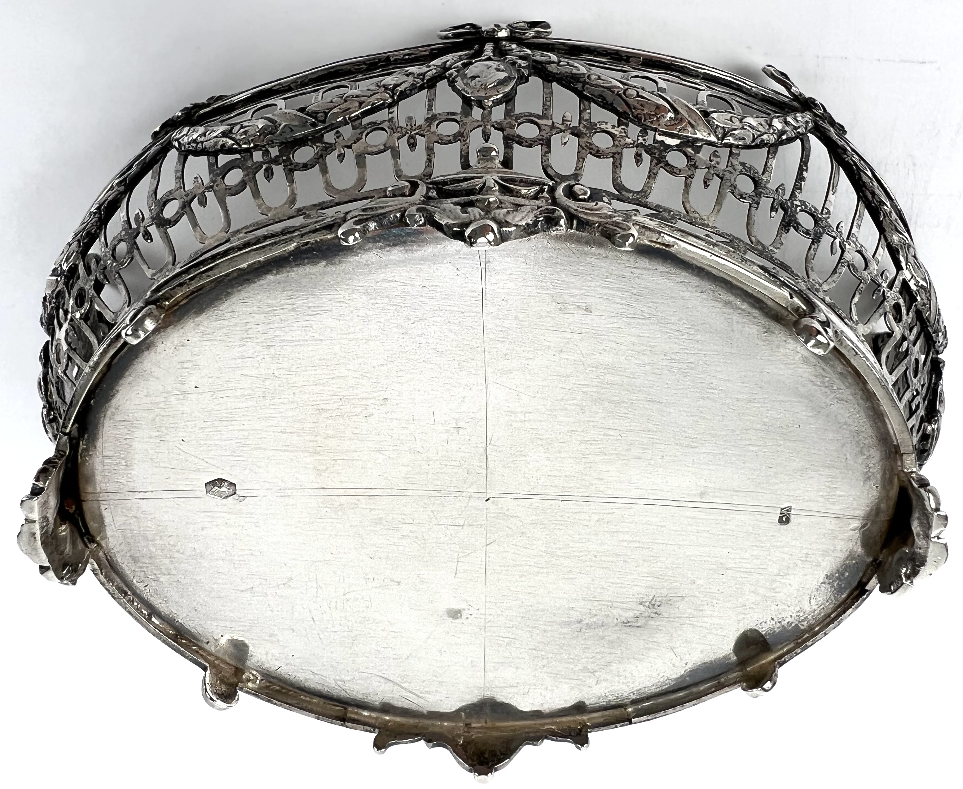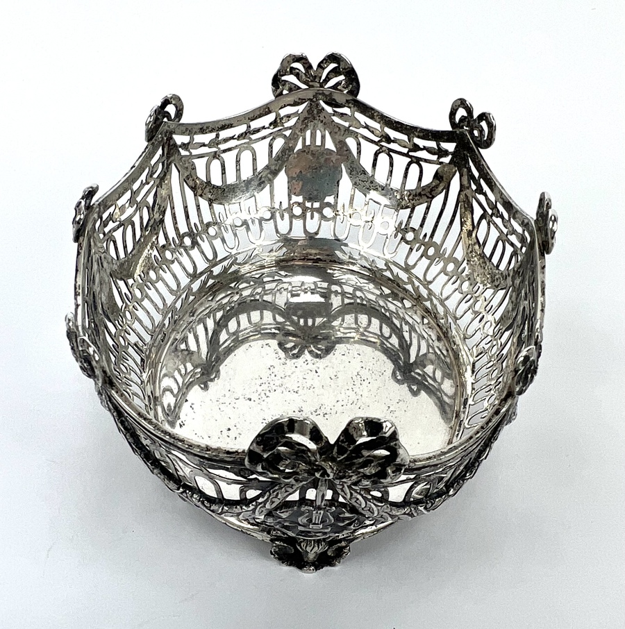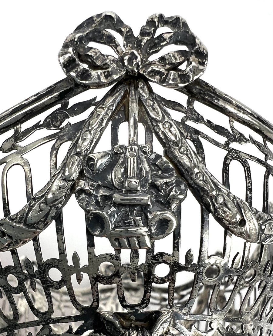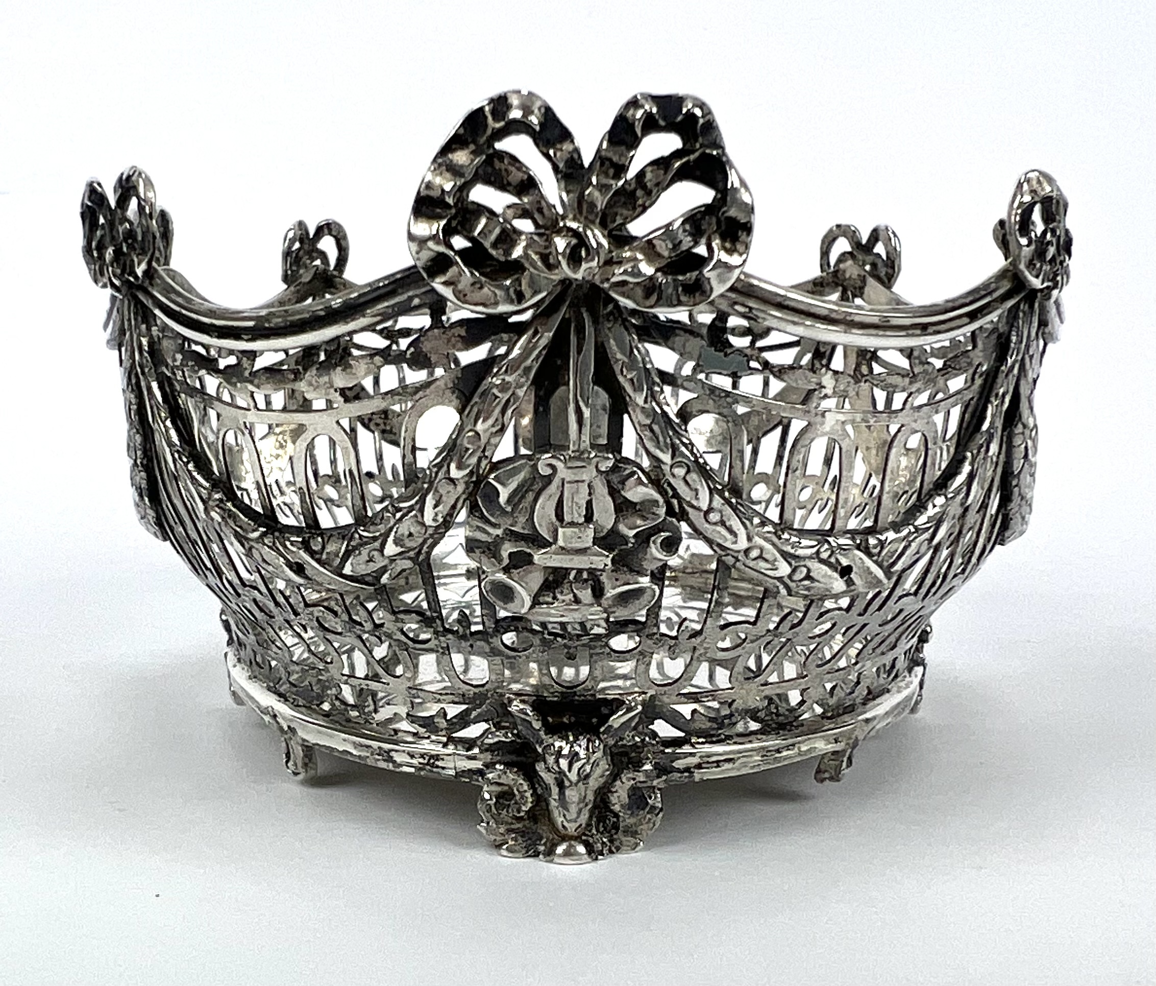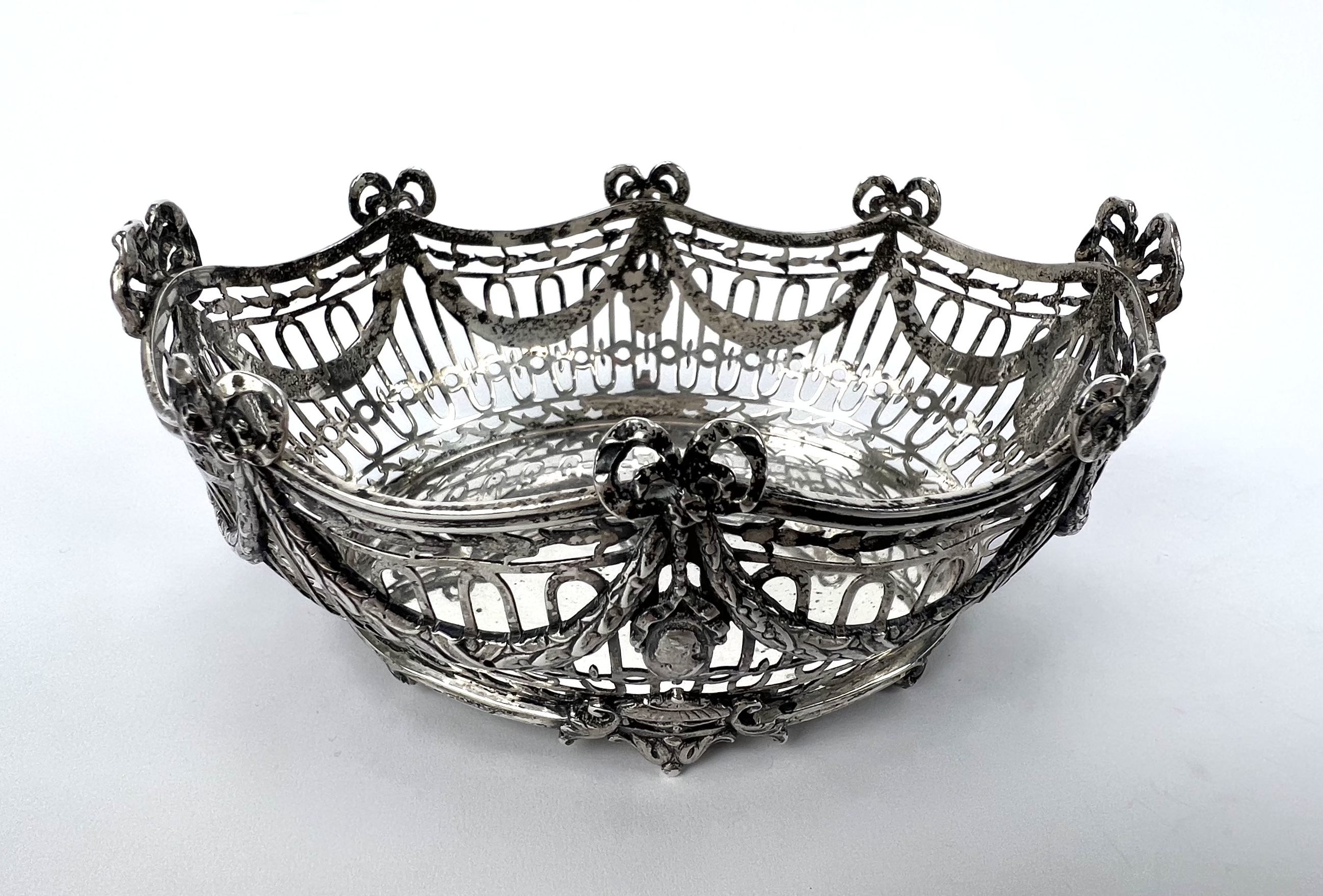 Verzilverde ajour bonbonmandje voorzien van guirlandes en medaillons met portretten. Aan de onderzijde gemerkt lopende leeuw 2 (835/1000) en meesterteken. |