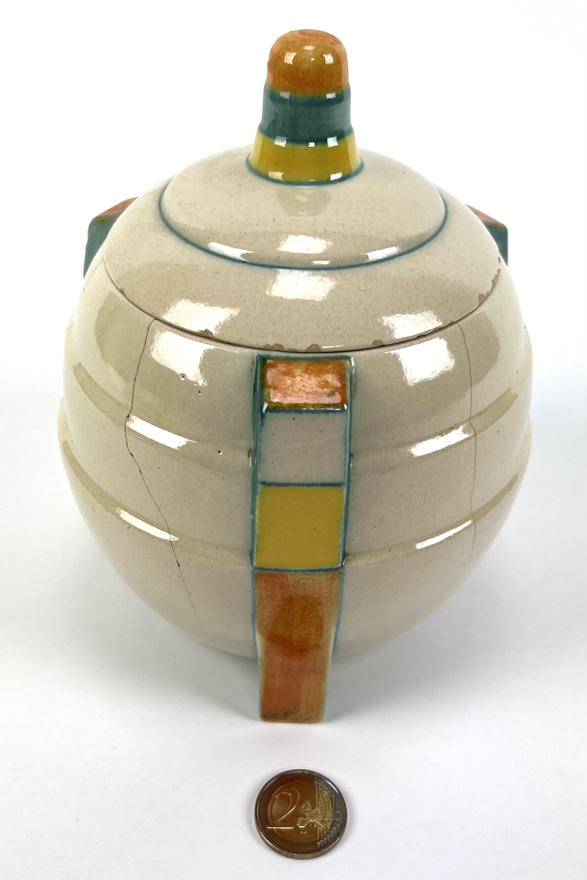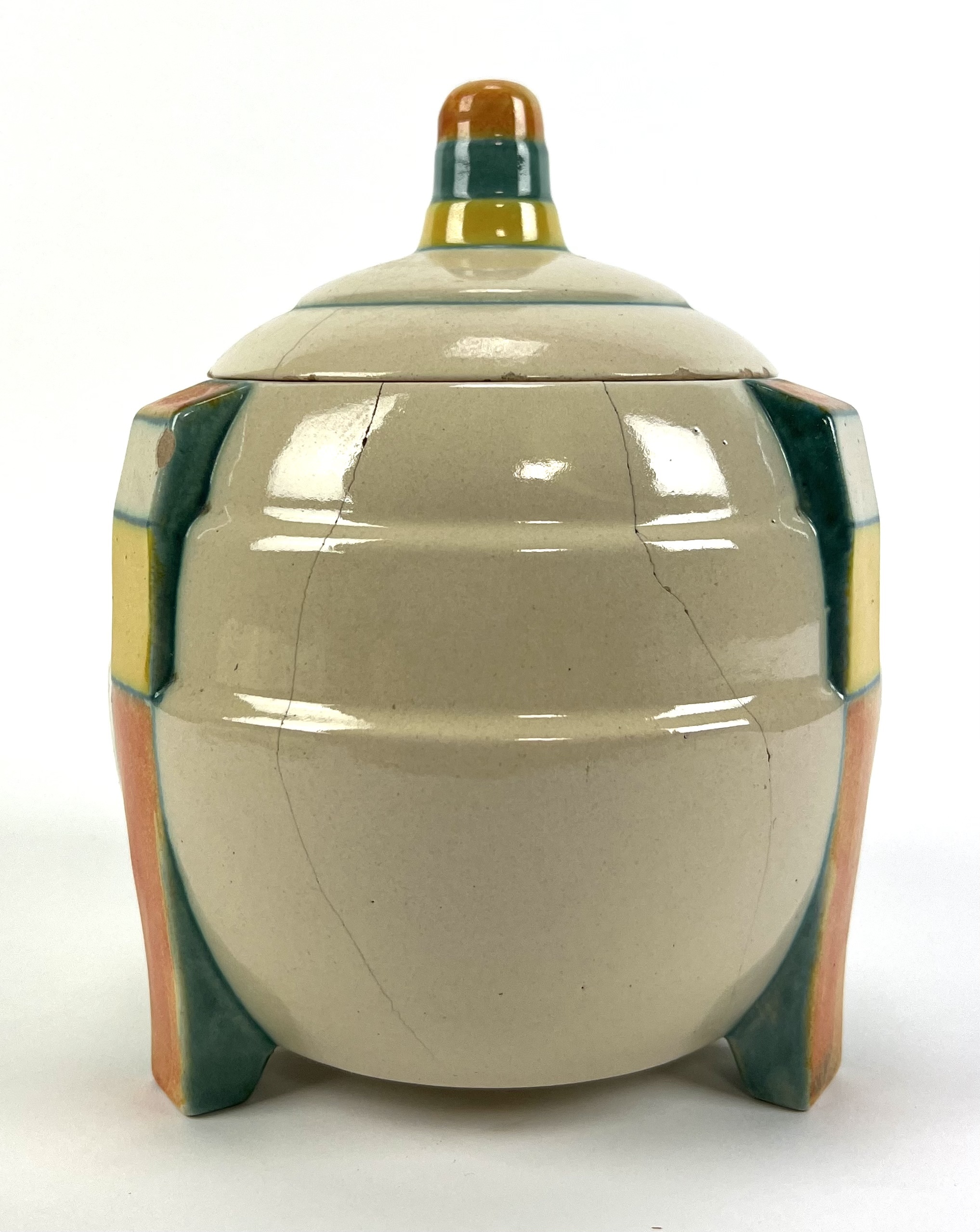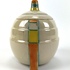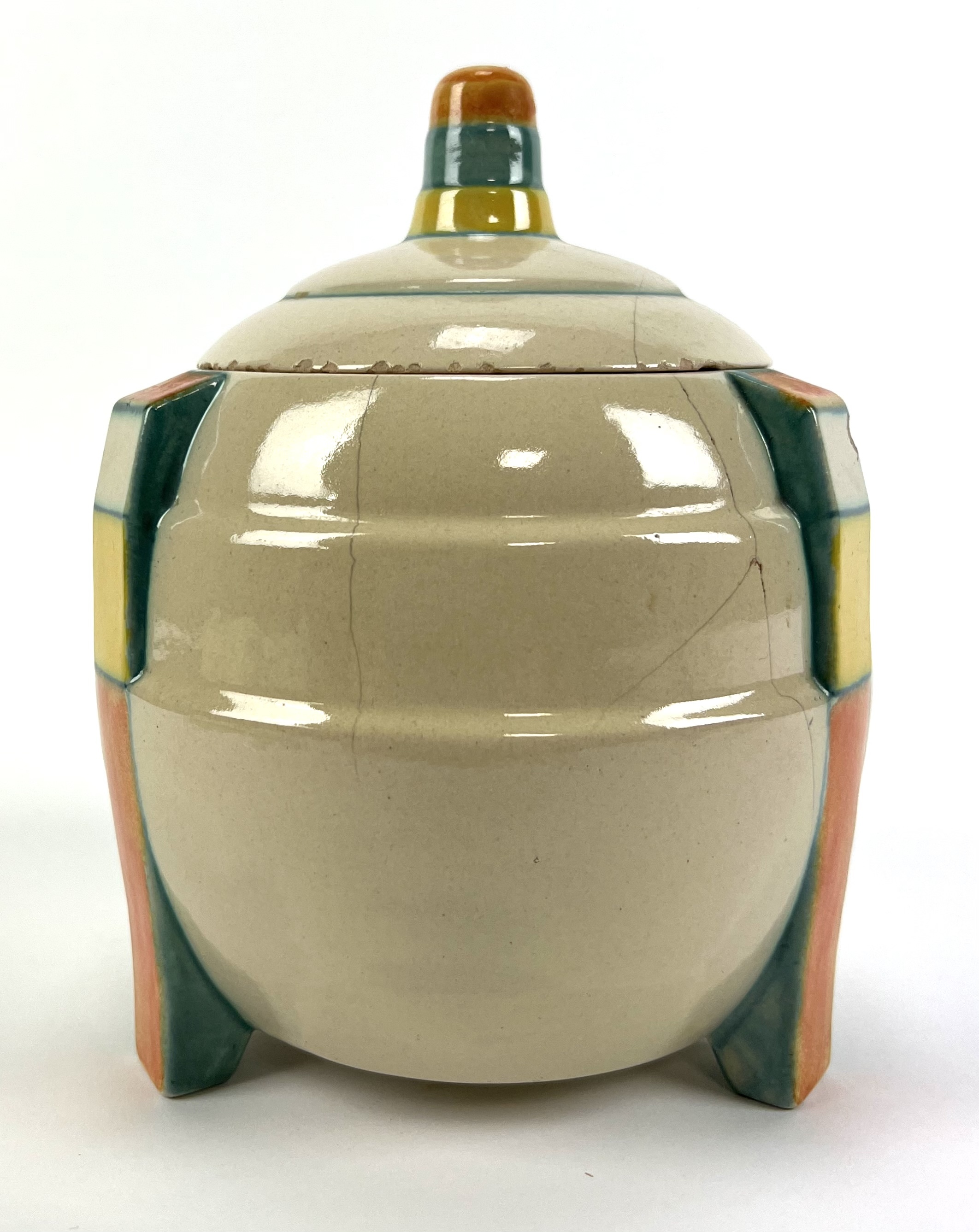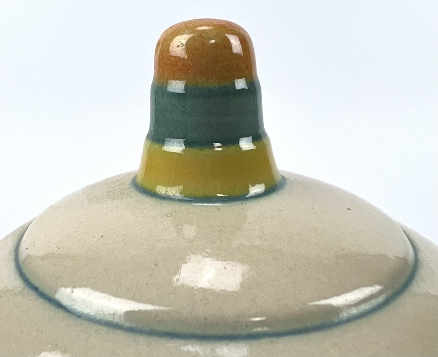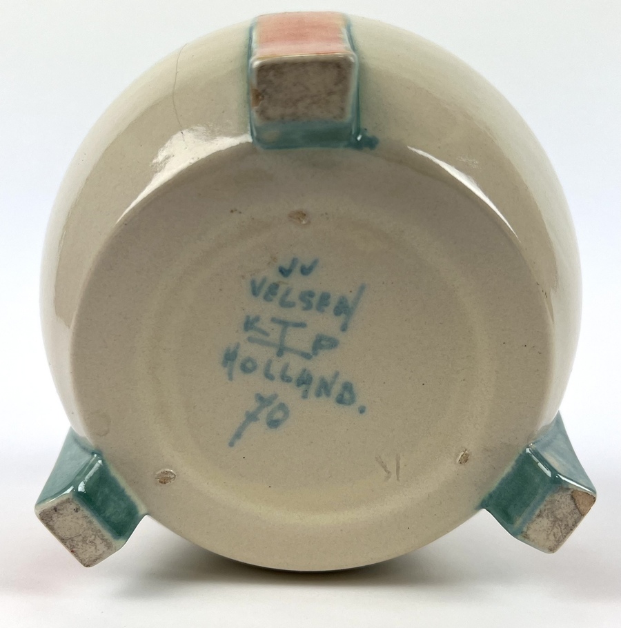 Aardewerken dekselpot van Potterie Kennemerland, Velsen, ontwerp E. Snel. Aan de onderzijde gemerkt met KTP Velsen, Holland. Modelnummer 70. VV, schilder J.G. van Vliet. Gefabriceerd tussen 1929-1932. |