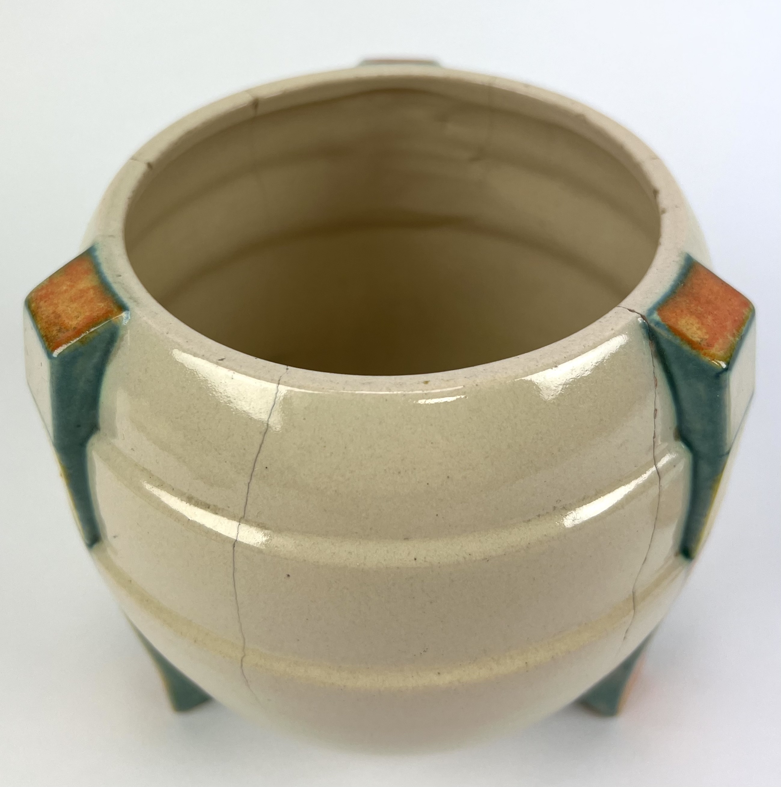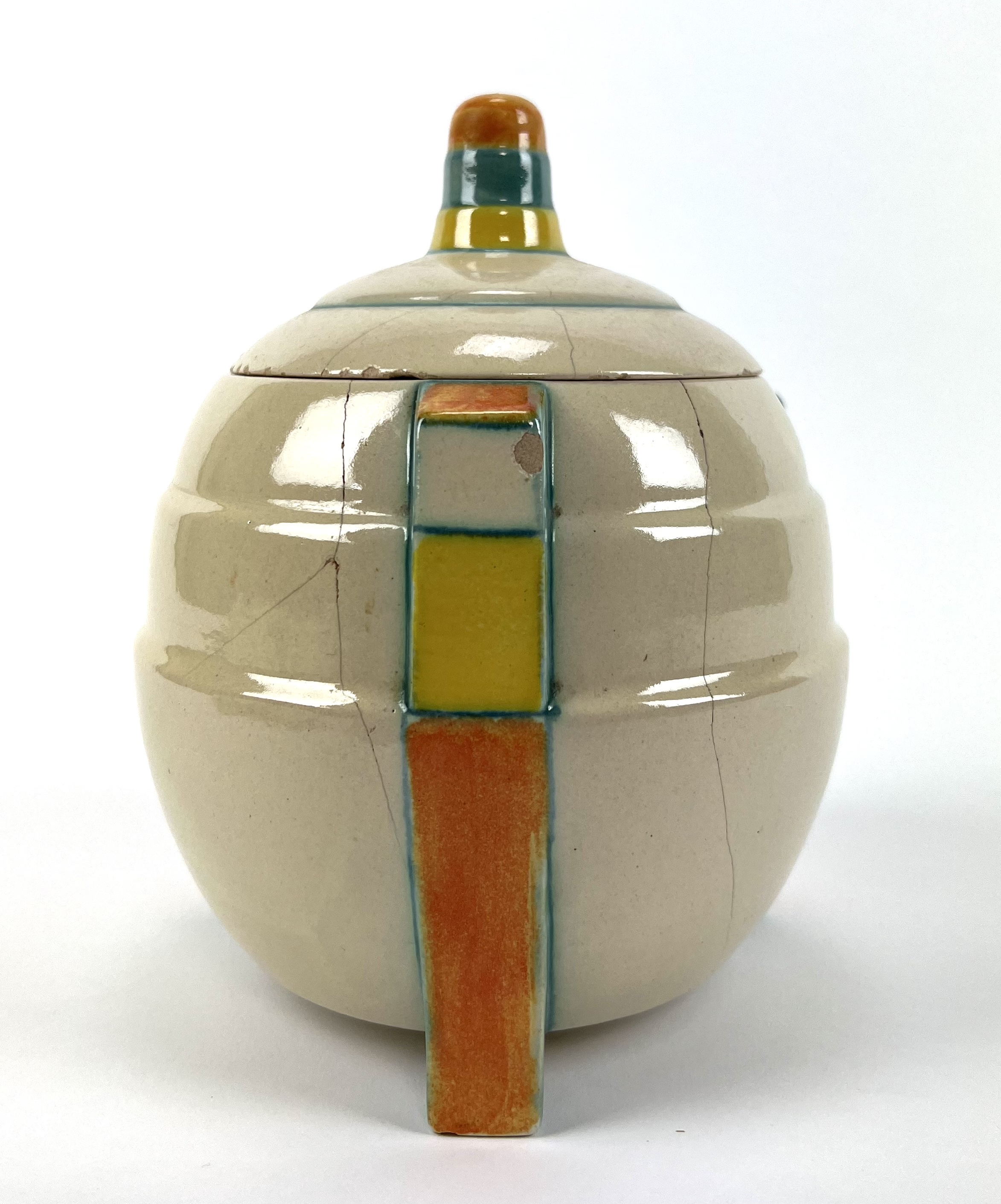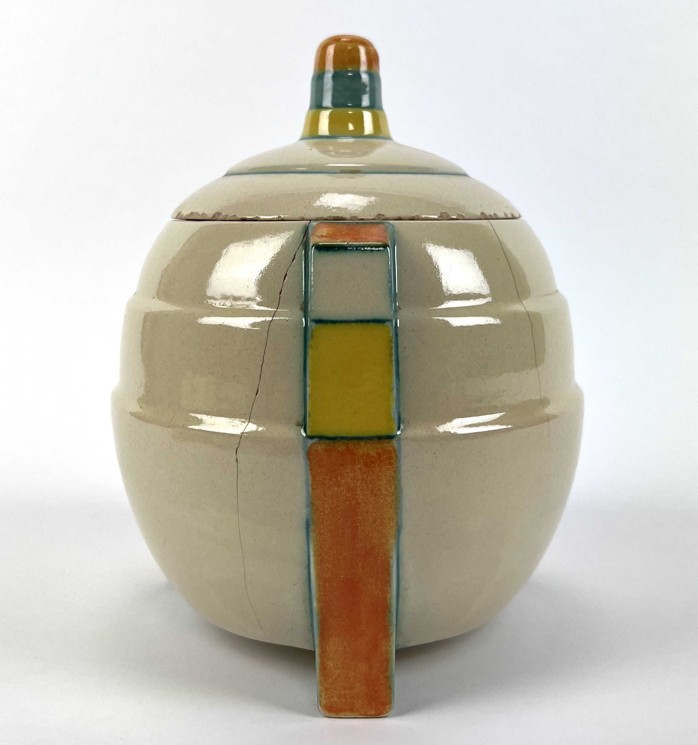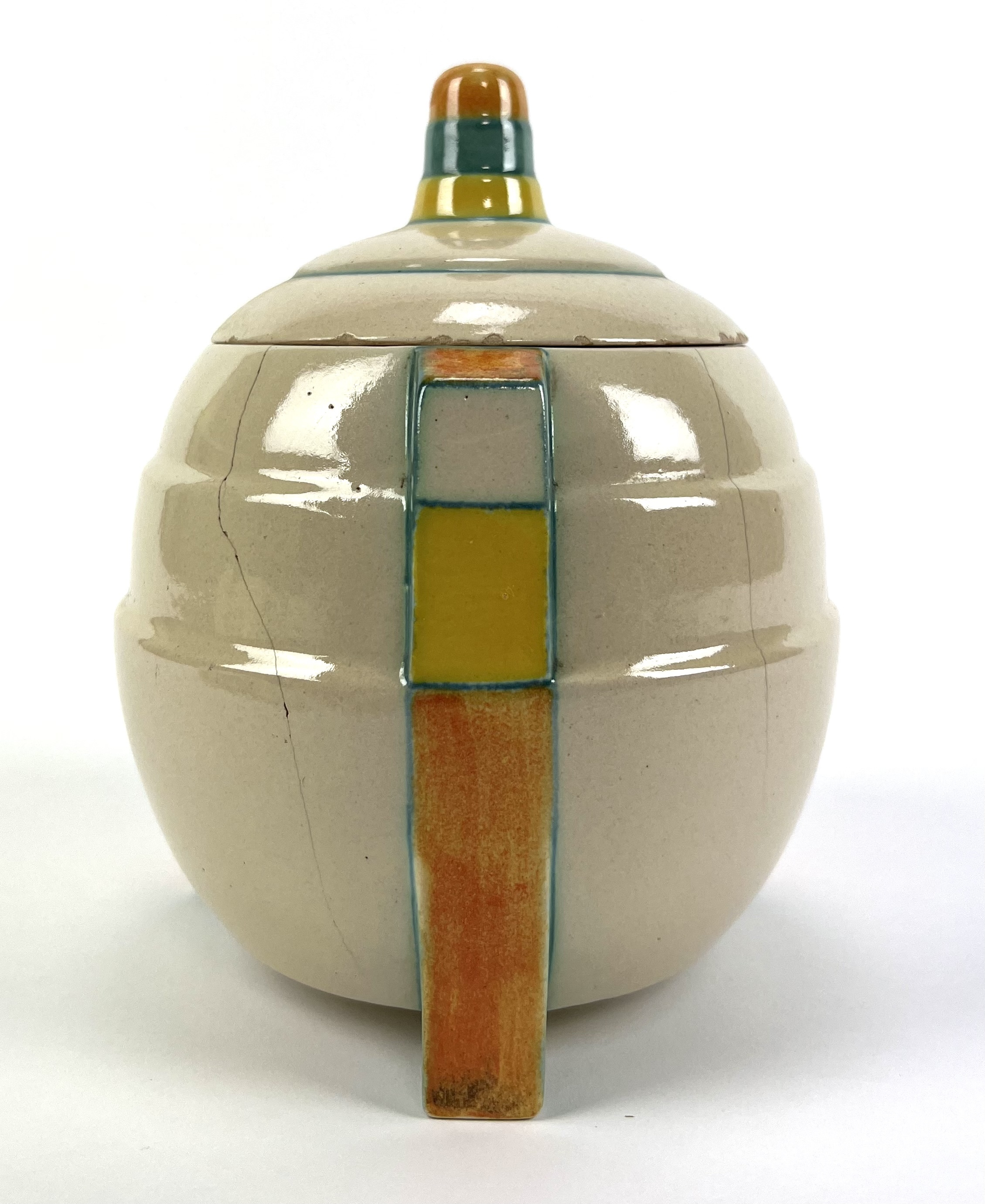 Aardewerken dekselpot van Potterie Kennemerland, Velsen, ontwerp E. Snel. Aan de onderzijde gemerkt met KTP Velsen, Holland. Modelnummer 70. VV, schilder J.G. van Vliet. Gefabriceerd tussen 1929-1932. |