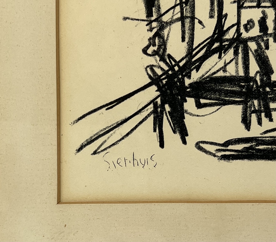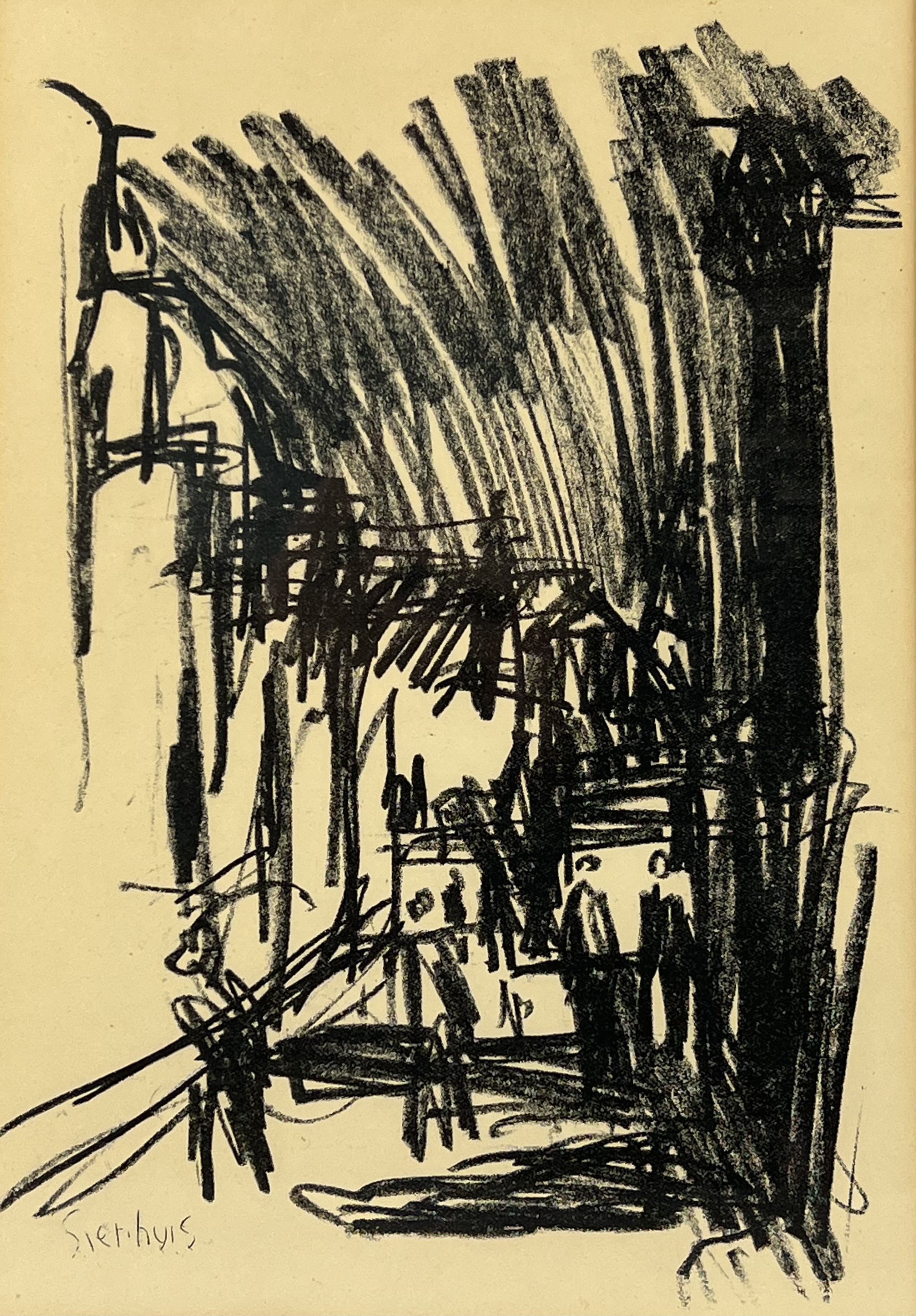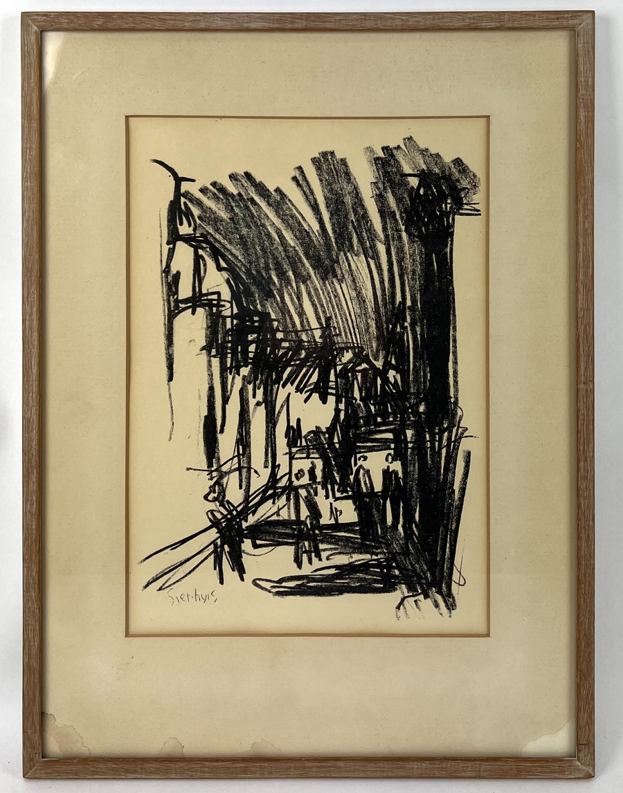 Tekening van straatscène met personen. Linksonder gesigneerd met potlood Sierhuis, tweede helft 20e eeuw. |
