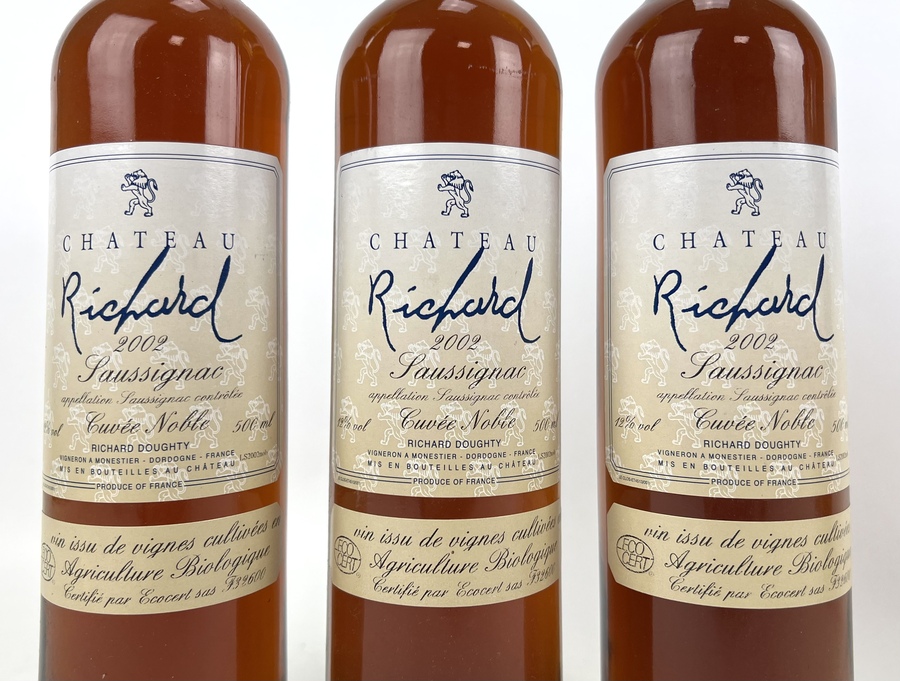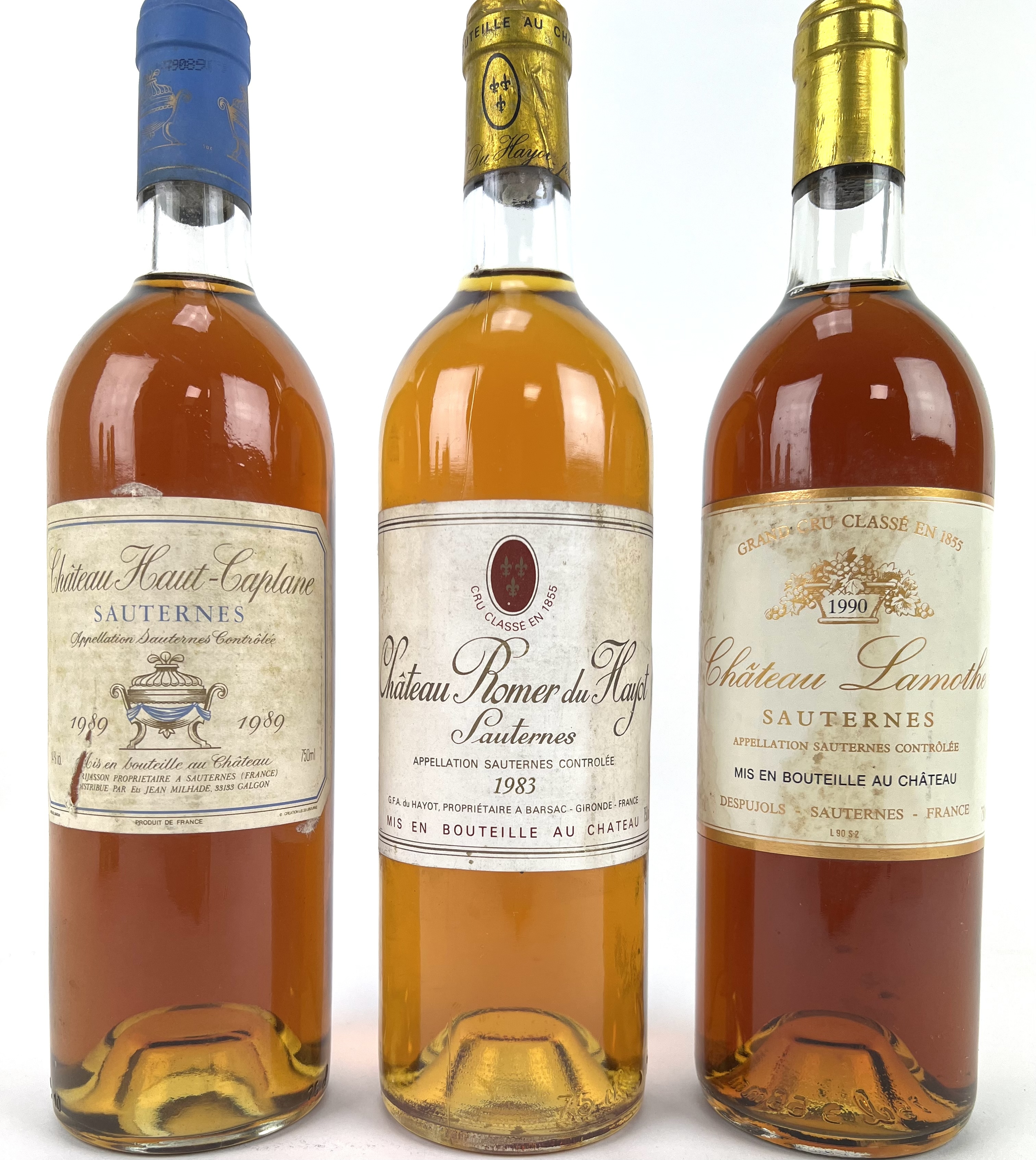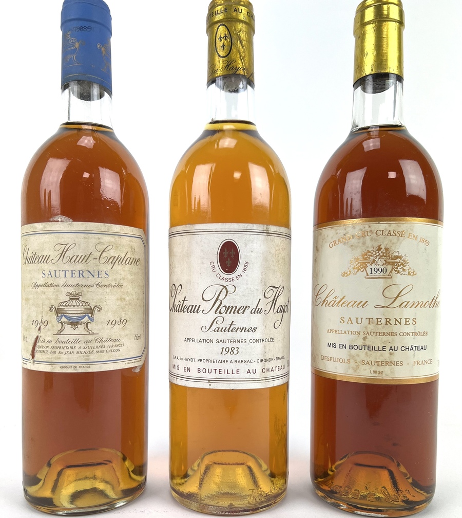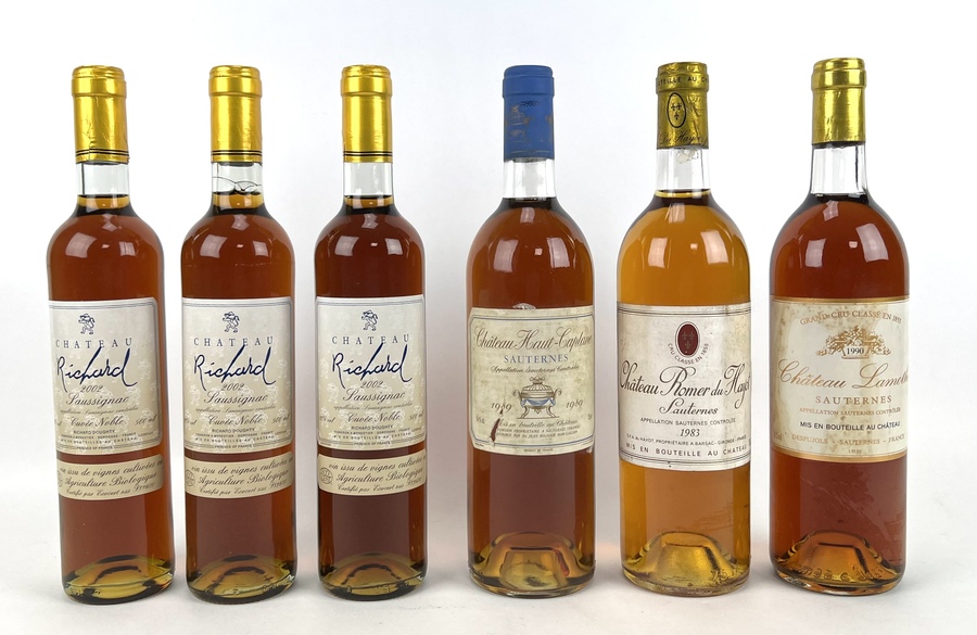 Drie flessen Château Richard 2002 en drie flessen Sauternes witte wijn bestaande uit Château Haut-Caplane 1989, een Sauternes witte wijn van Château Romer du Hajot uit 1983 en Sauternes witte wijn Château Lamothe uit 1990. |