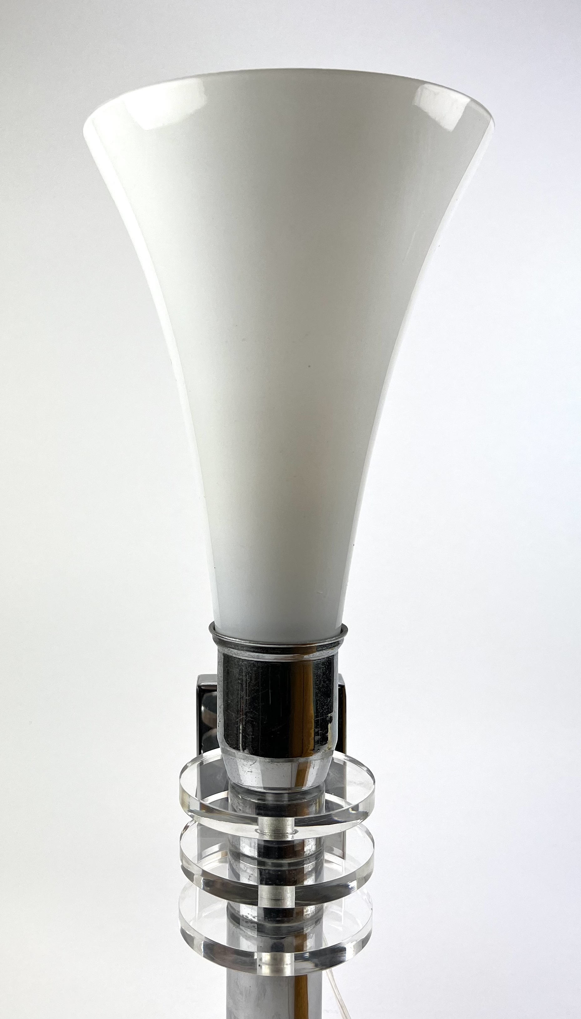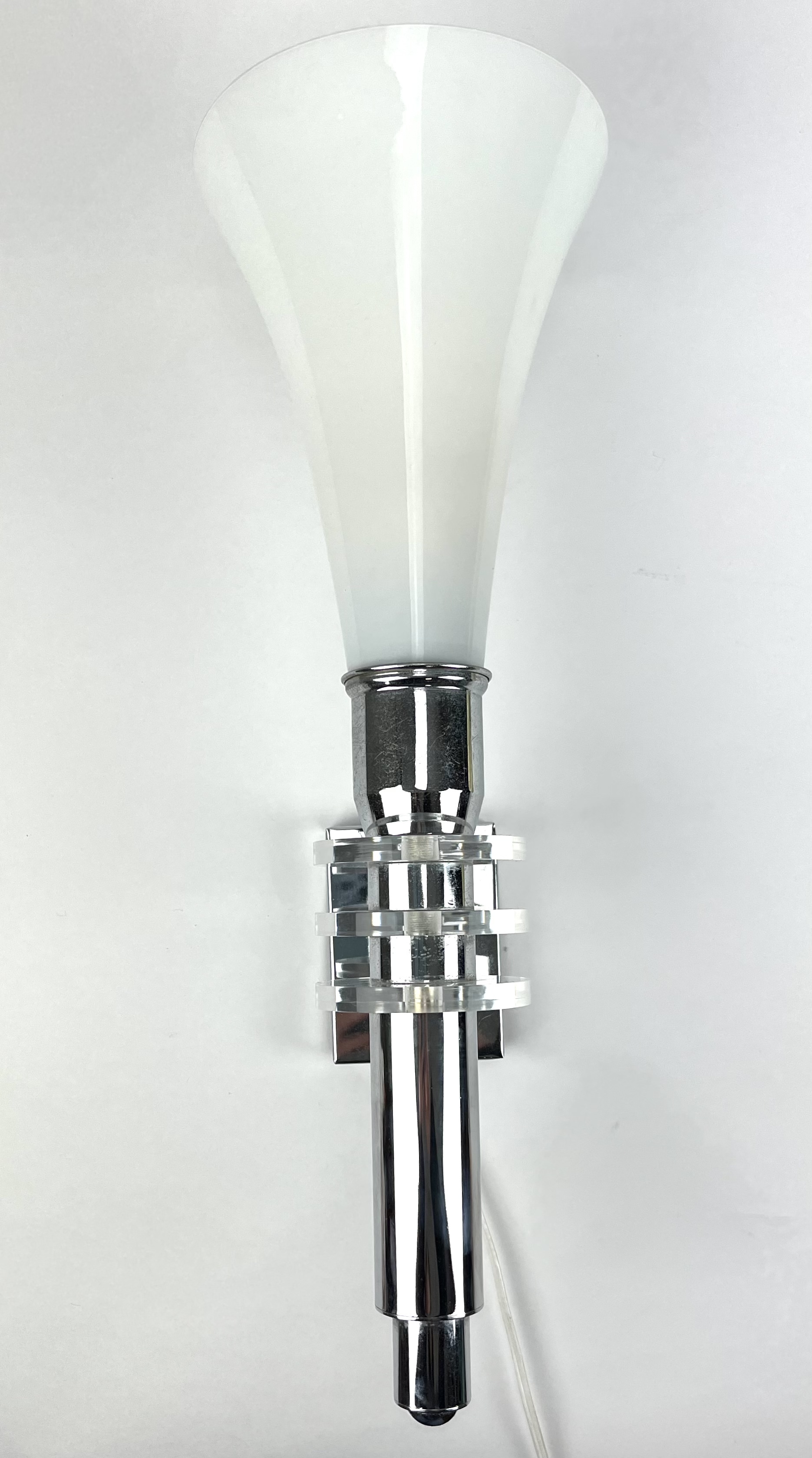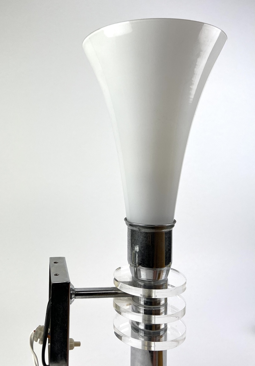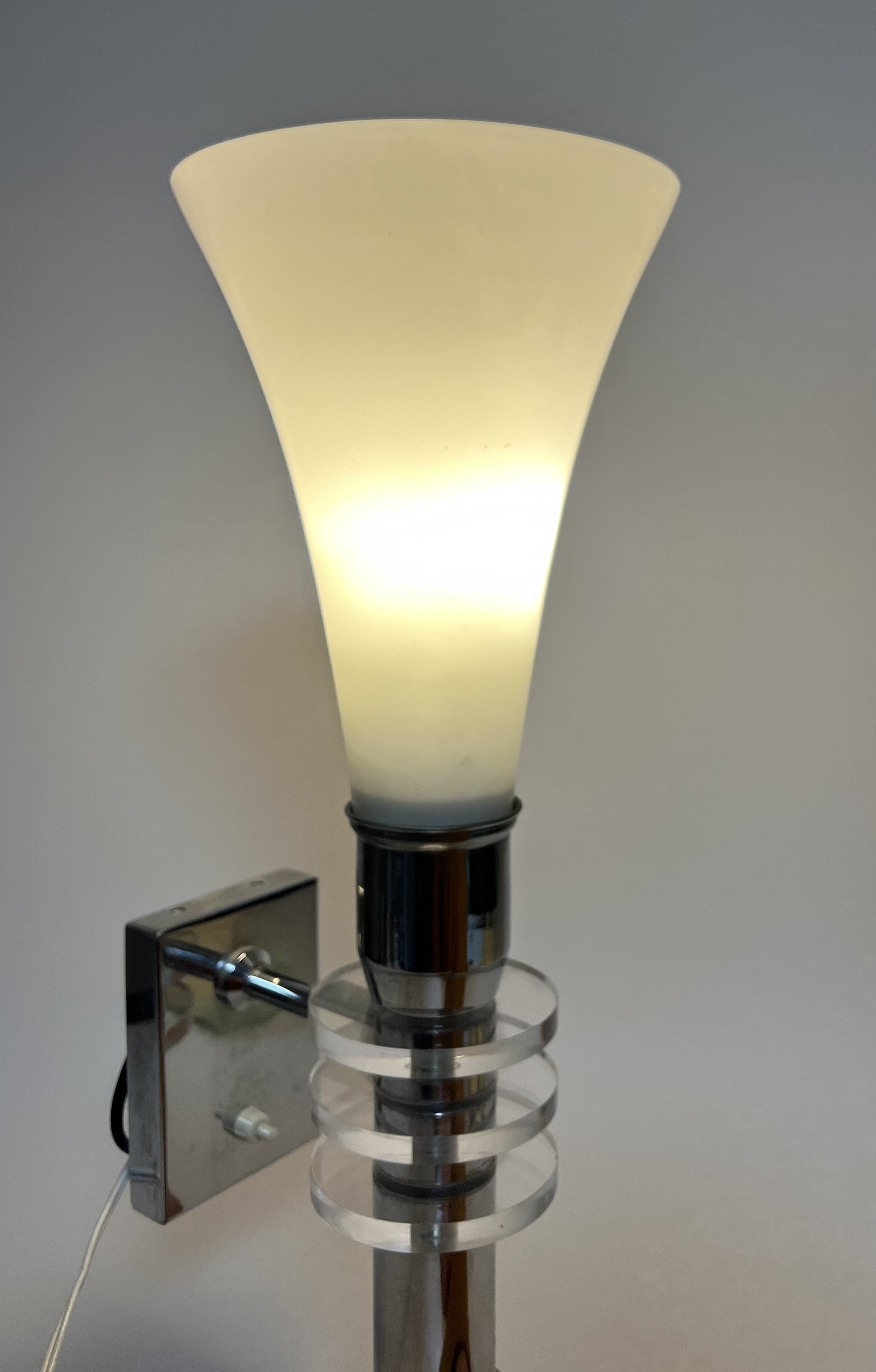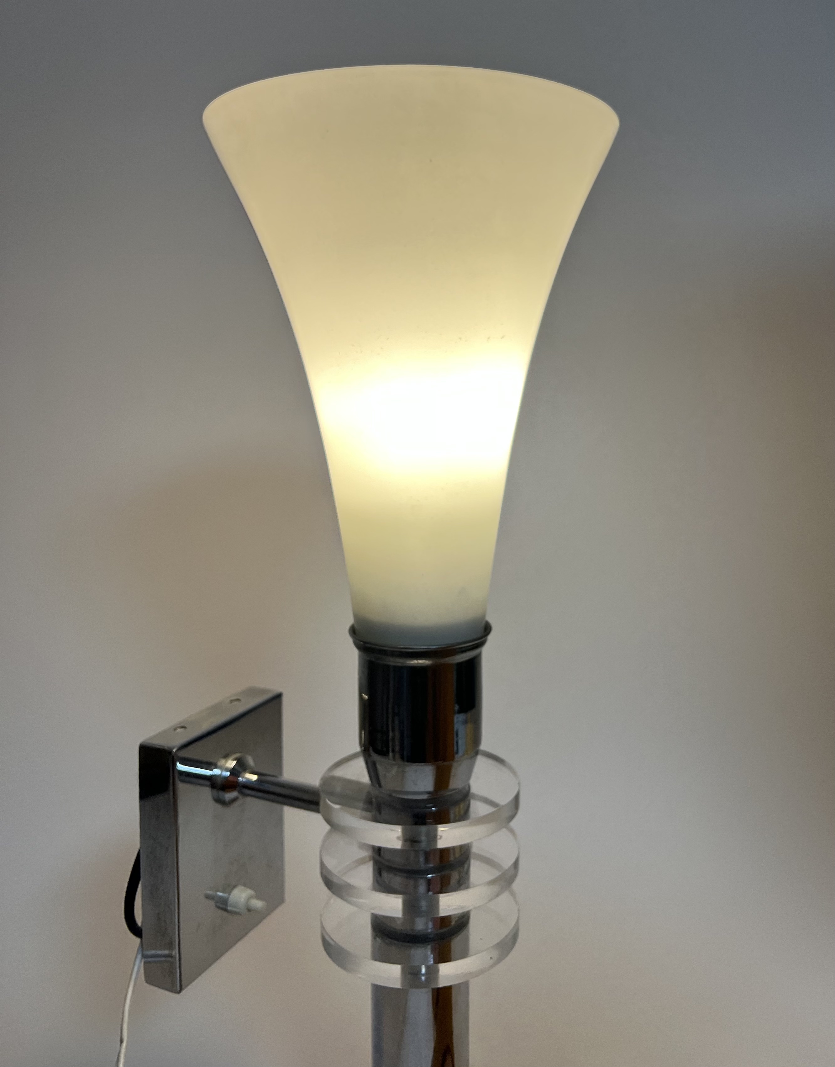 Design chromen wandlamp met melkglazen kap en glazen tussenliggende schijven, 21e eeuw. |