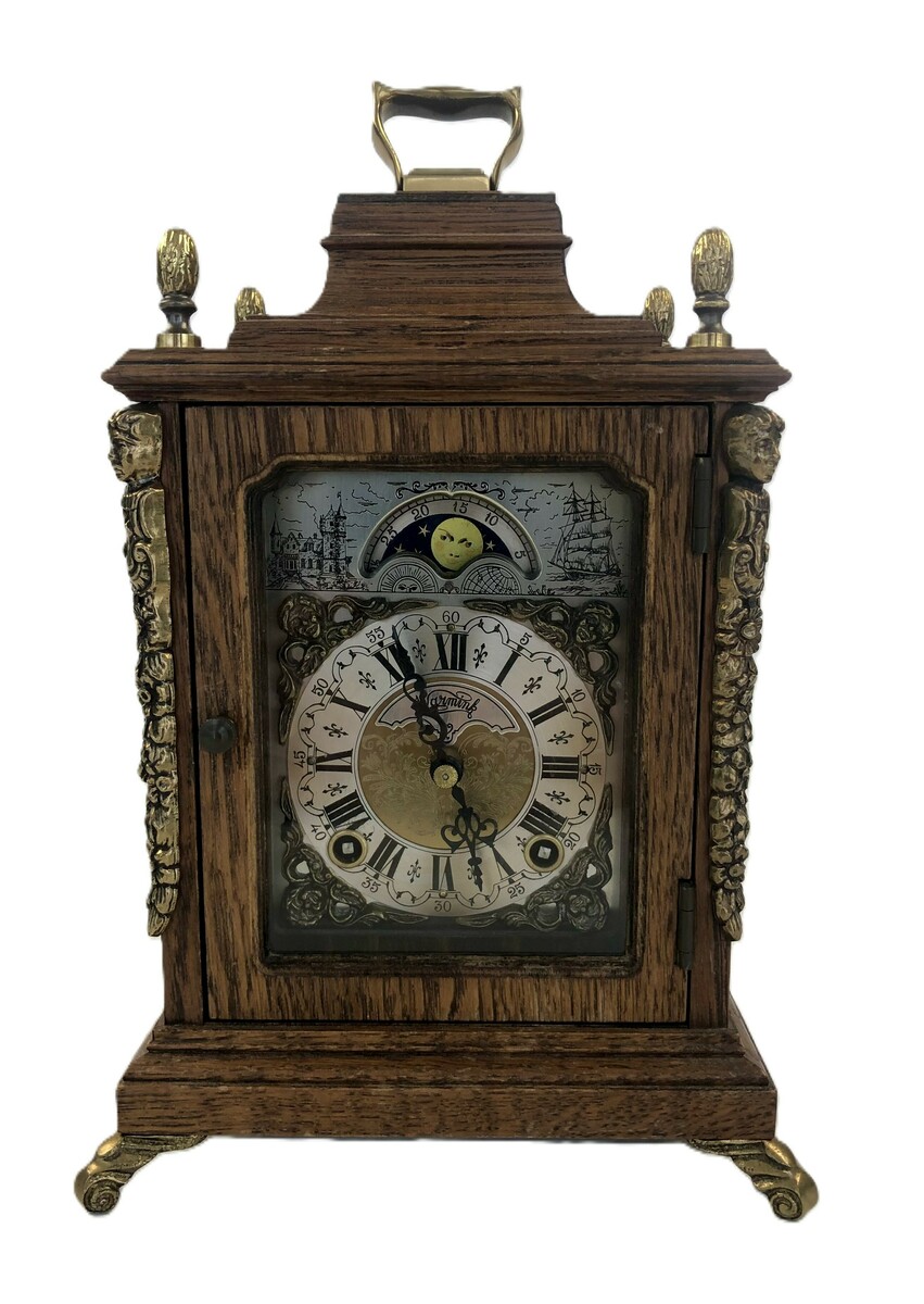 Tafelklok van Wuba/Warmink Uurwerken, Almelo met binnenwerk gemerkt Wuba en wijzerplaat midden gesigneerd Warmink, jaren 60. Eikenhouten kast op messing poten met handgreep, caryatide-hoekornamenten en geperforeerde zijroosters met groen doek. Mechanisch veer aangedreven uurwerk met ankergang en slagwerk op bel, Romeinse cijfers, twee opwindgaten en maanstandboog; Nederlands historiserende bracket-stijl. Glazen deur met messing knopje, laterale scharnieren en decorgravures rond het centrum.