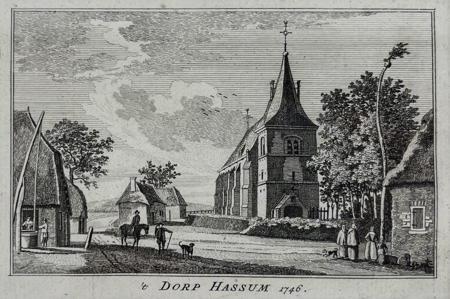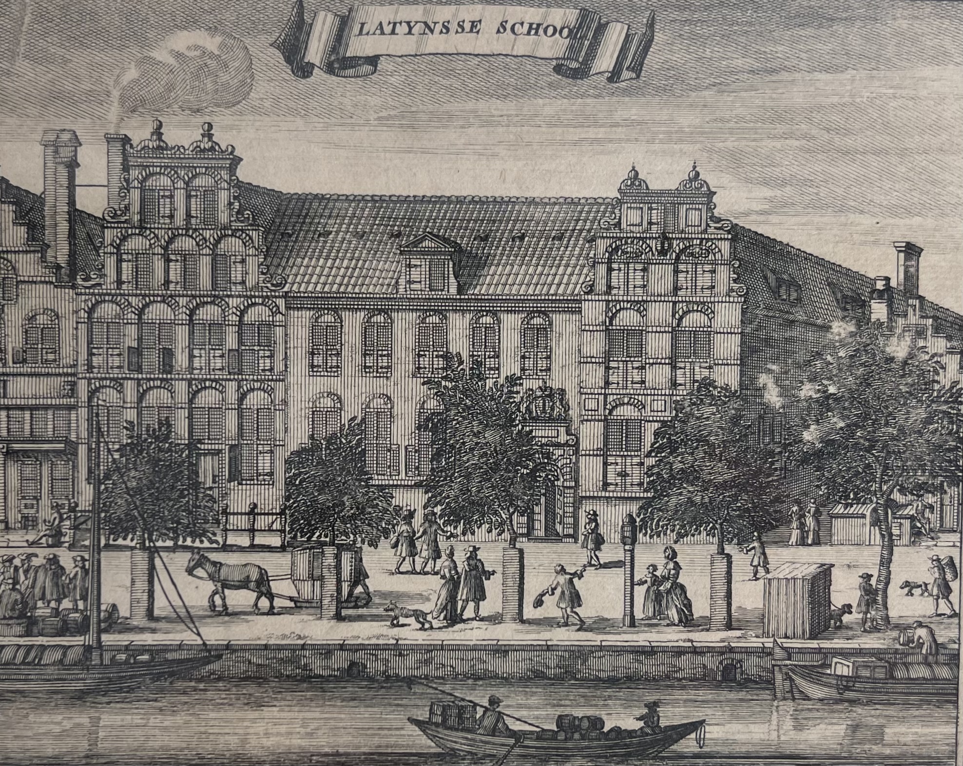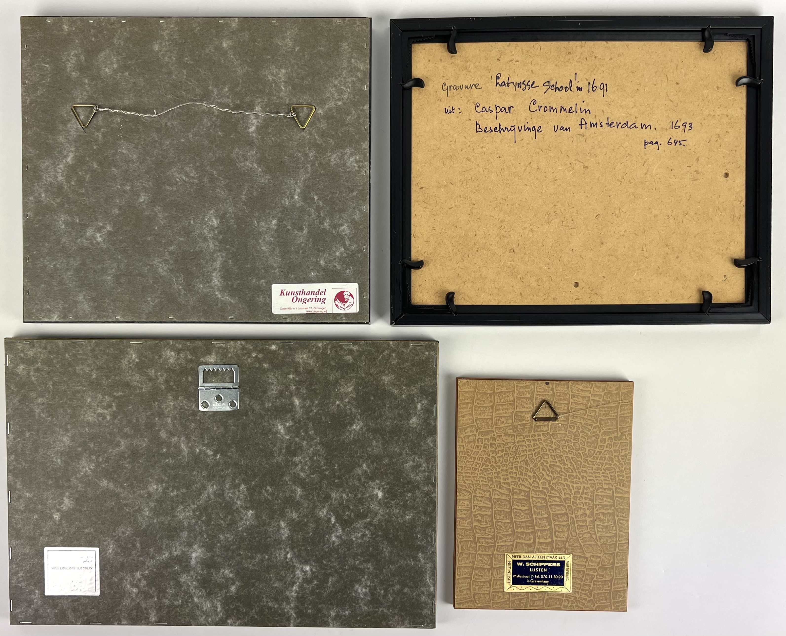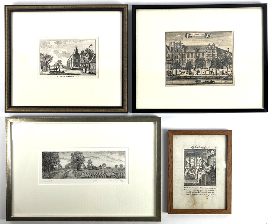 Lot met een ets van Wim van der Meij en drie gravures van Dorp Hassum, Westfalen 1746, Lattynse School aan het Singel, Amsterdam en Schoolmeesters. 18e-20e eeuw. |