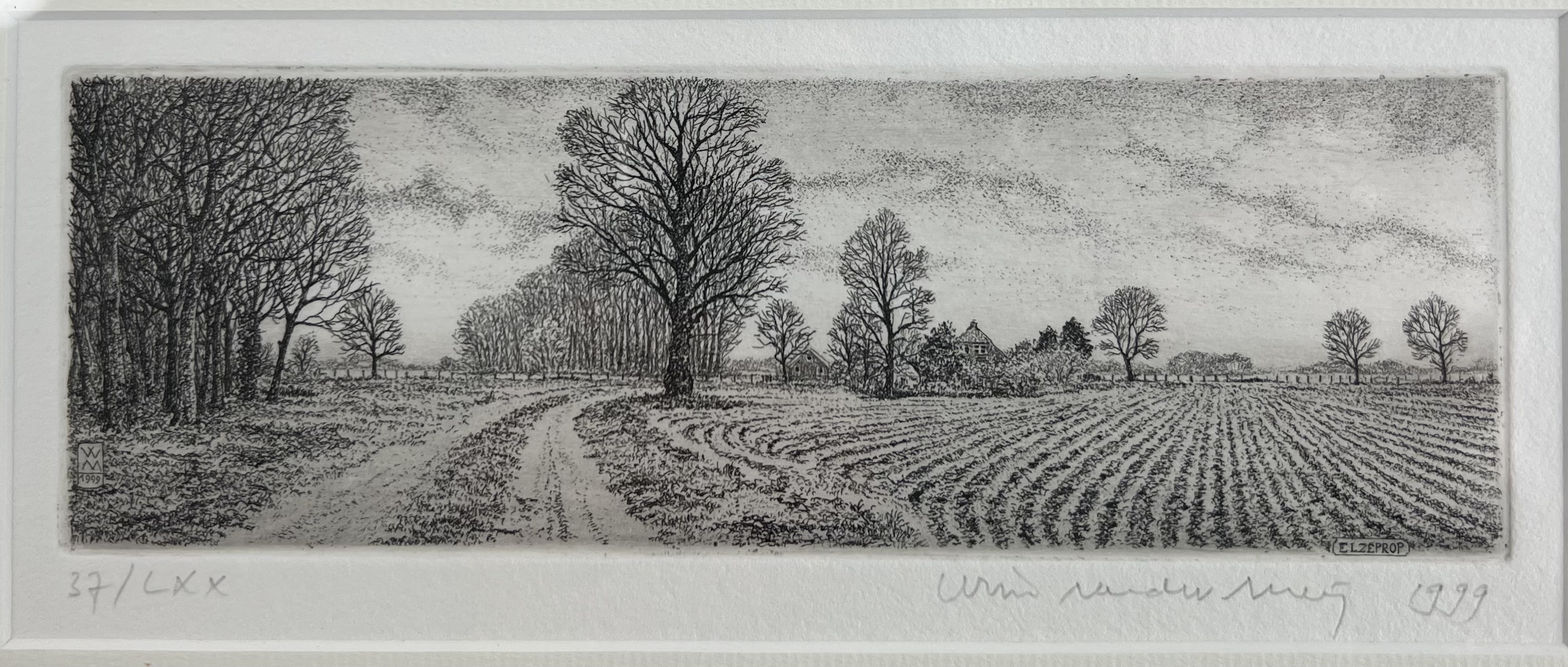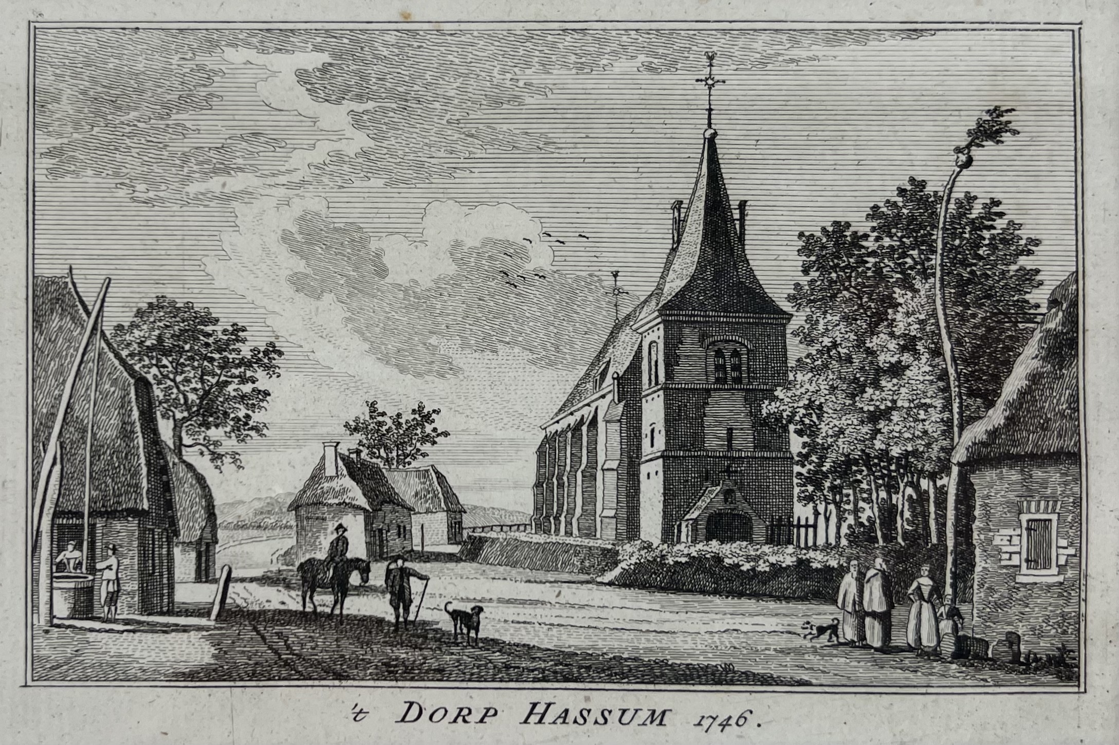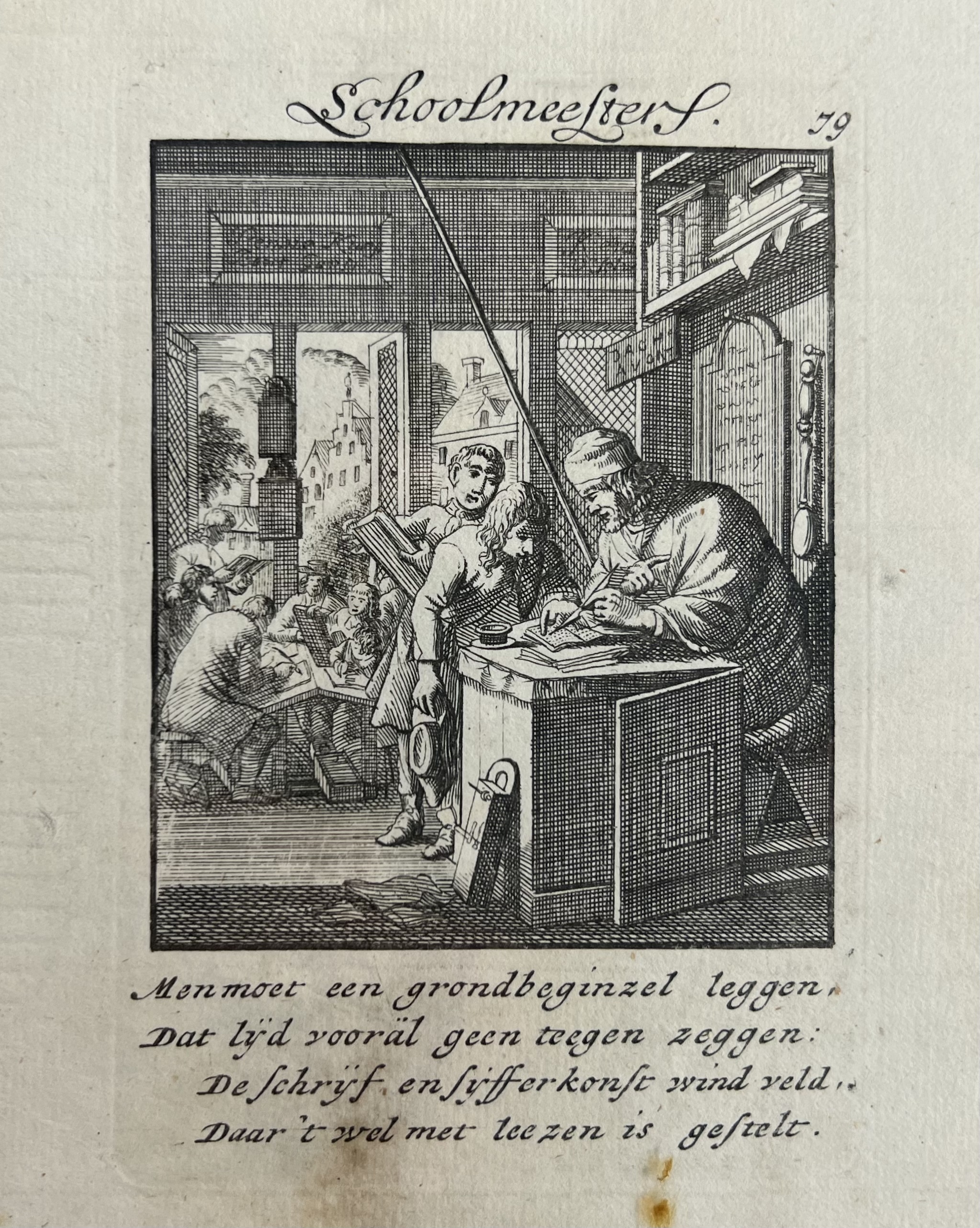 Lot met een ets van Wim van der Meij en drie gravures van Dorp Hassum, Westfalen 1746, Lattynse School aan het Singel, Amsterdam en Schoolmeesters. 18e-20e eeuw. |