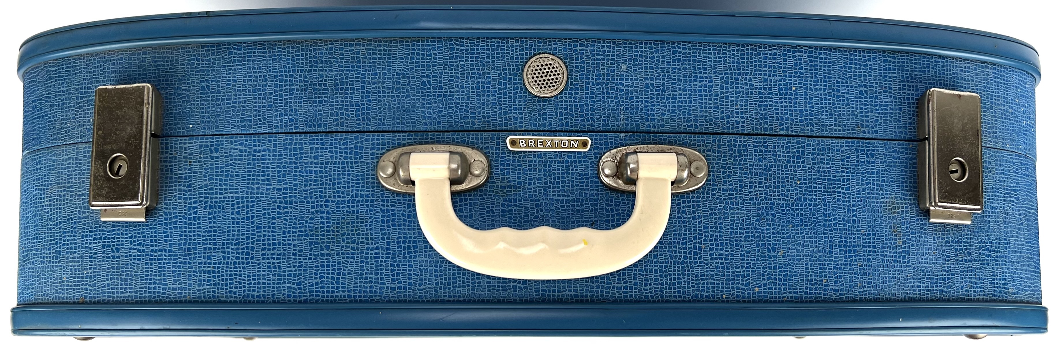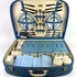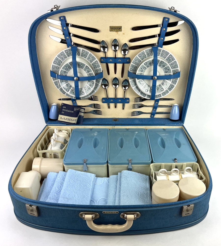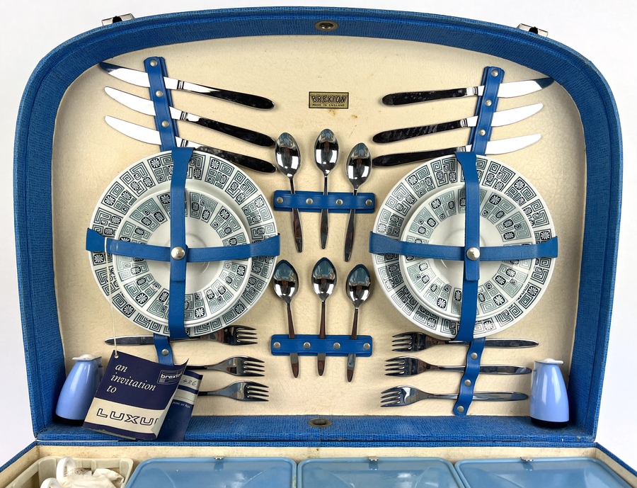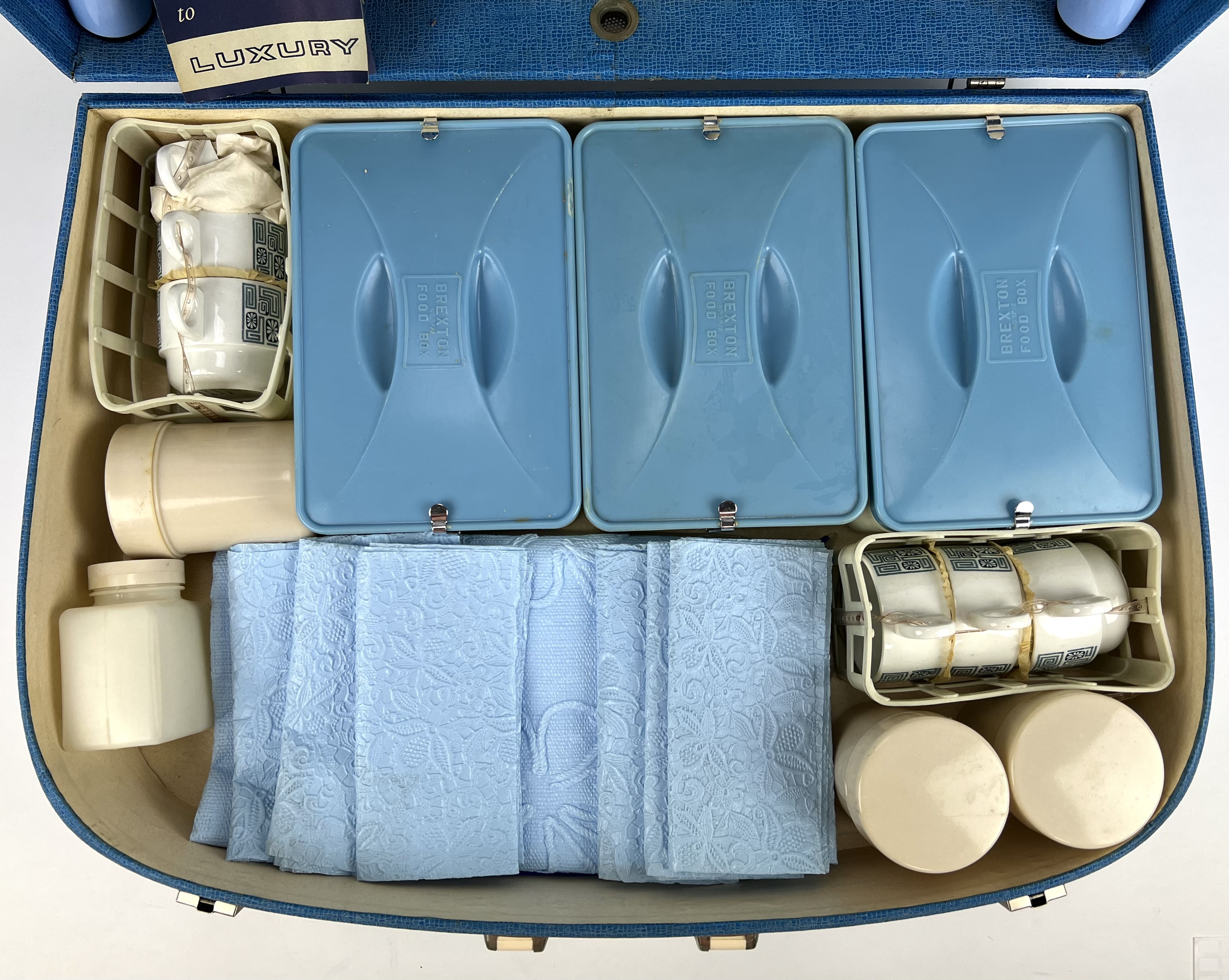 Blauwe Brexton picknickset voor zes personen. Compleet met kunststof borden, theekoppen, messen, vorken en theelepels, meerdere dozen en voorraadbussen. Made in England, jaren 50. |