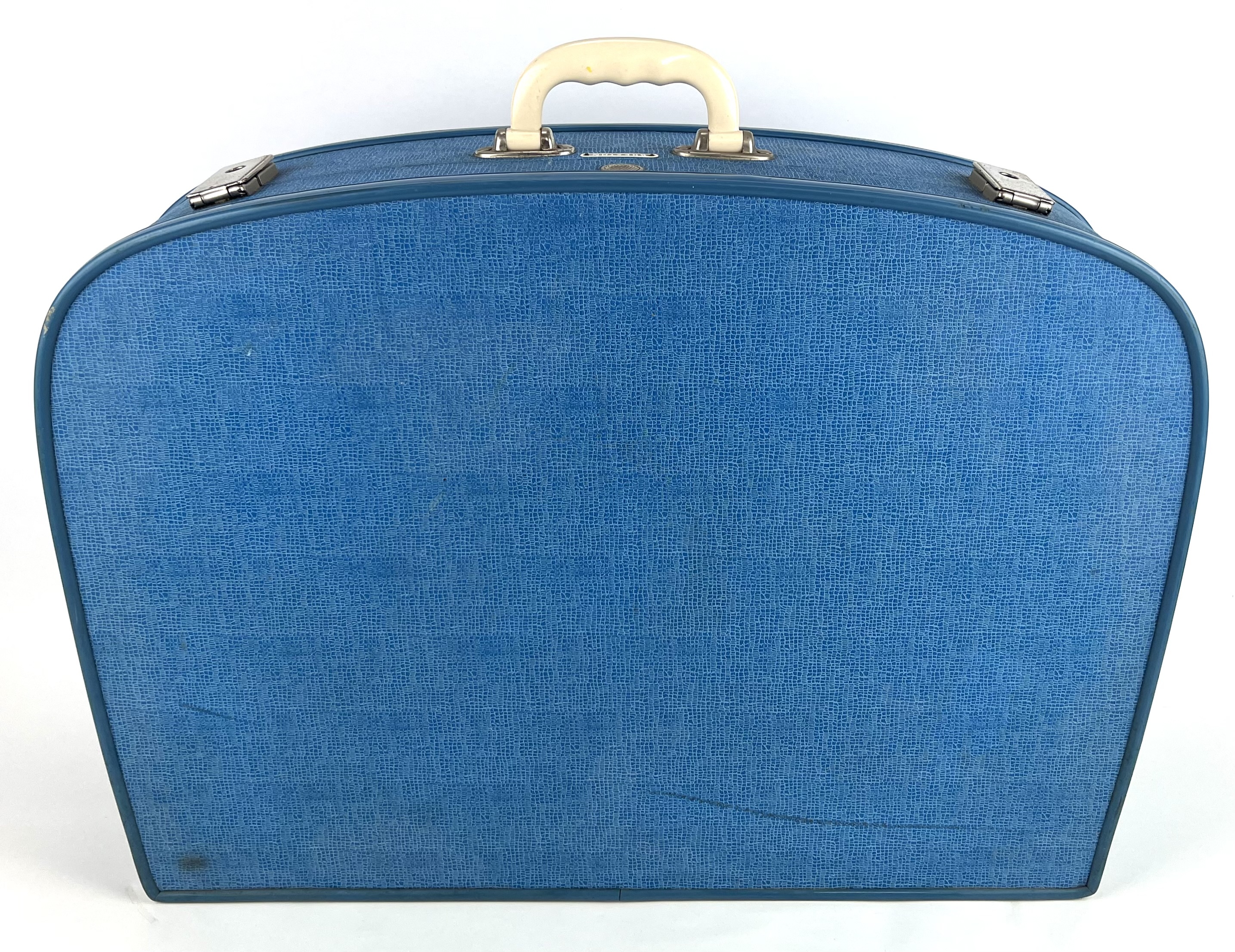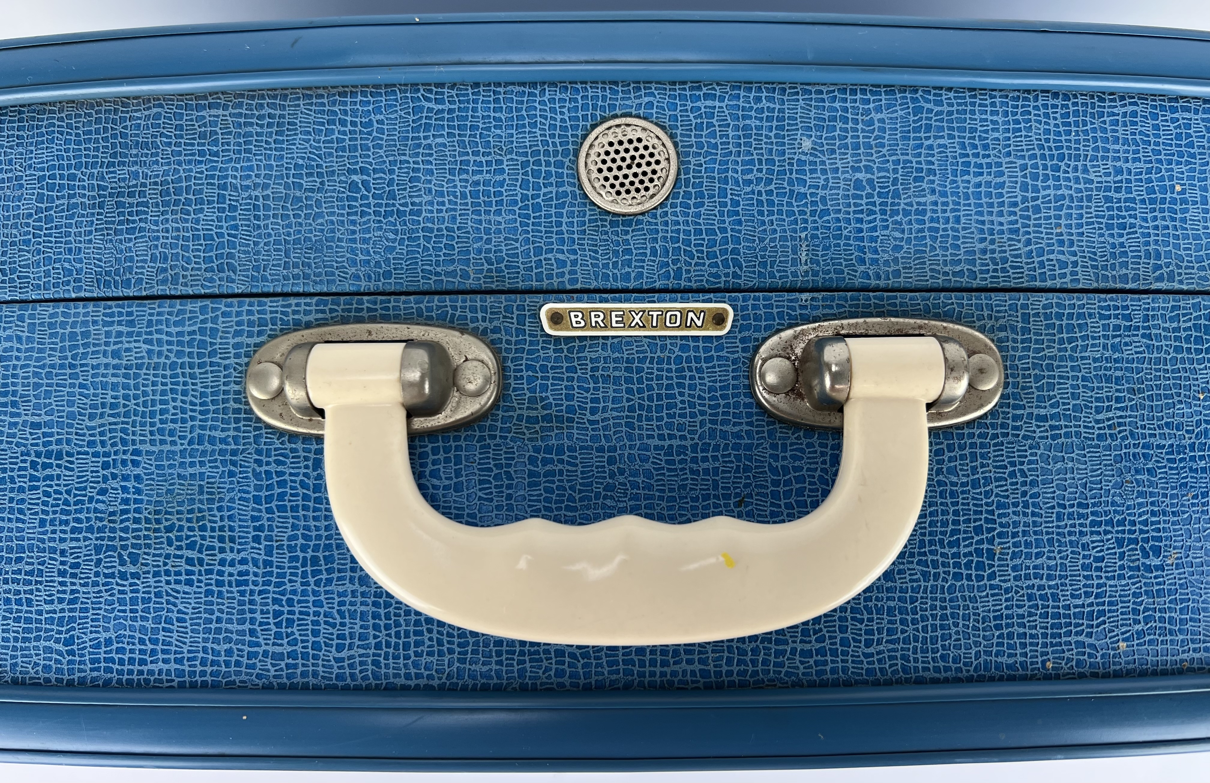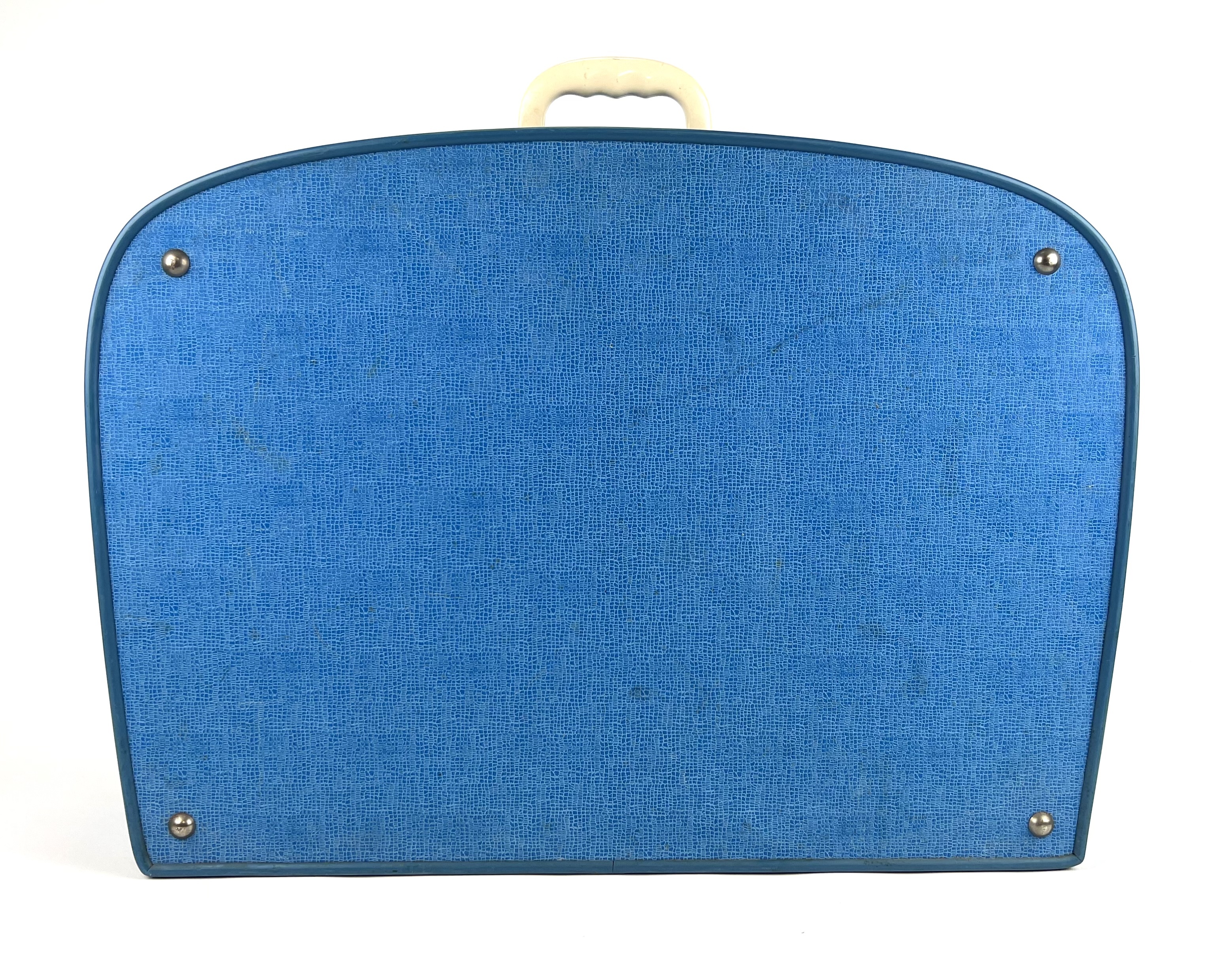 Blauwe Brexton picknickset voor zes personen. Compleet met kunststof borden, theekoppen, messen, vorken en theelepels, meerdere dozen en voorraadbussen. Made in England, jaren 50. |