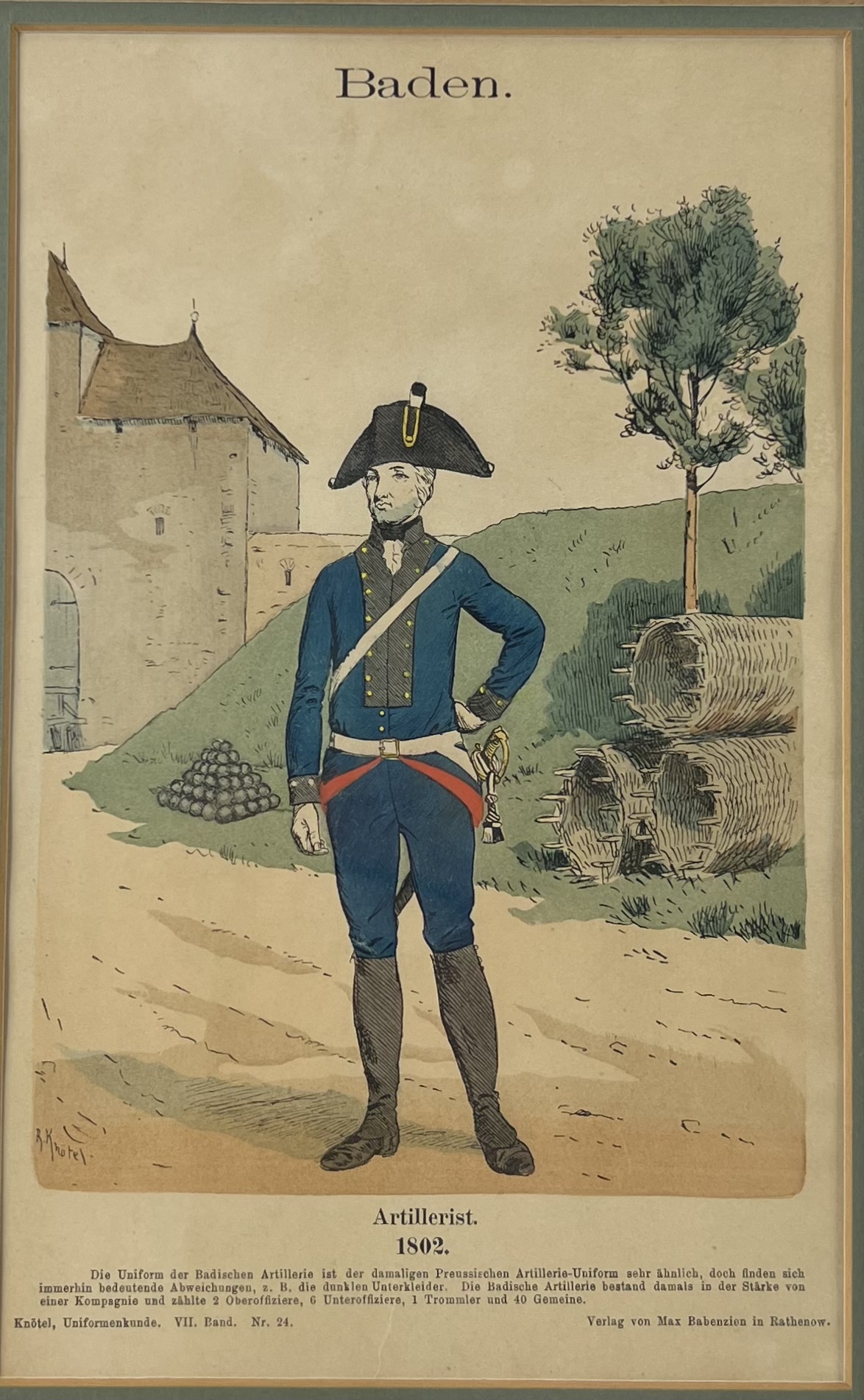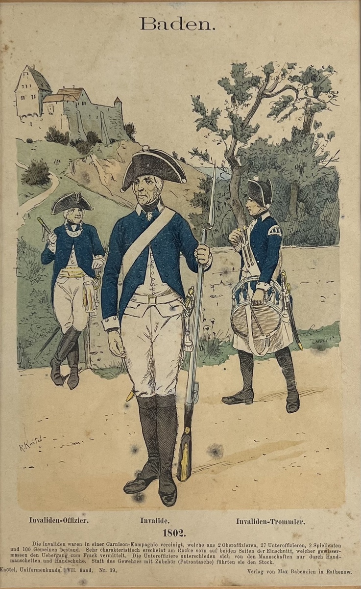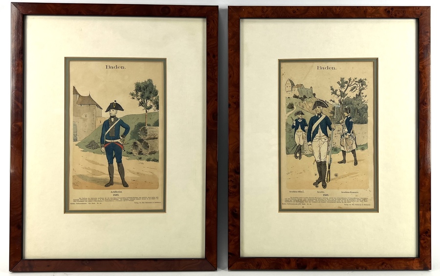 Twee prenten van militairen in tenue van het leger van Baden. "Artillerist" en "Invaliden", maker Richard Knötel. Uitgeverij Max Babenzien, Rathenow. Eerste kwart 19e eeuw . |