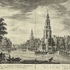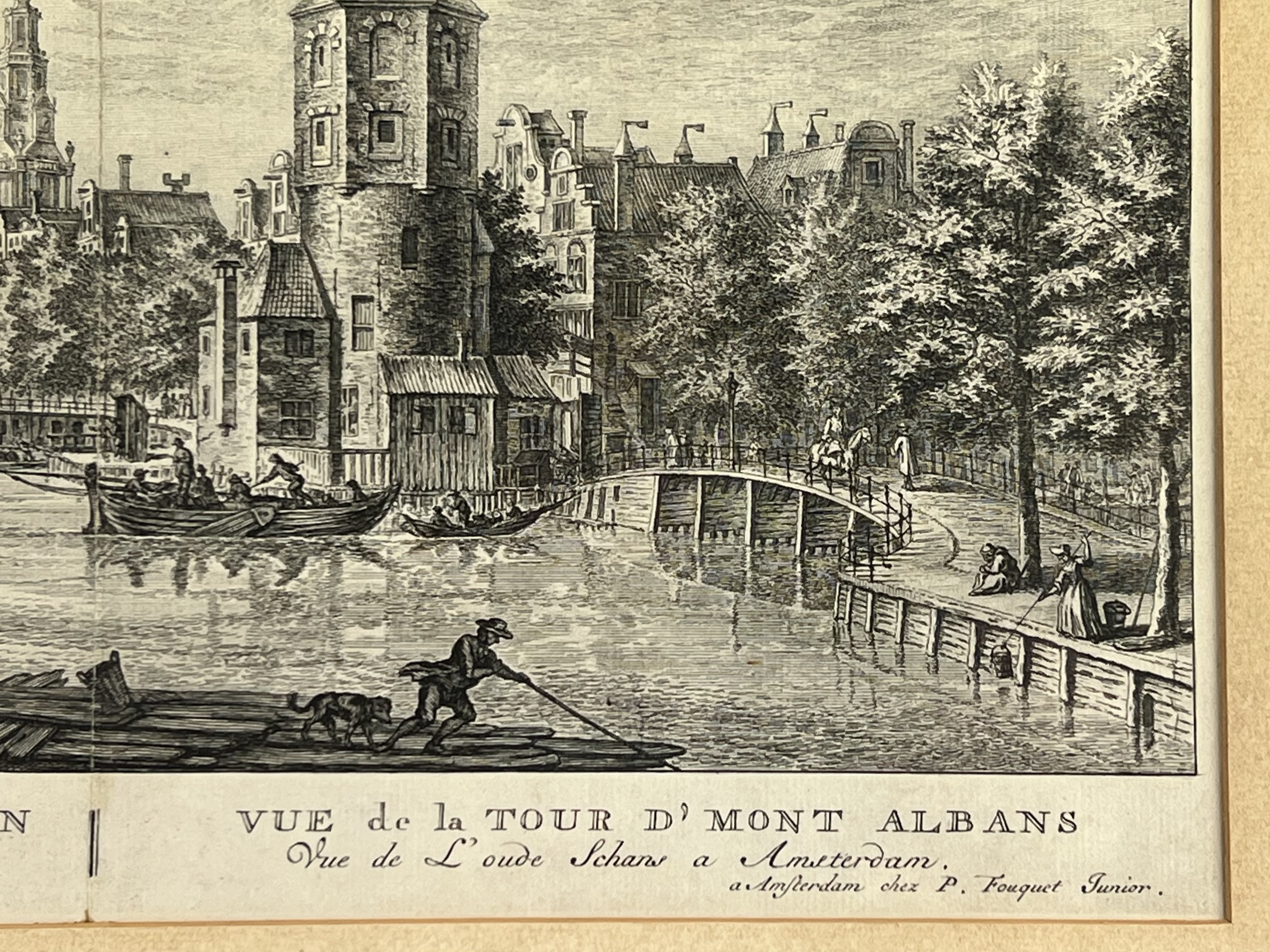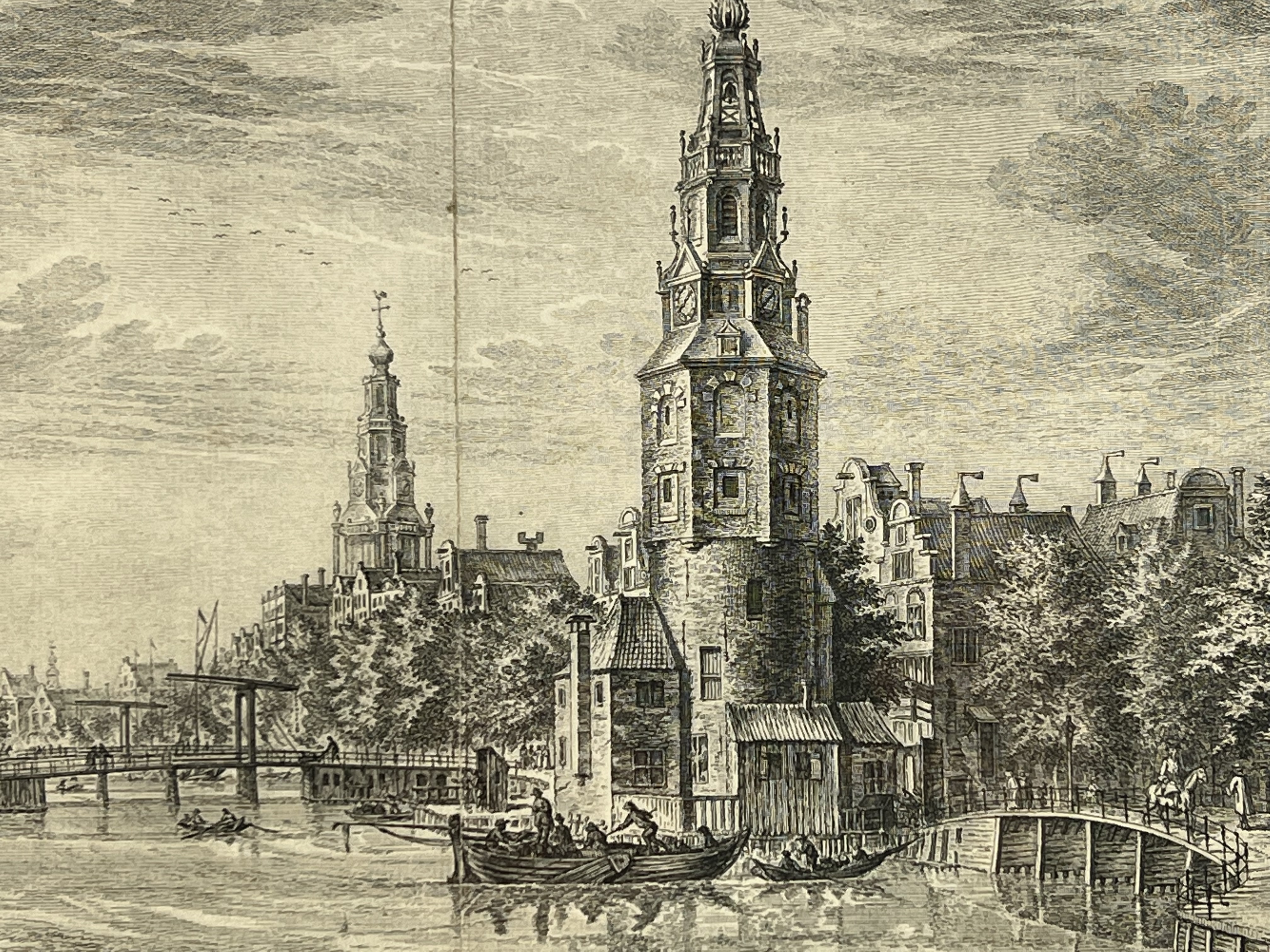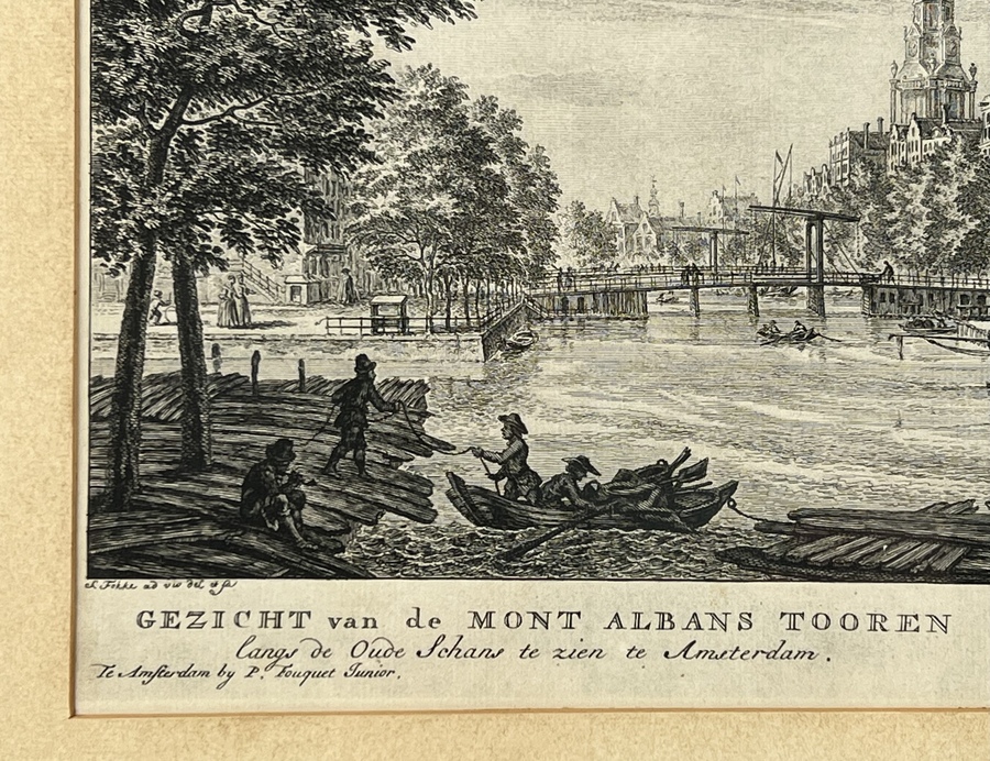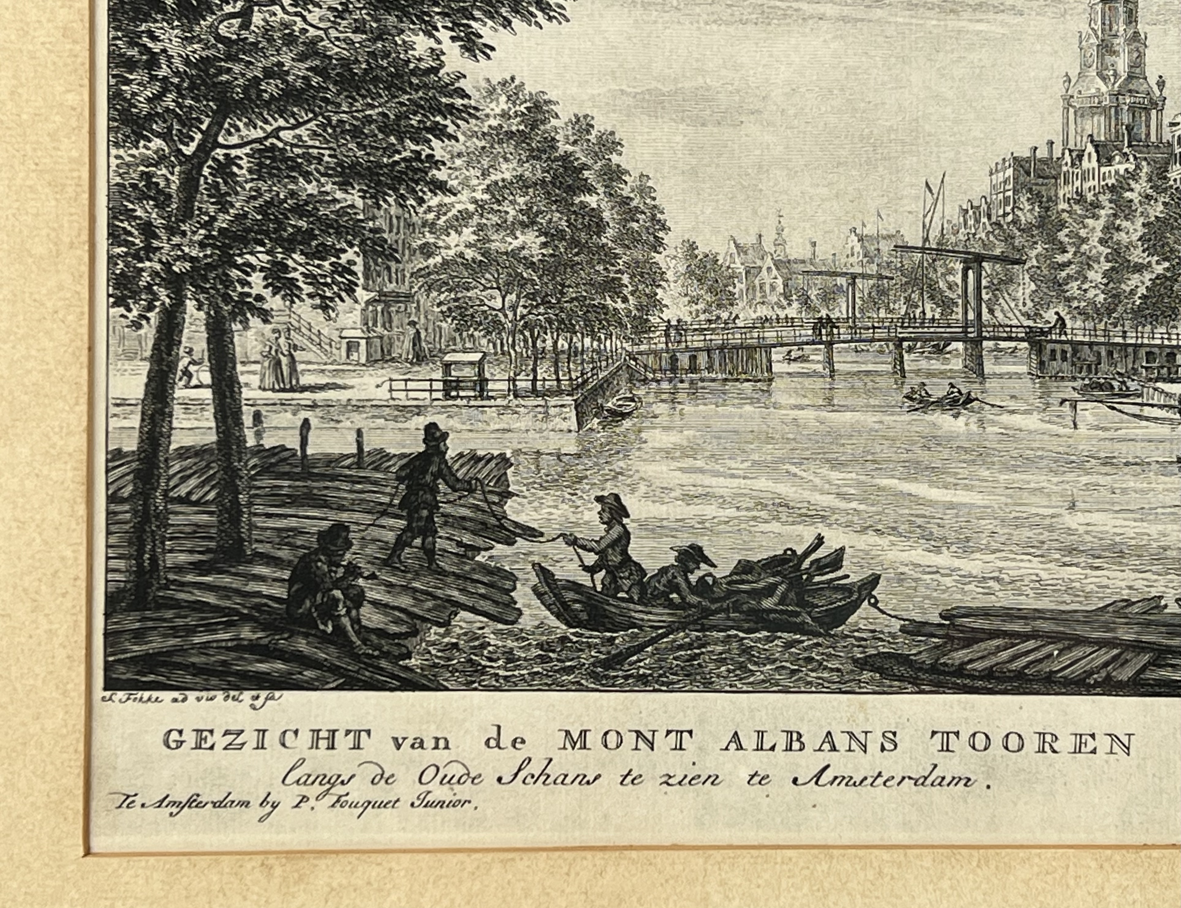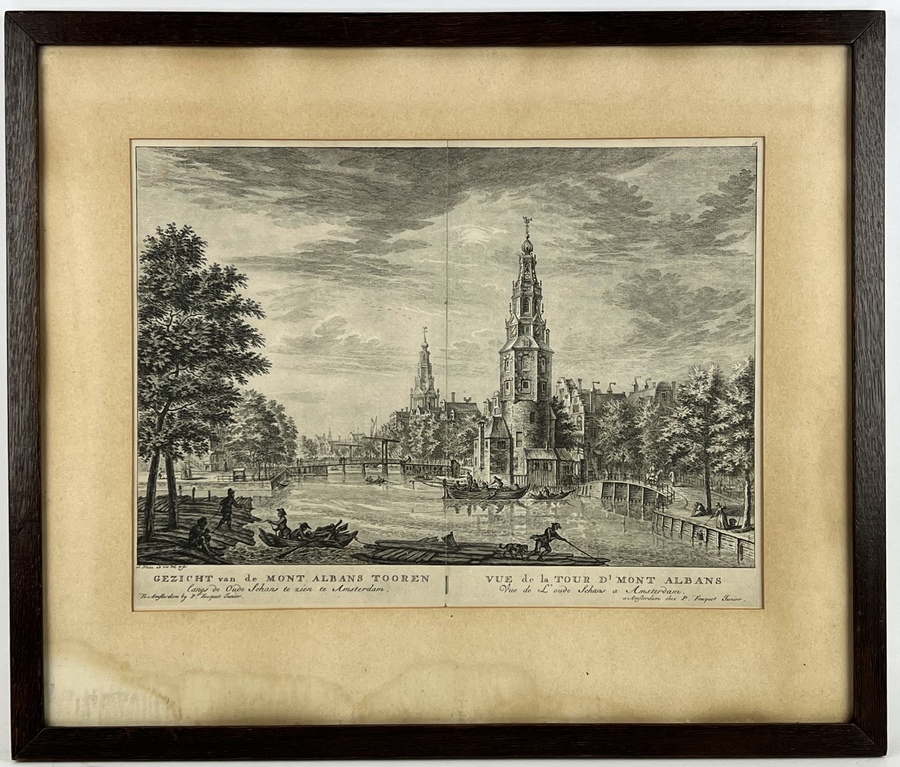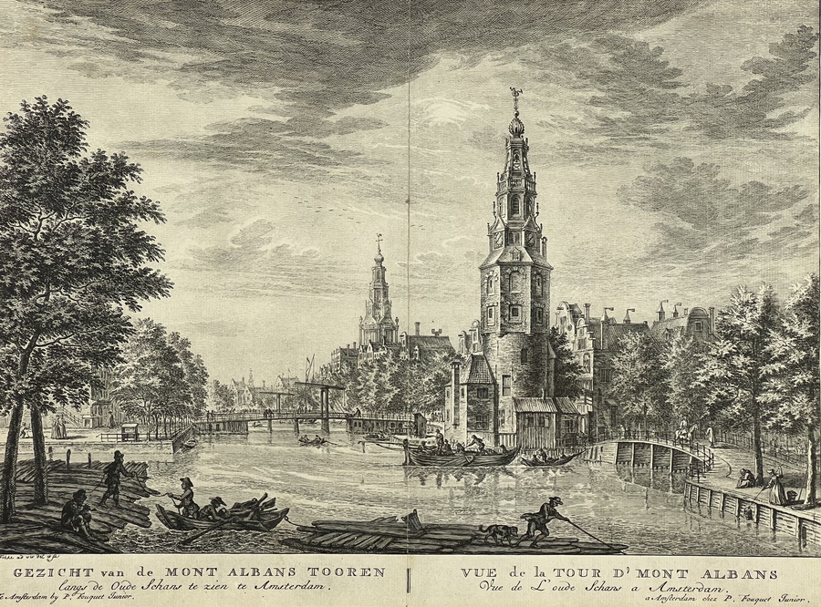 Gravure met titel "Gezicht van de Mont Albans Tooren langs de Oude Schans te zien te Amsterdam", titel eveneens in het Frans op de gravure. De tegenwoordige naam van afgebeelde gebouw is de Montelbaanstoren. Maker van de gravure Simon Fokke (1712 -1784), uitgegeven door Pieter Fouquet Junior in 1783. |