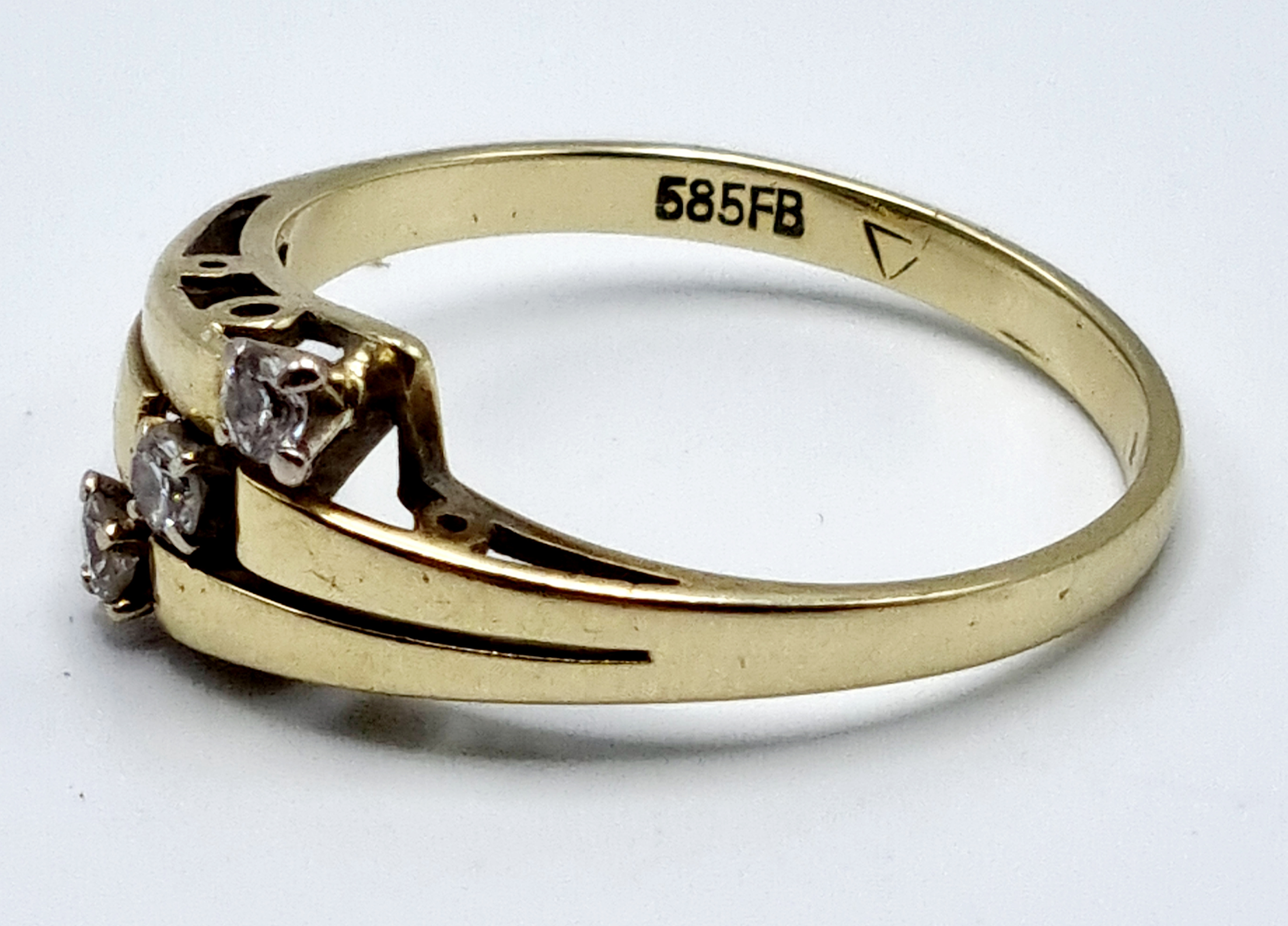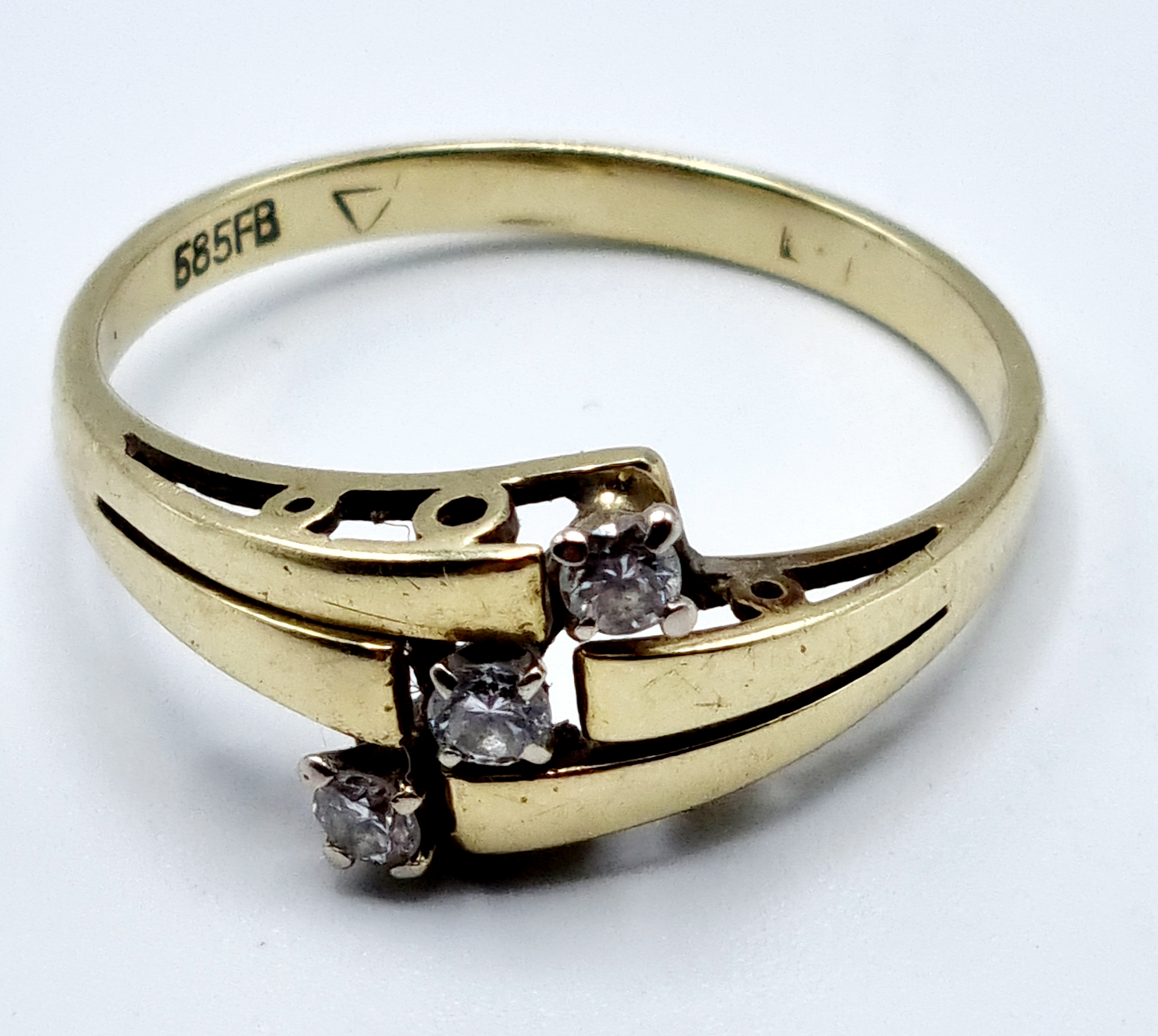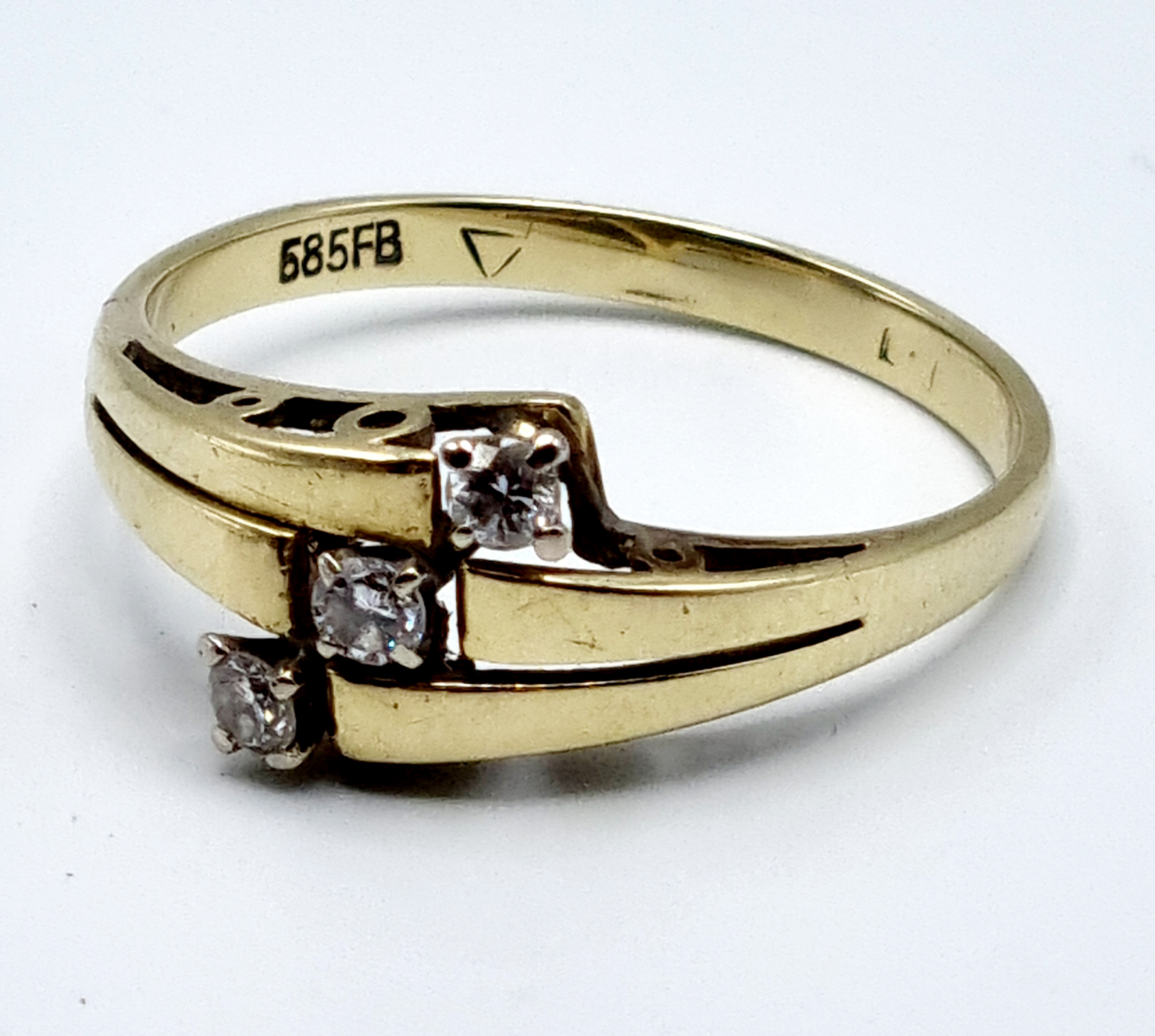 Vintage 14 karaats gouden ring met drie geslepen diamanten, circa 0,10 ct. Gemerkt 585 FB. |