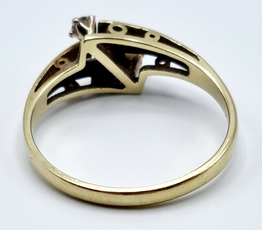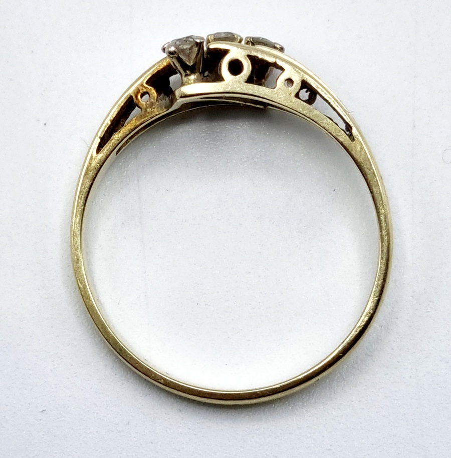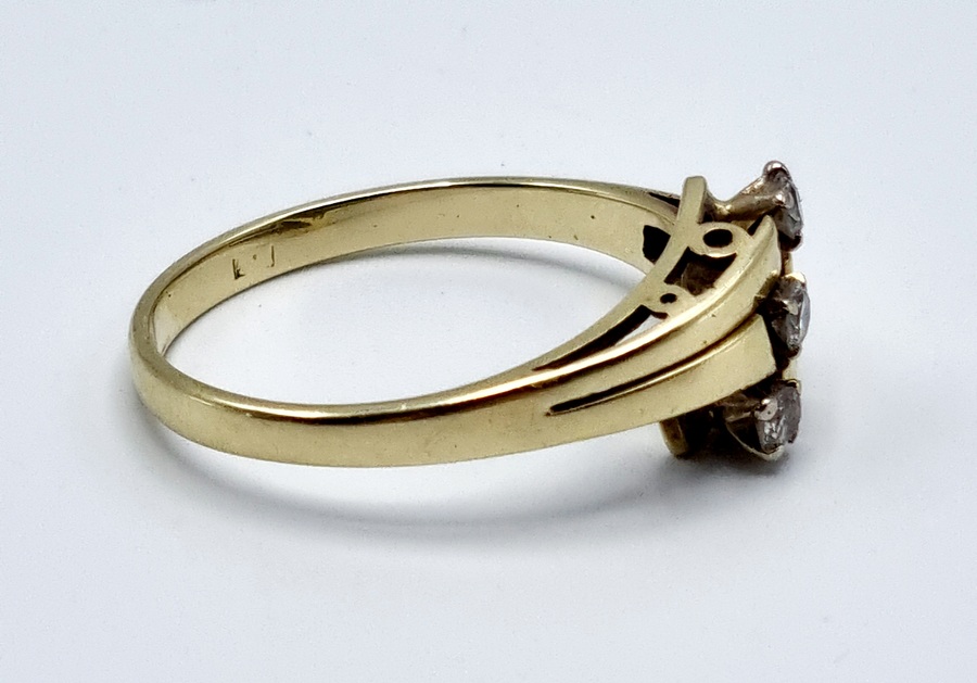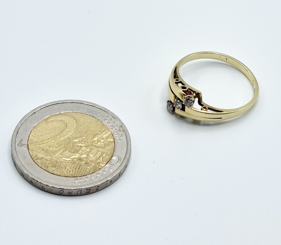 Vintage 14 karaats gouden ring met drie geslepen diamanten, circa 0,10 ct. Gemerkt 585 FB. |
