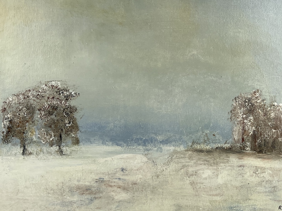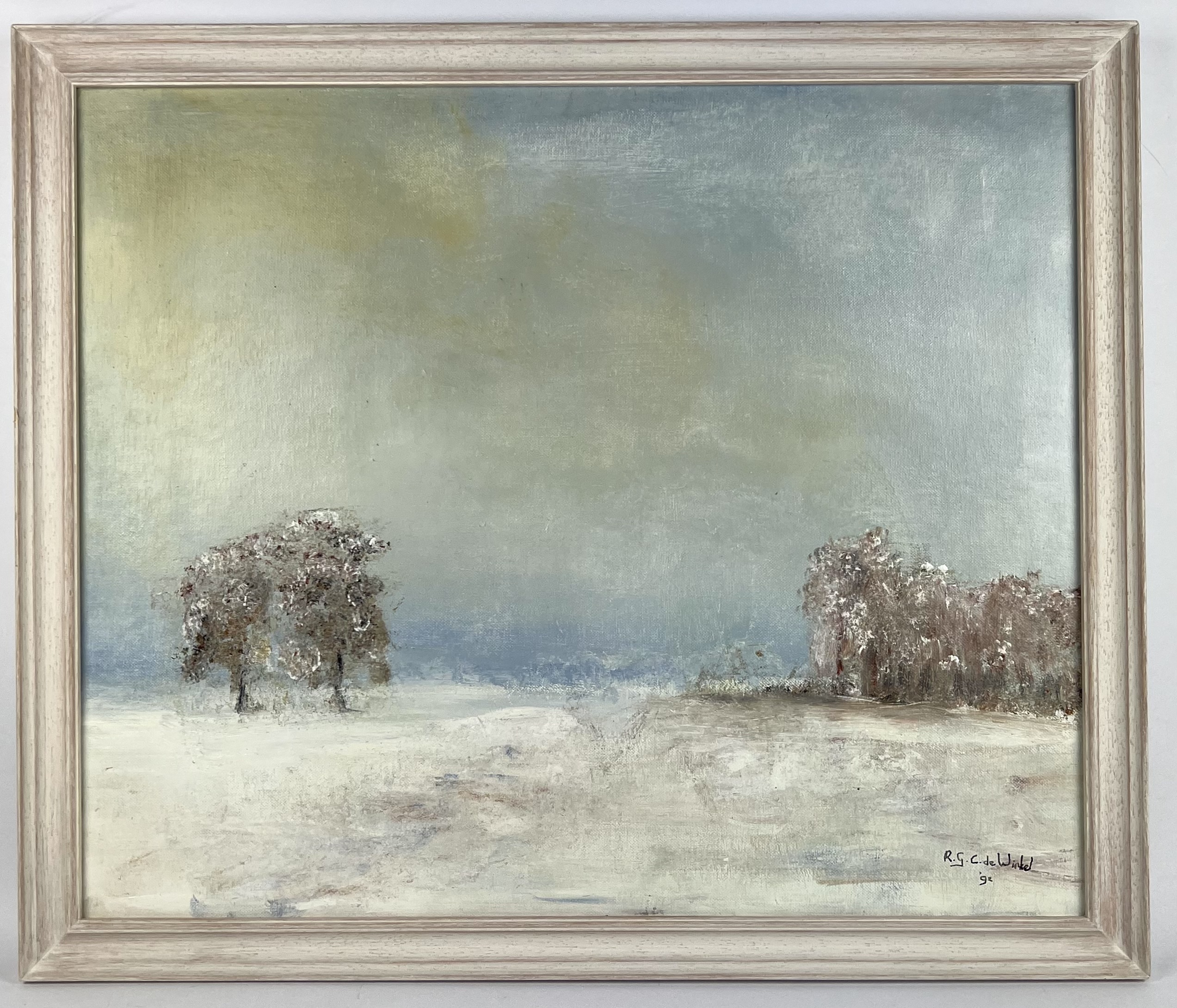 Schilderij van winterlandschap, olieverf op paneel. Rechtsonder gesigneerd R.G.C. de Winkel en gedateerd 1992. . |