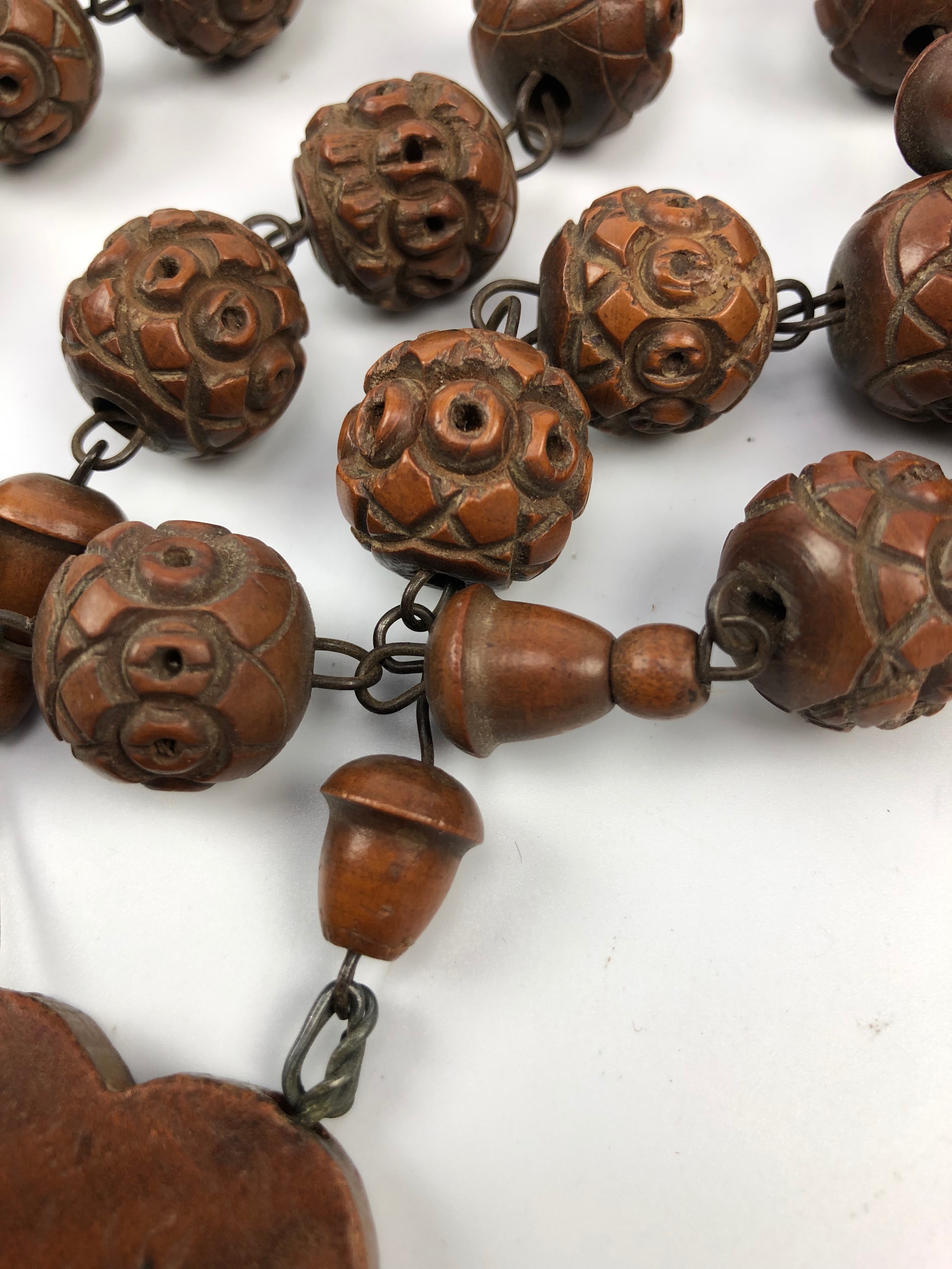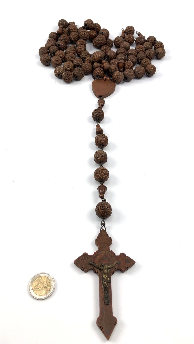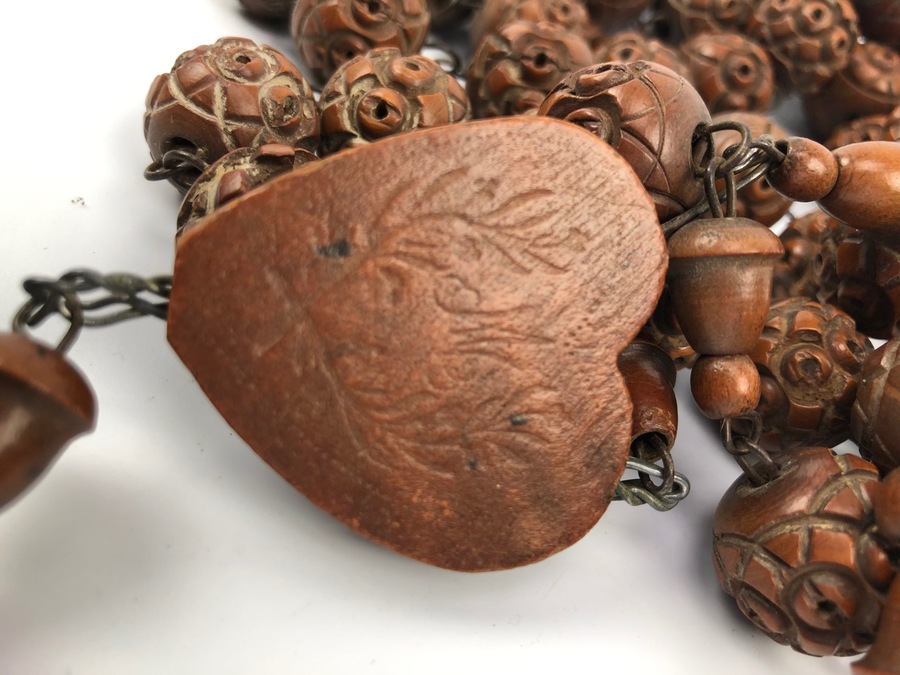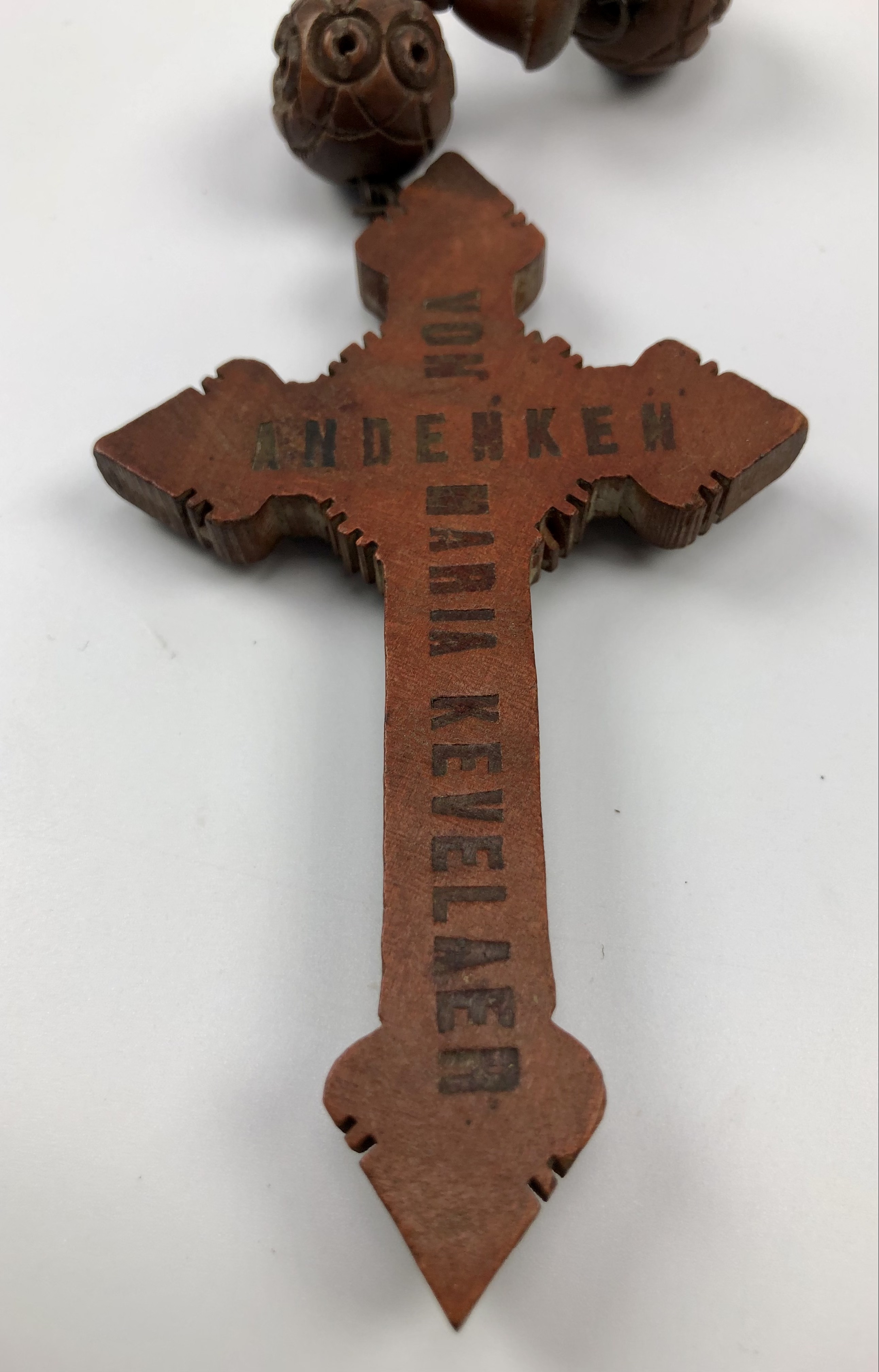 Antieke rozenkrans van gesneden eikenhouten kralen en kruis. Tevens inscriptie en siersnijwerk, circa 1920. |