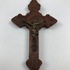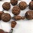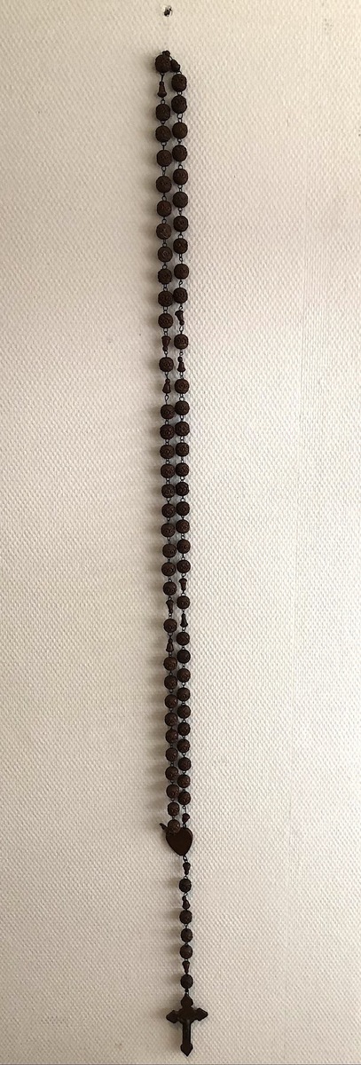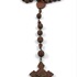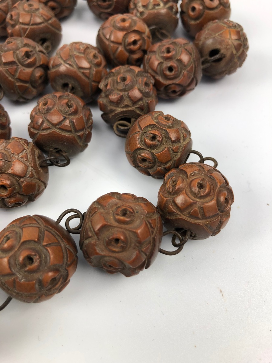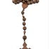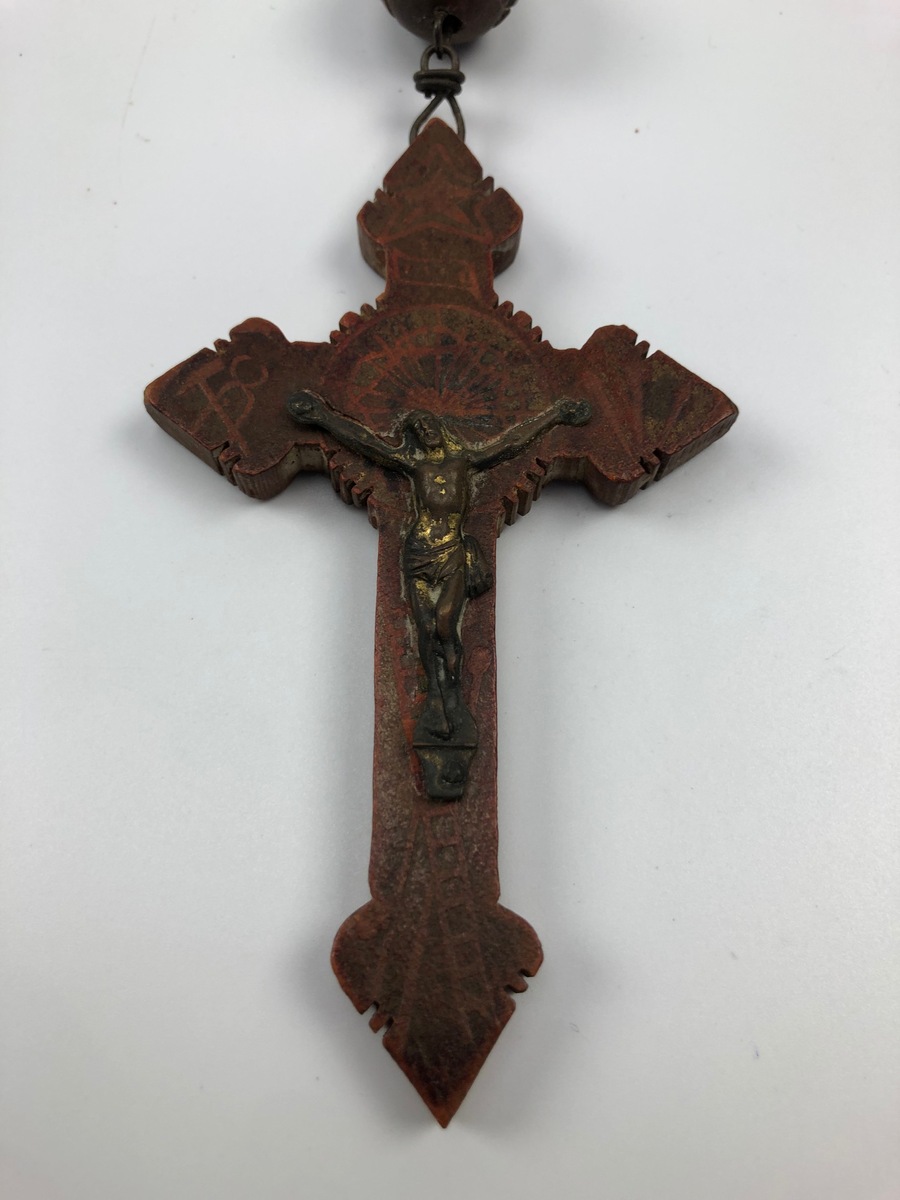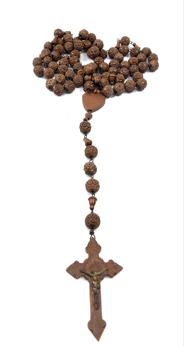 Antieke rozenkrans van gesneden eikenhouten kralen en kruis. Tevens inscriptie en siersnijwerk, circa 1920. |