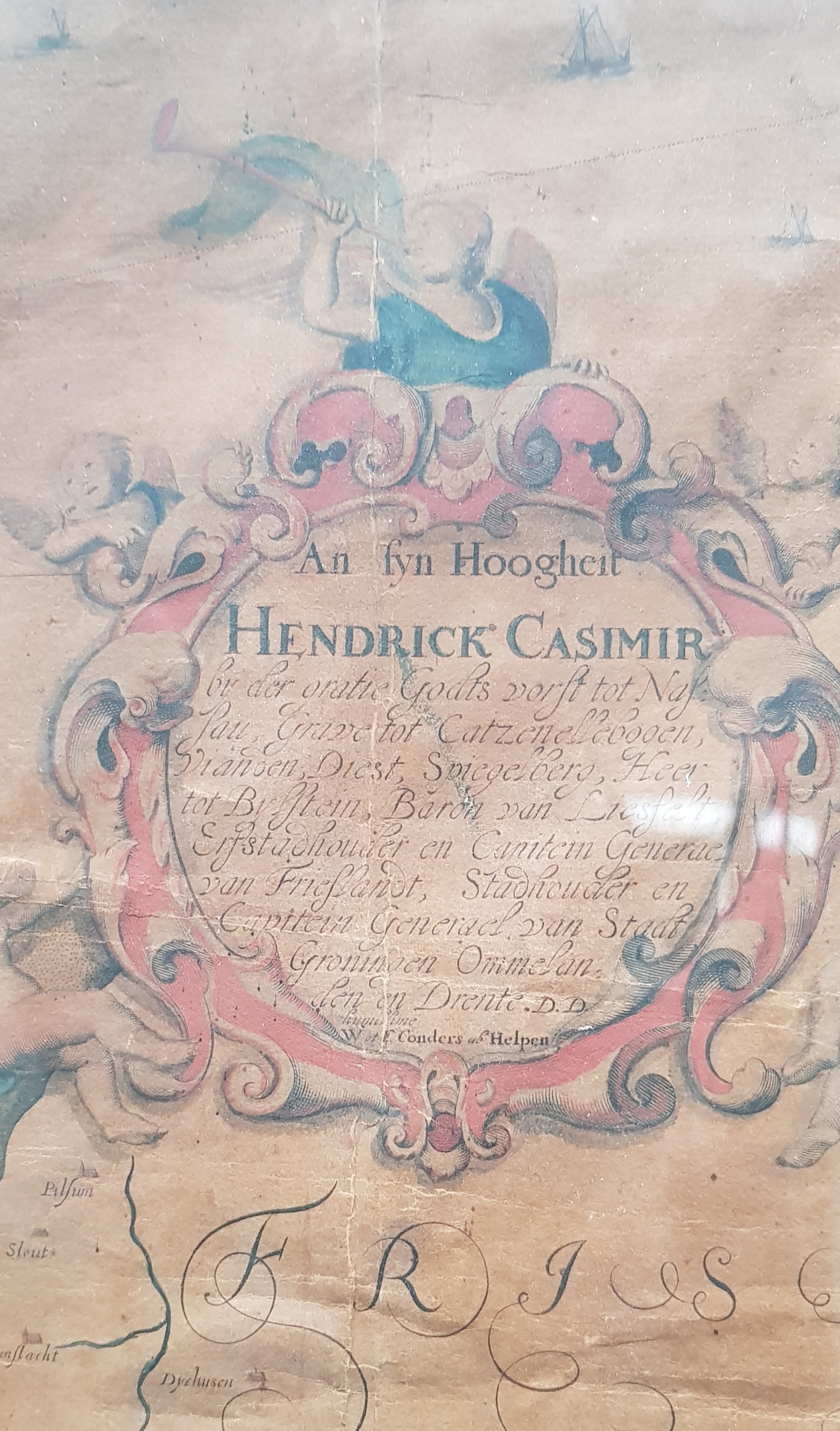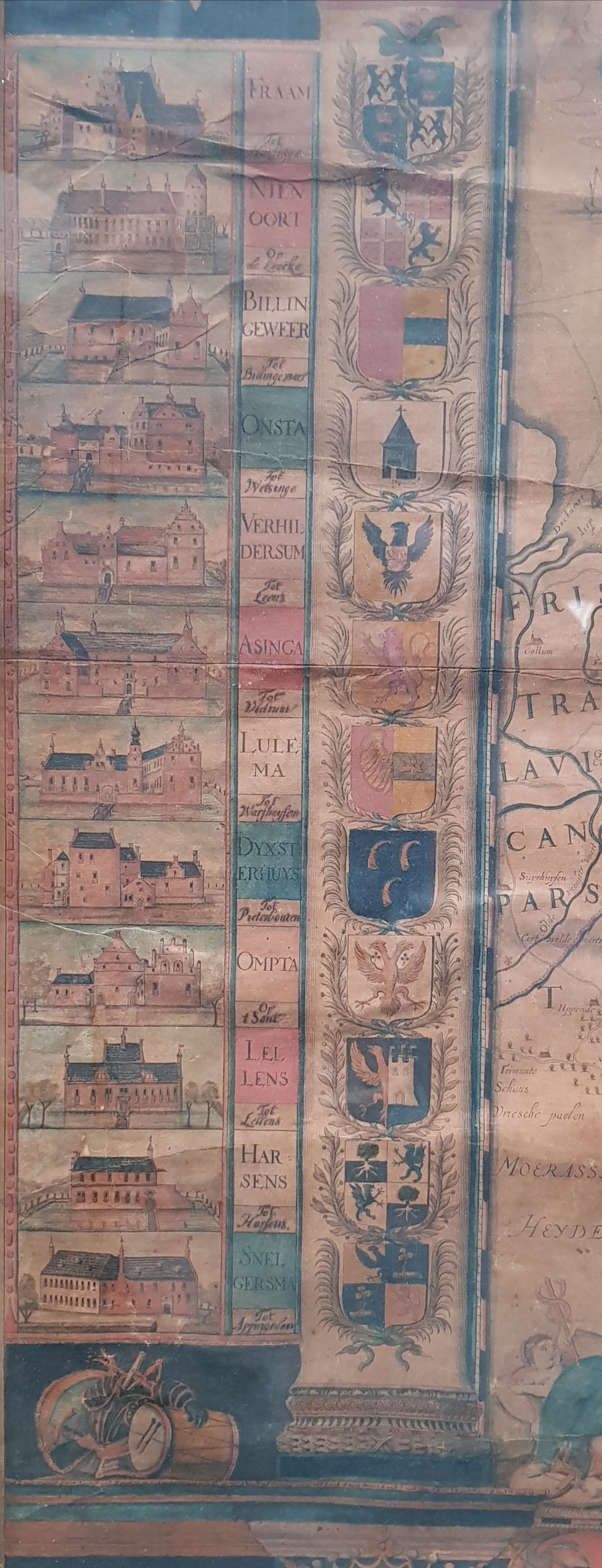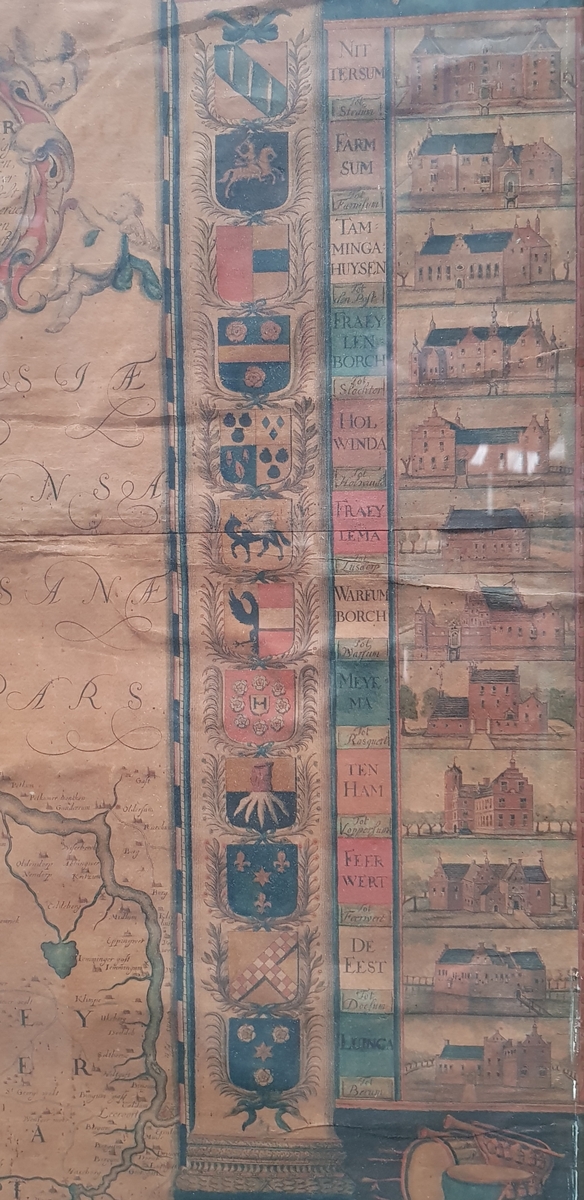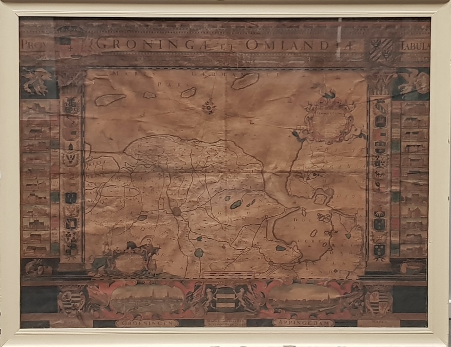 Ingekleurde kopergravure op groot formaat getiteld "Provinciae Groningae et Omlandiae Tabila", bestaande uit vier afzonderlijke kopergravures. De oudste wandkaart van de provincie Groningen is in circa 1678 vervaardigd door de gebroeders Wilhelm en Frederik Coenders van Helpen. Aan beide zijden van de kaart staan afbeeldingen van vierentwintig Groninger borgen en de wapens van de bewoners/families uit die tijd.