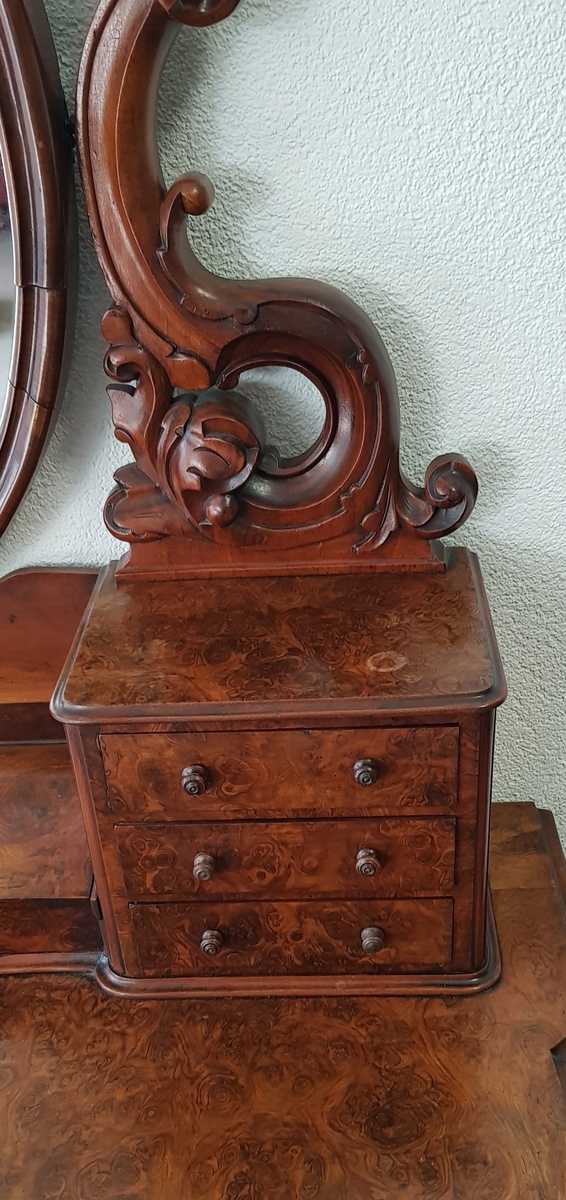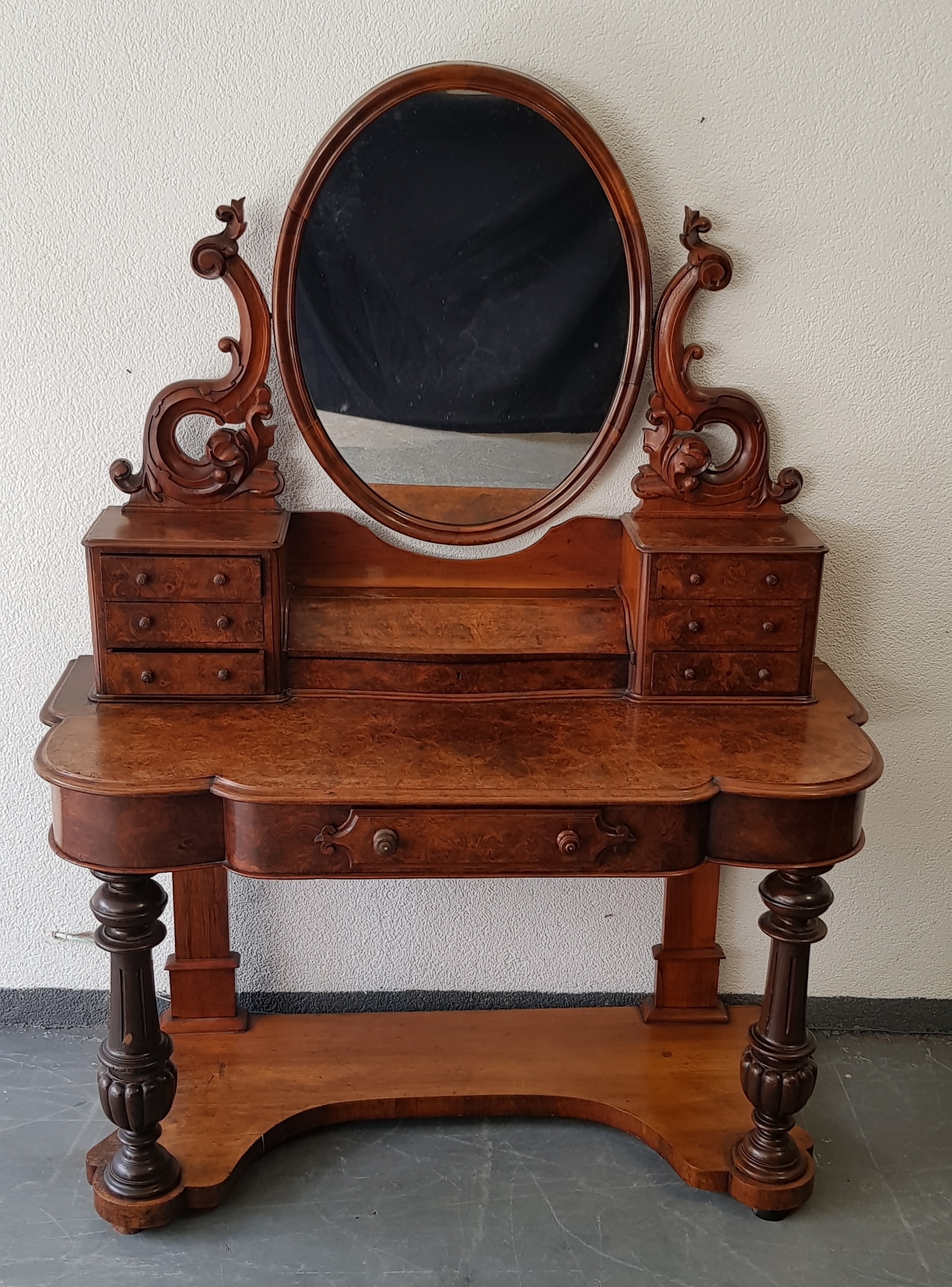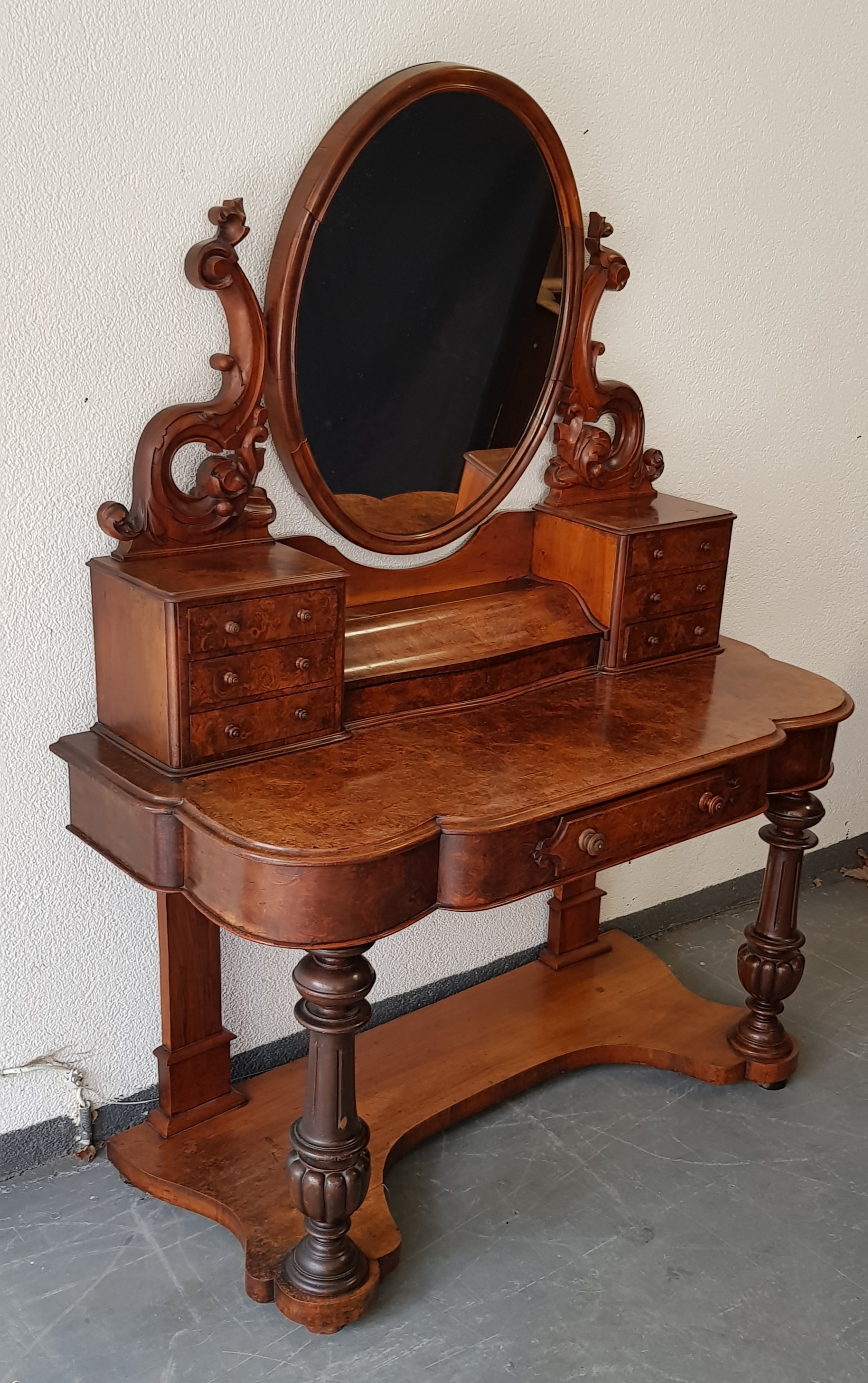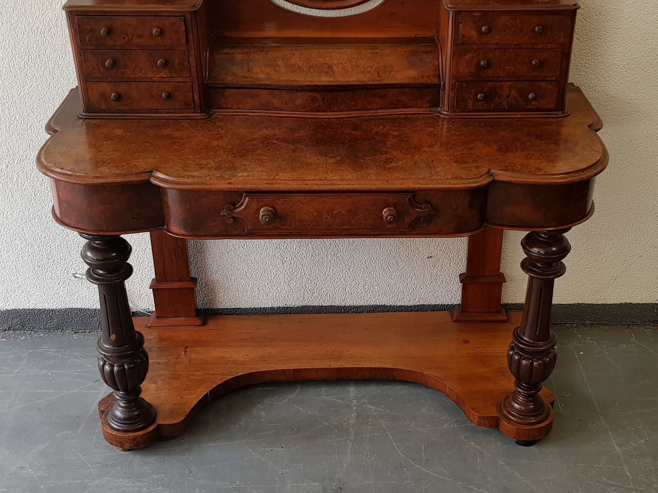 Victoriaanse wortelnotenhouten kaptafel met gebogen klep in middengedeelte en meerdere lades en een kantelbare spiegel. Engeland eind 19e eeuw. |