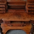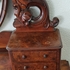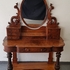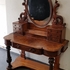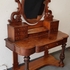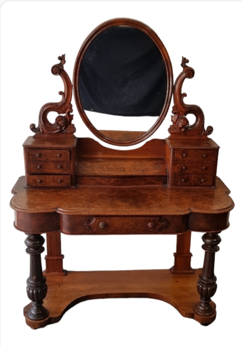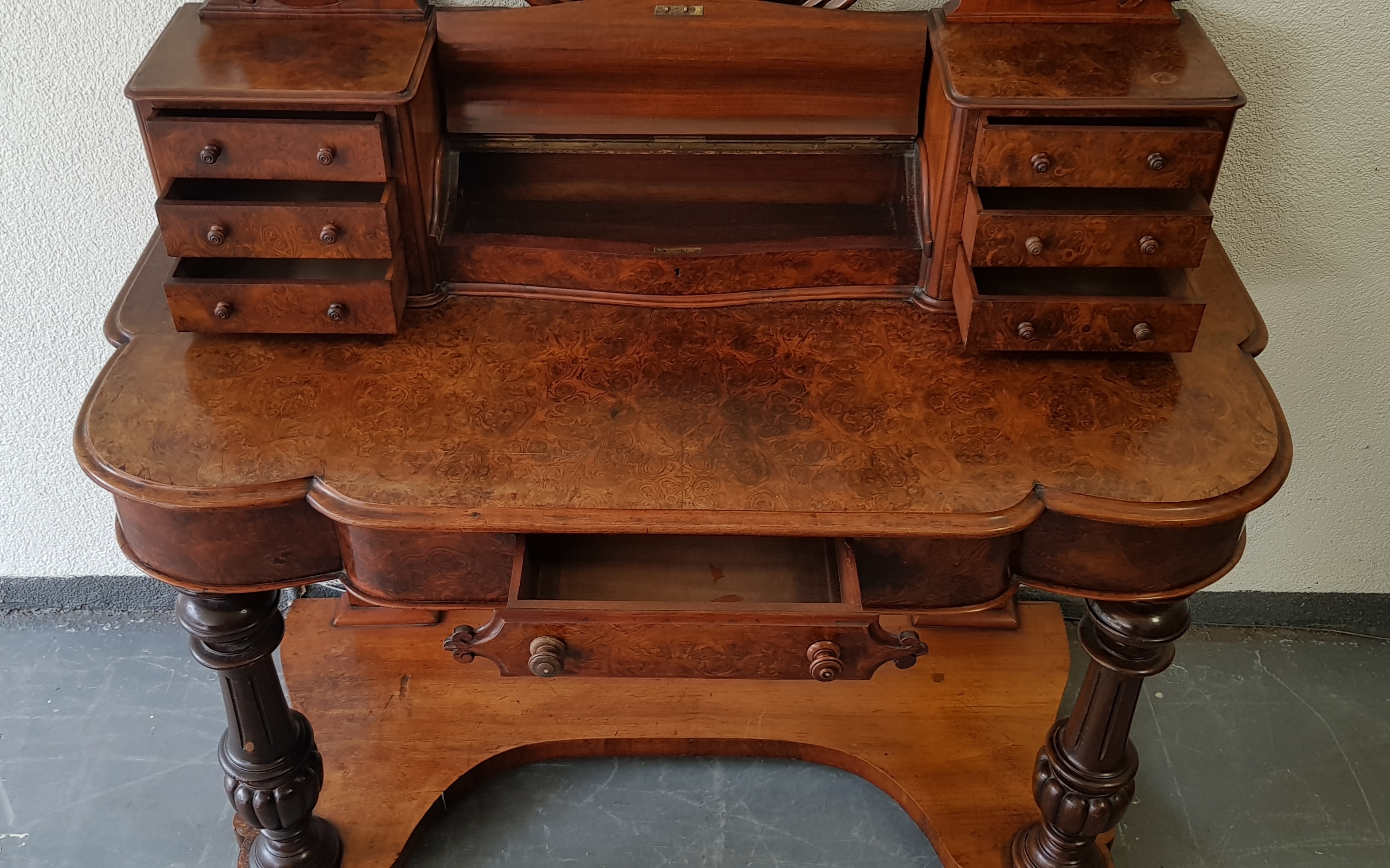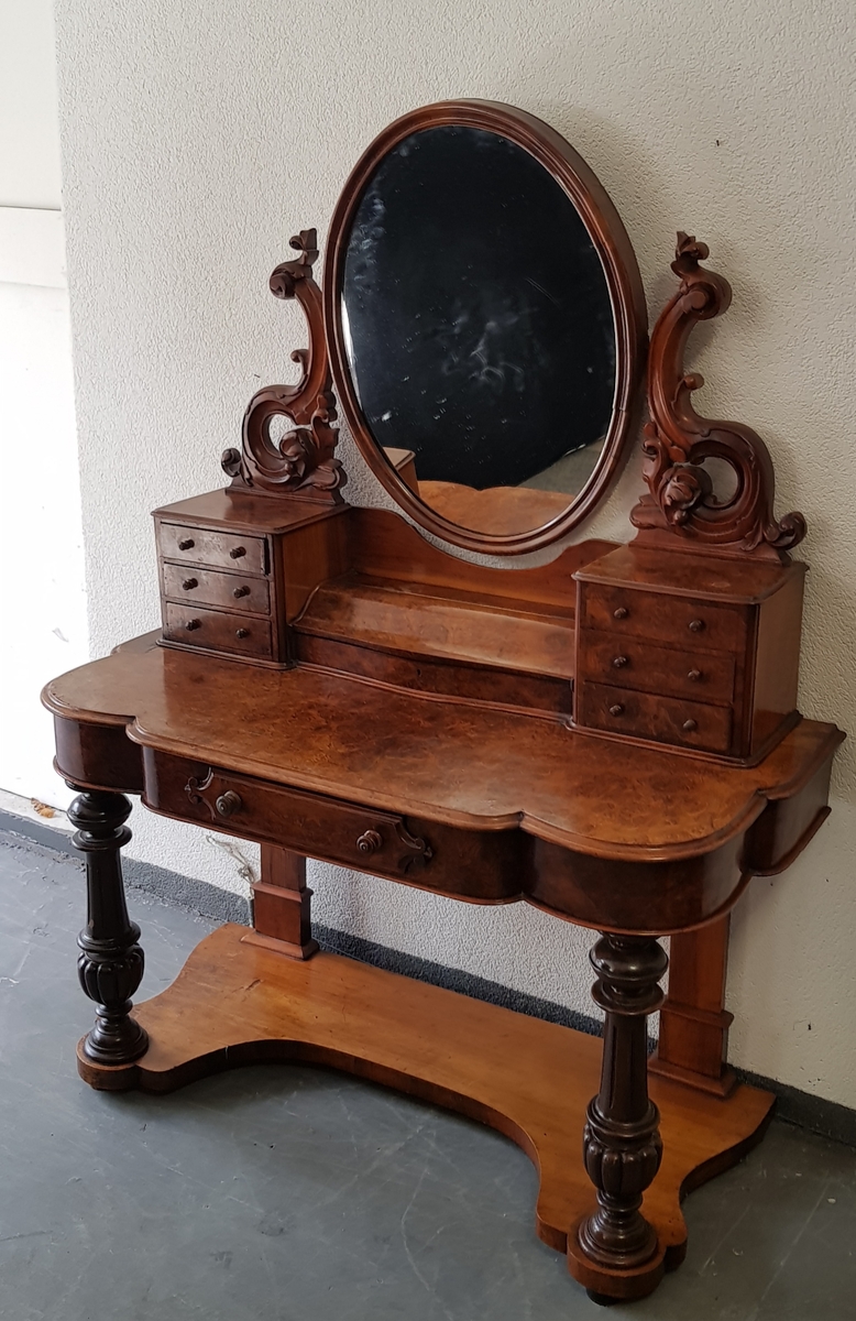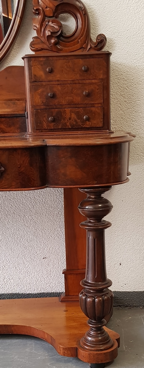 Victoriaanse wortelnotenhouten kaptafel met gebogen klep in middengedeelte en meerdere lades en een kantelbare spiegel. Engeland eind 19e eeuw. |