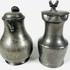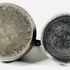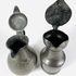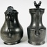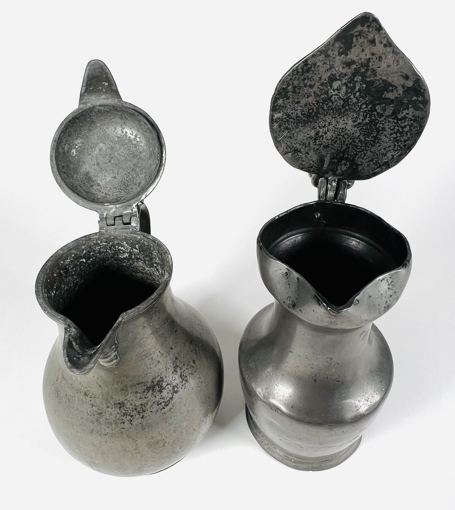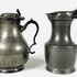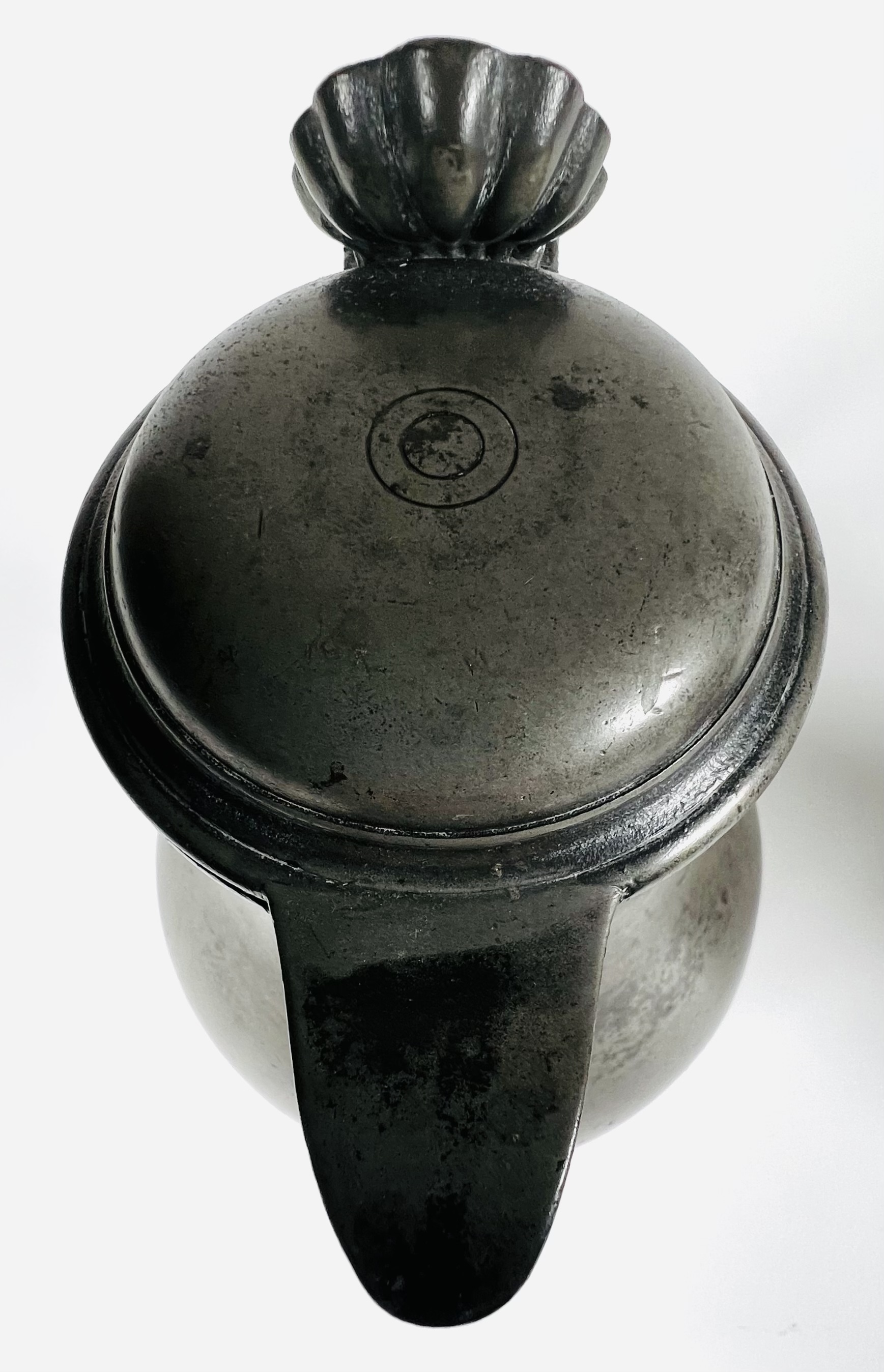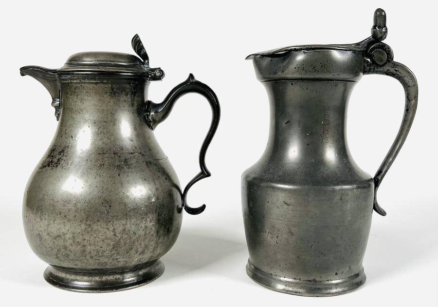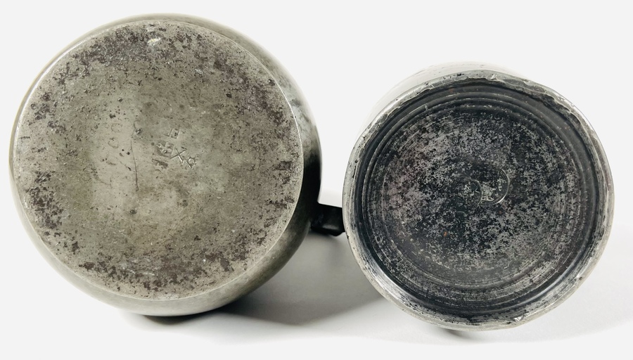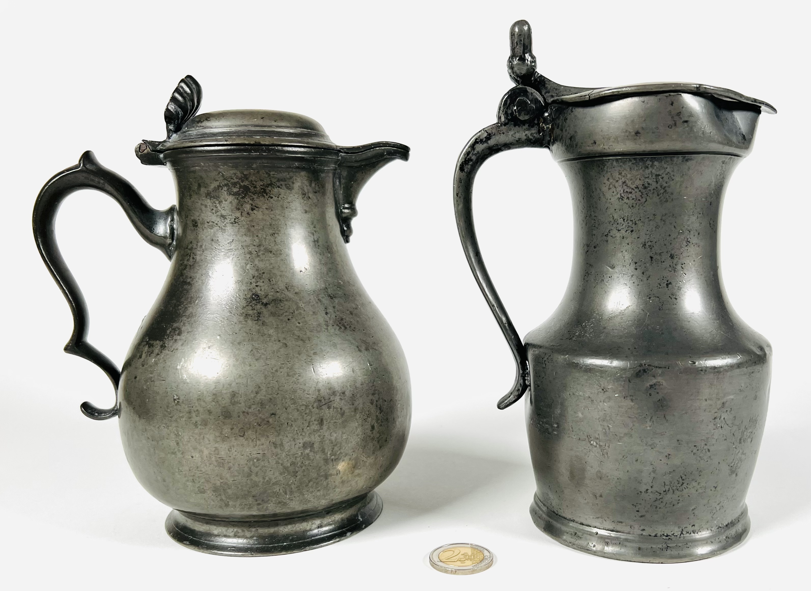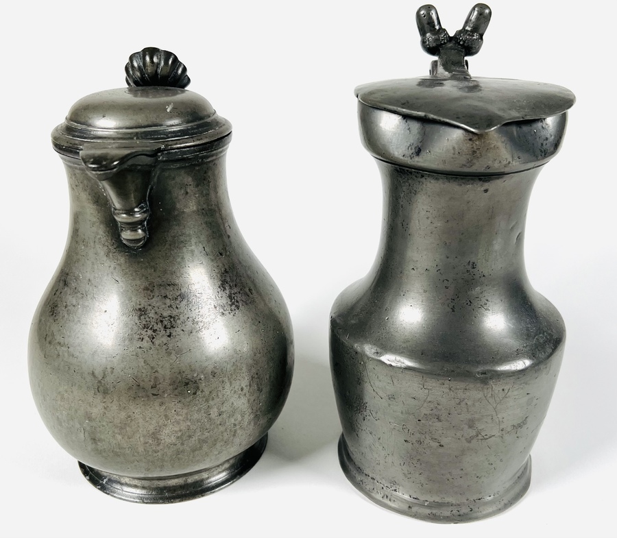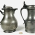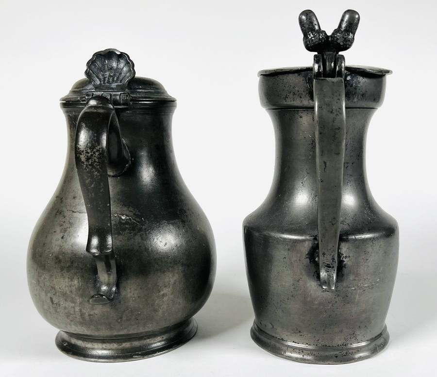 Tinnen balustervormige klepkan met duimrust en eikeltjes, aan de onderzijde gemerkt. Tweede tinnen klepkan met schelpvormige duimrust, gemerkt aan de onderzijde. 19e eeuw. |