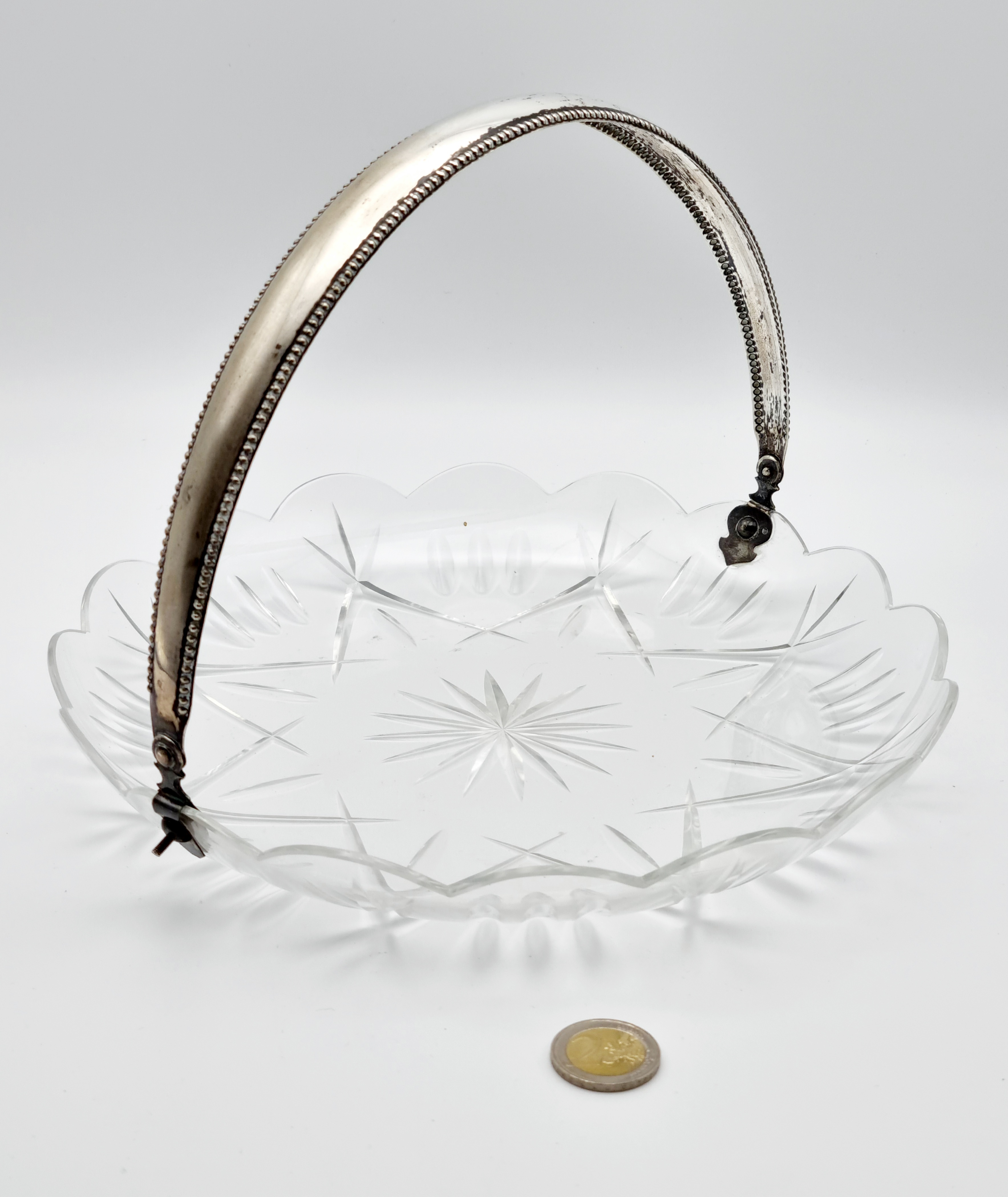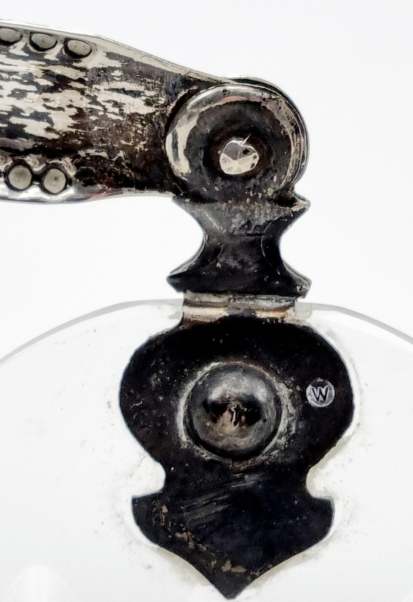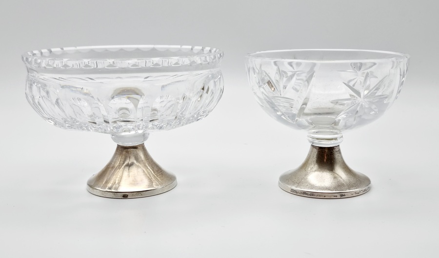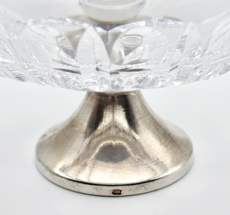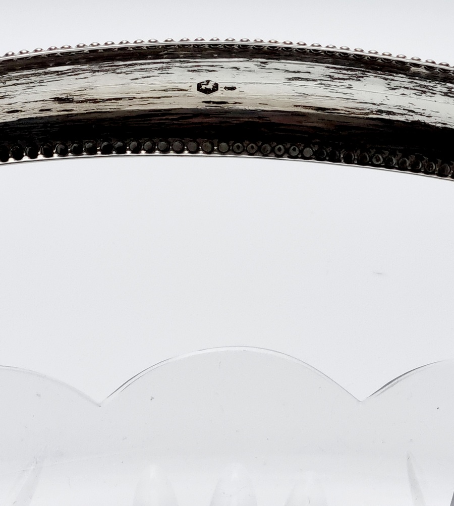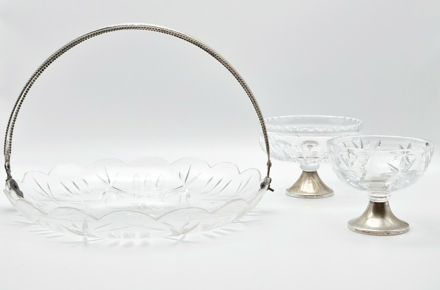 Glazen serveerschaal met zilveren hengsel, gemerkt lopende leeuw 2, meesterteken, minerevakop met A (Amsterdam) en jaarletter W (1931). Hierbij twee kristallen bonbonnières met zilveren voet, gemerkt met meesterteken CS6 en zwaardje. 20e eeuw. |