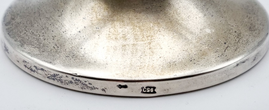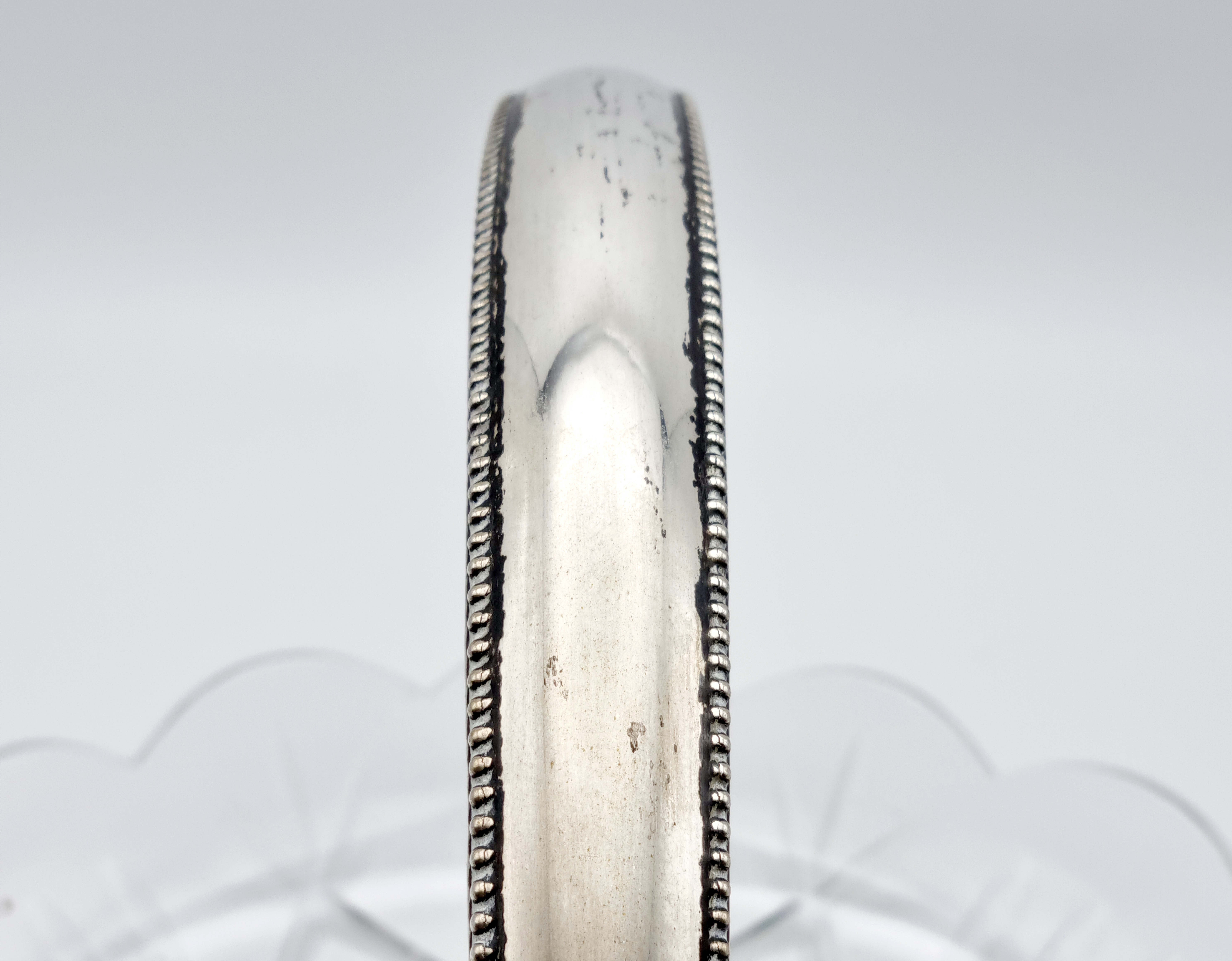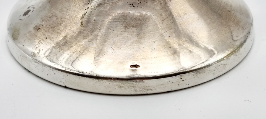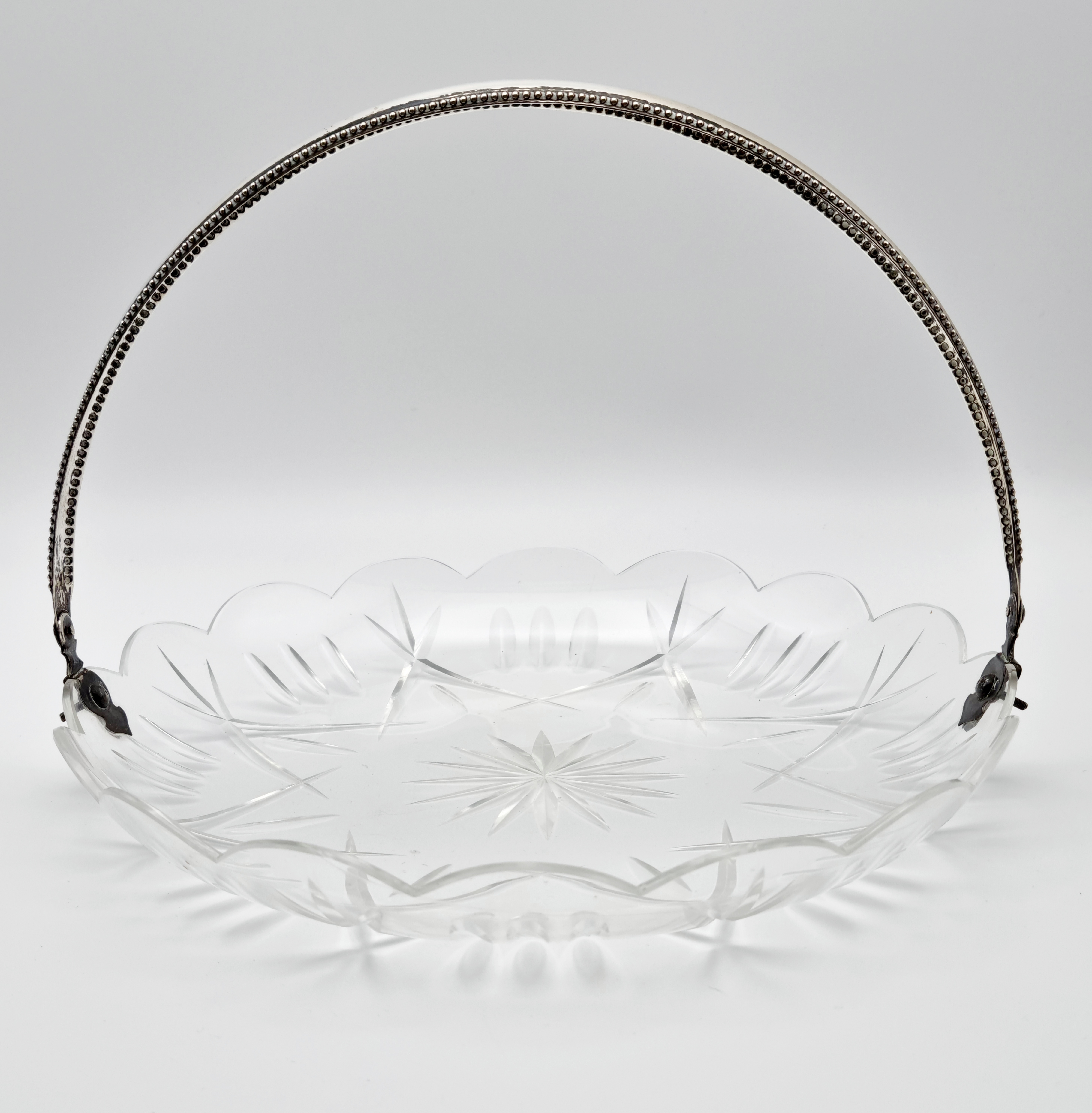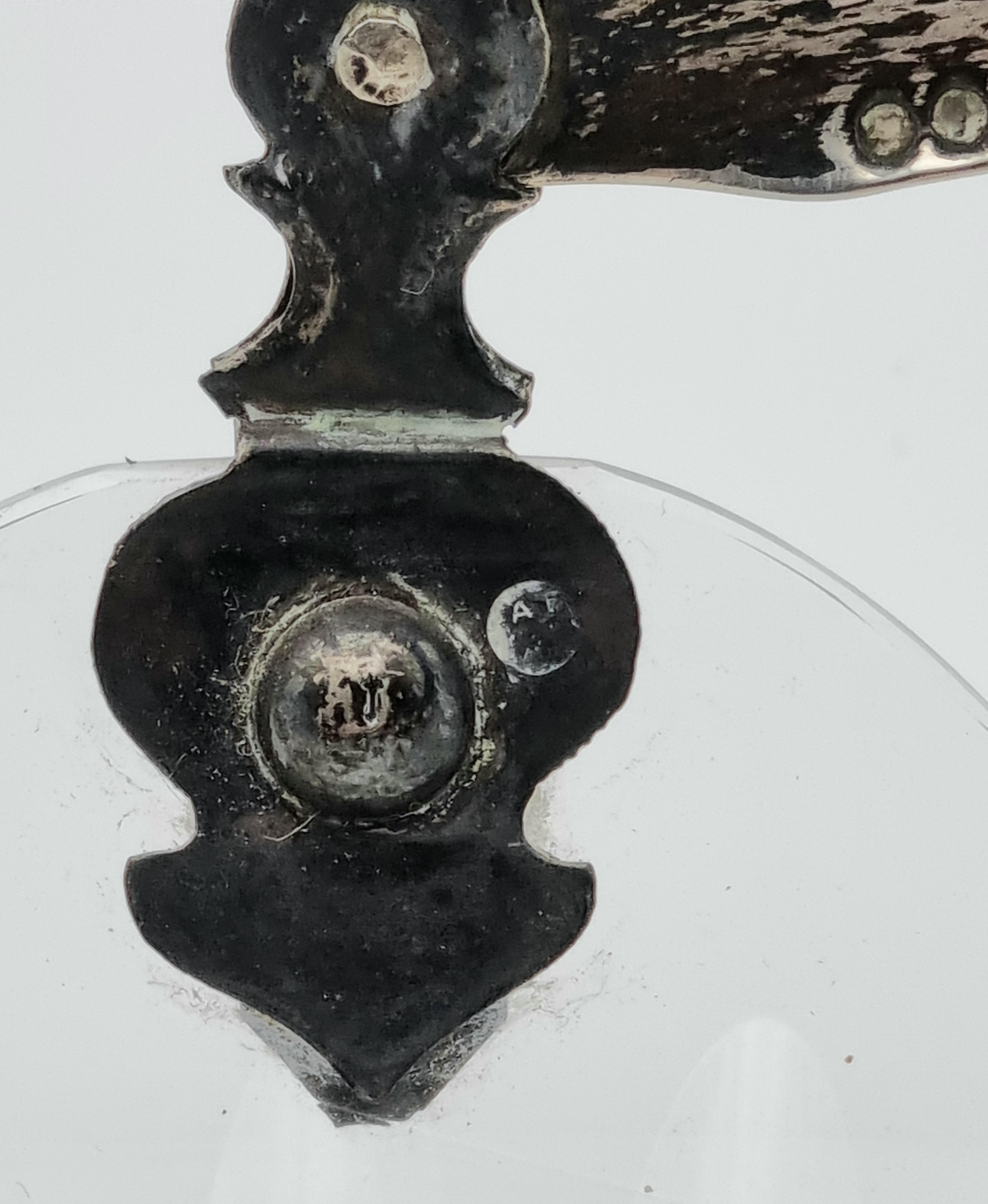 Glazen serveerschaal met zilveren hengsel, gemerkt lopende leeuw 2, meesterteken, minerevakop met A (Amsterdam) en jaarletter W (1931). Hierbij twee kristallen bonbonnières met zilveren voet, gemerkt met meesterteken CS6 en zwaardje. 20e eeuw. |