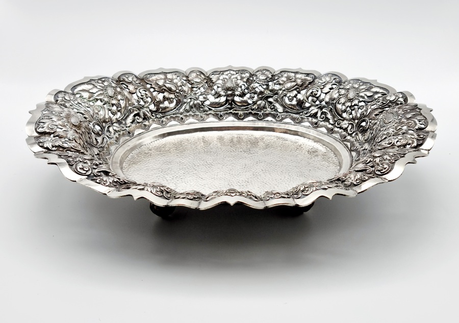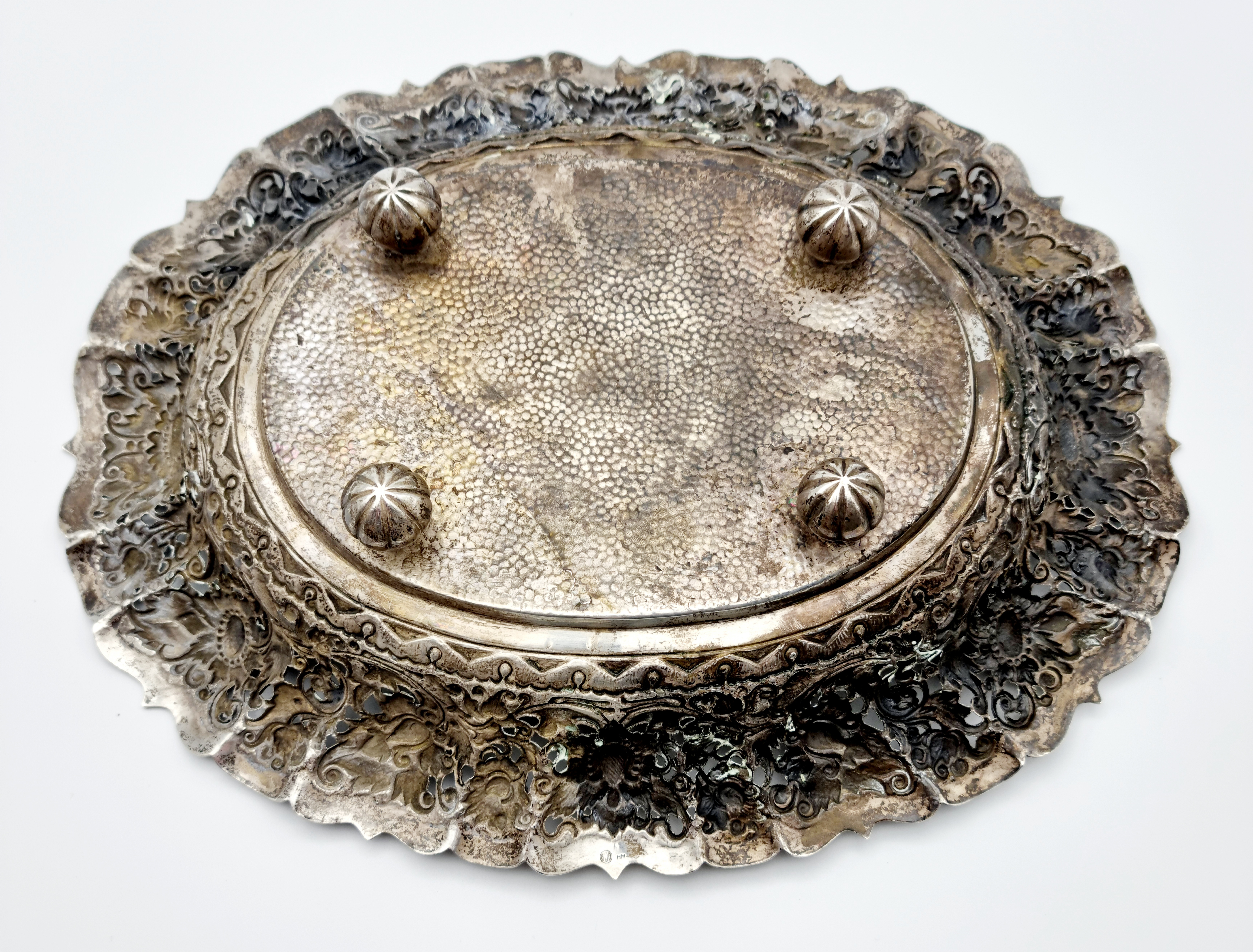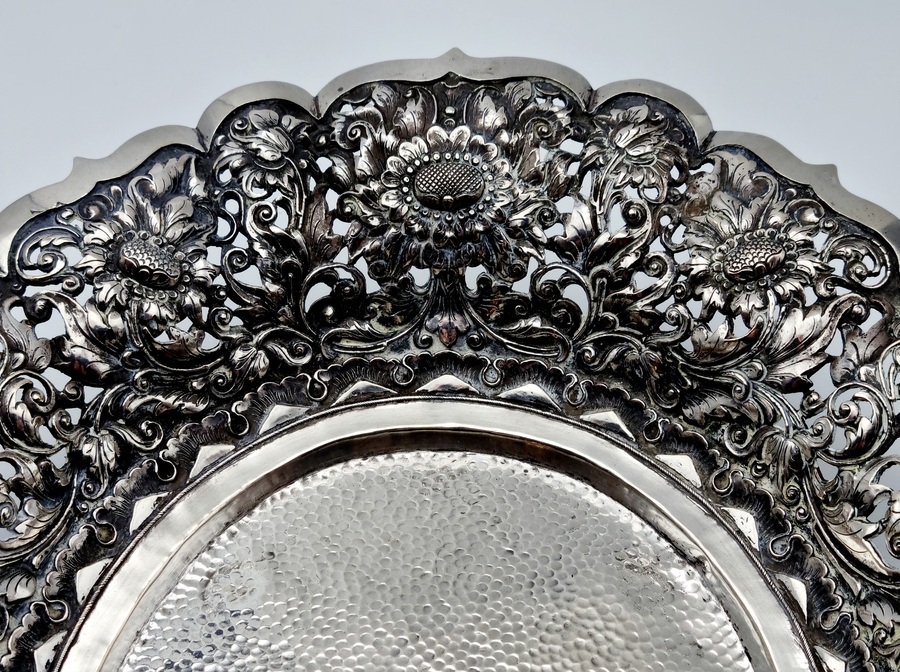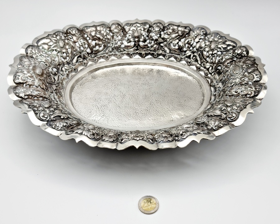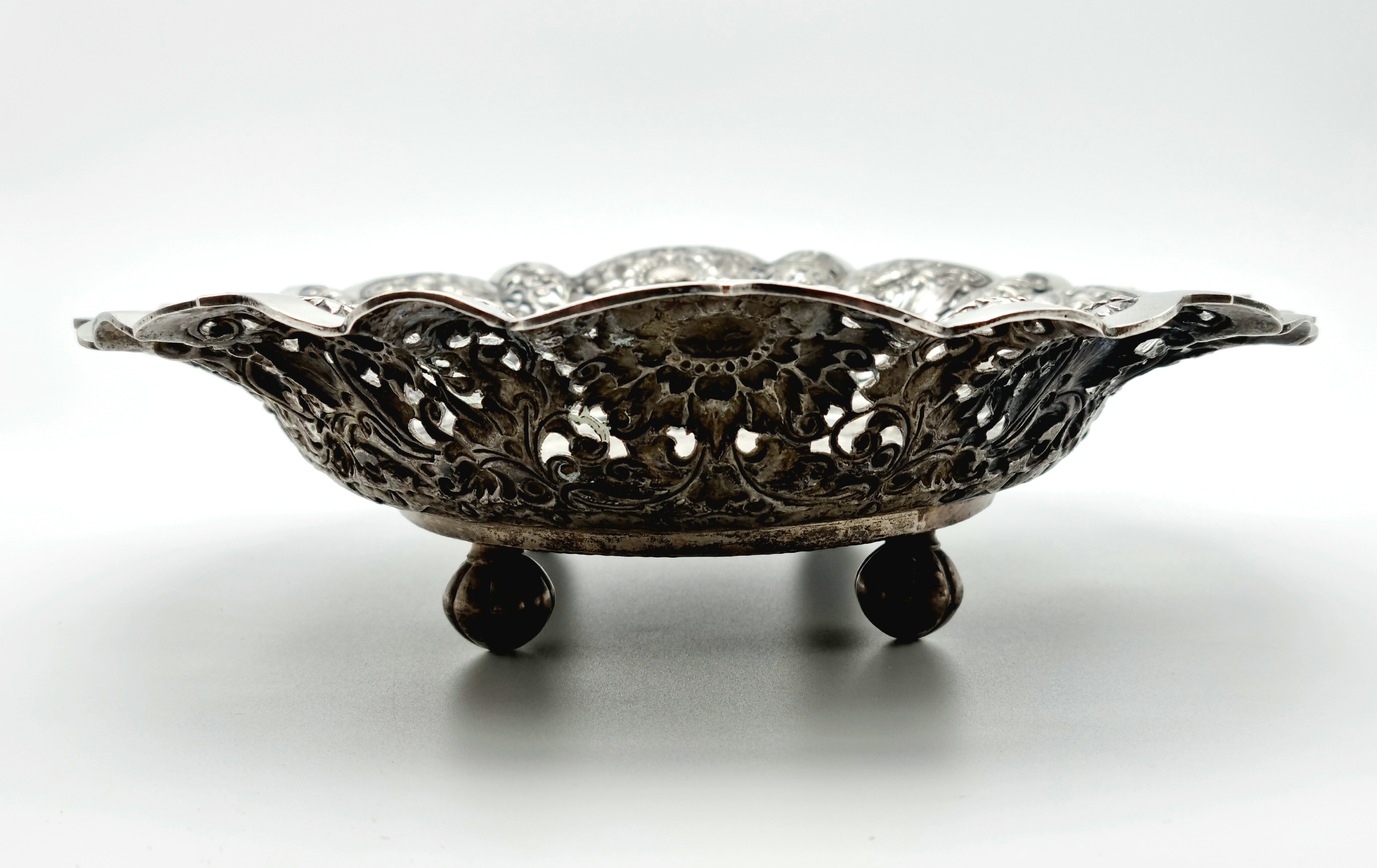 Djokja zilveren broodschaal met ajour bewerkte florale rand op bolpootjes. Gemerkt aan de onderzijde met meesterteken HM (H. Moedakir) en 800. |