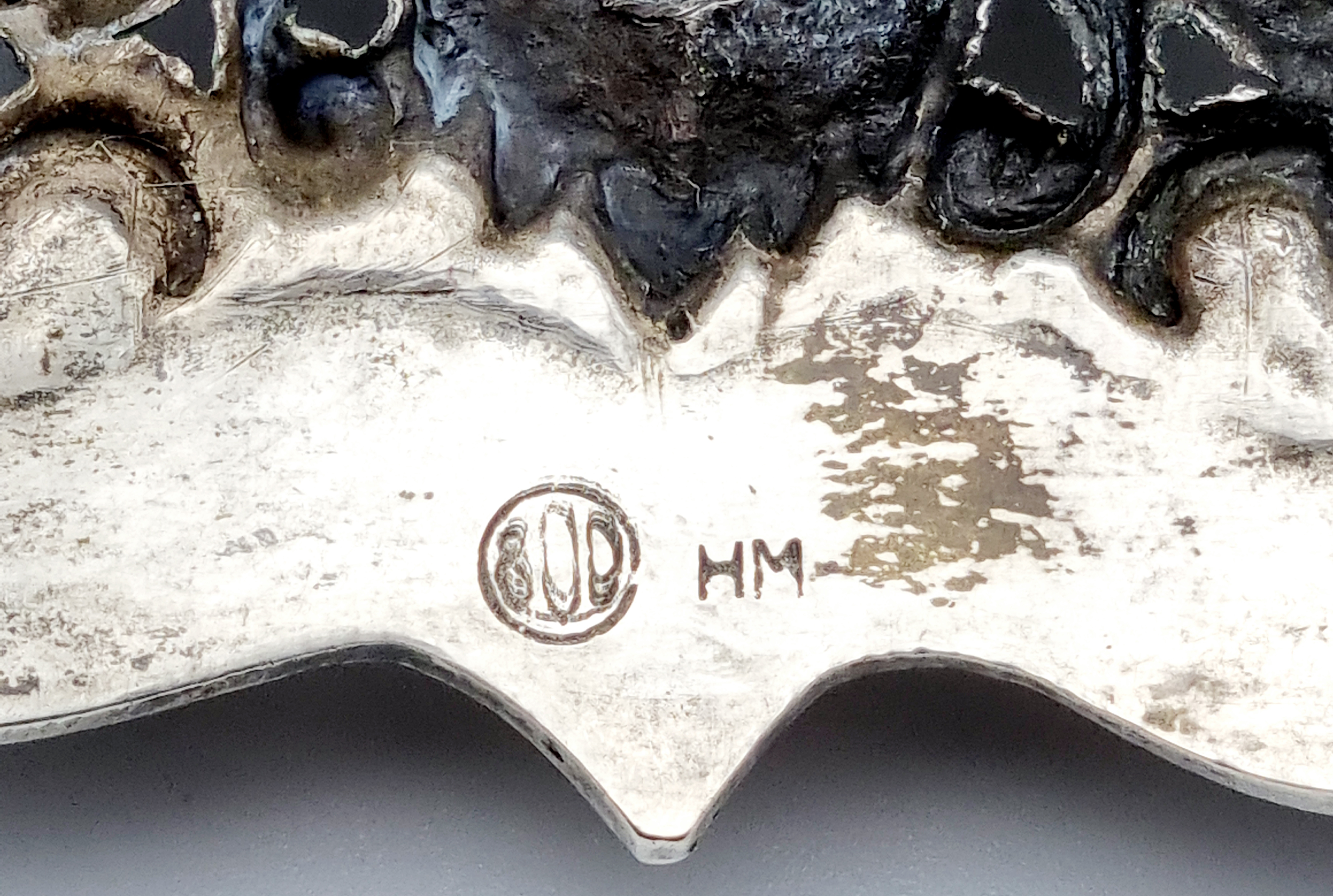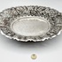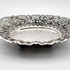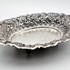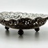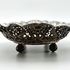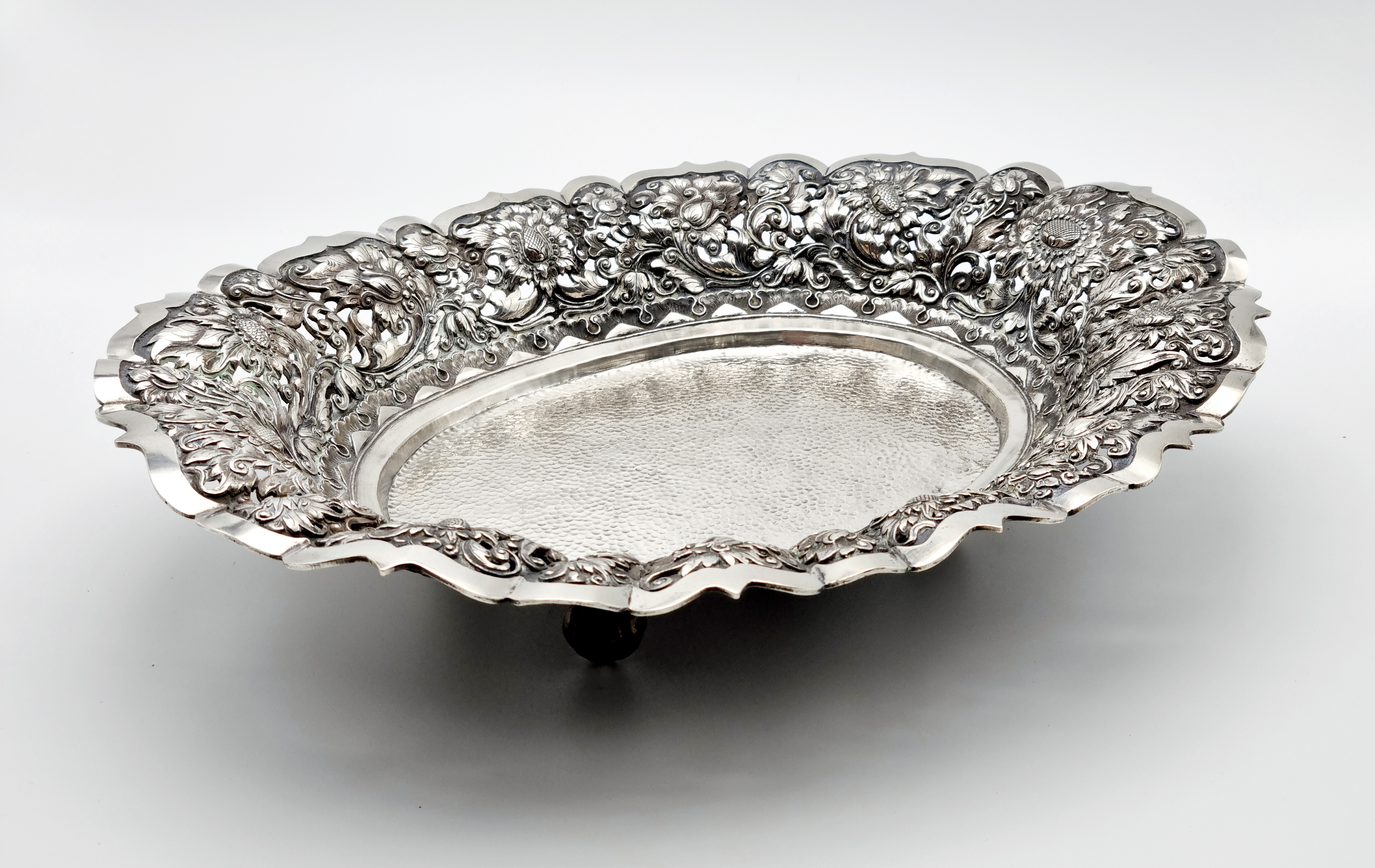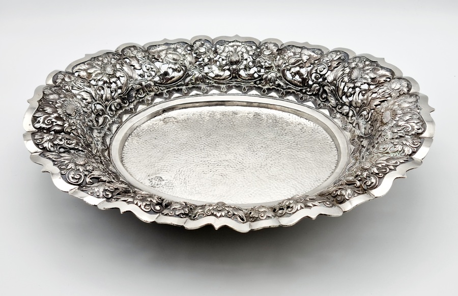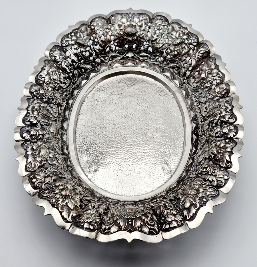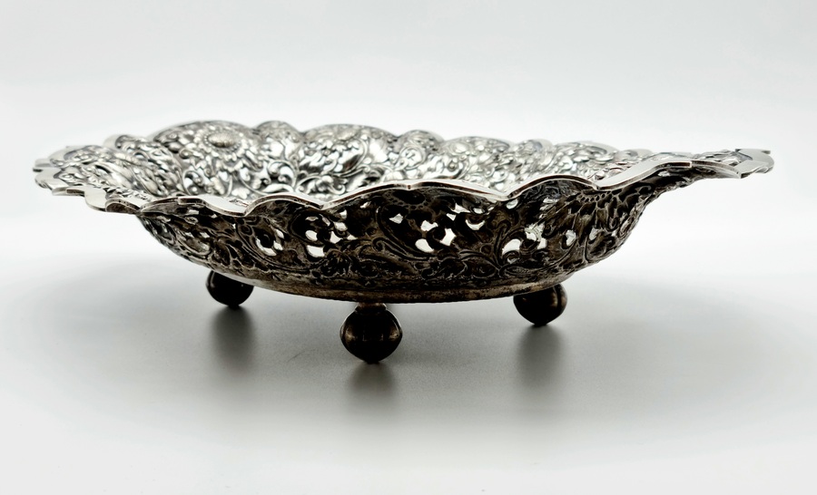 Djokja zilveren broodschaal met ajour bewerkte florale rand op bolpootjes. Gemerkt aan de onderzijde met meesterteken HM (H. Moedakir) en 800. |