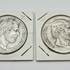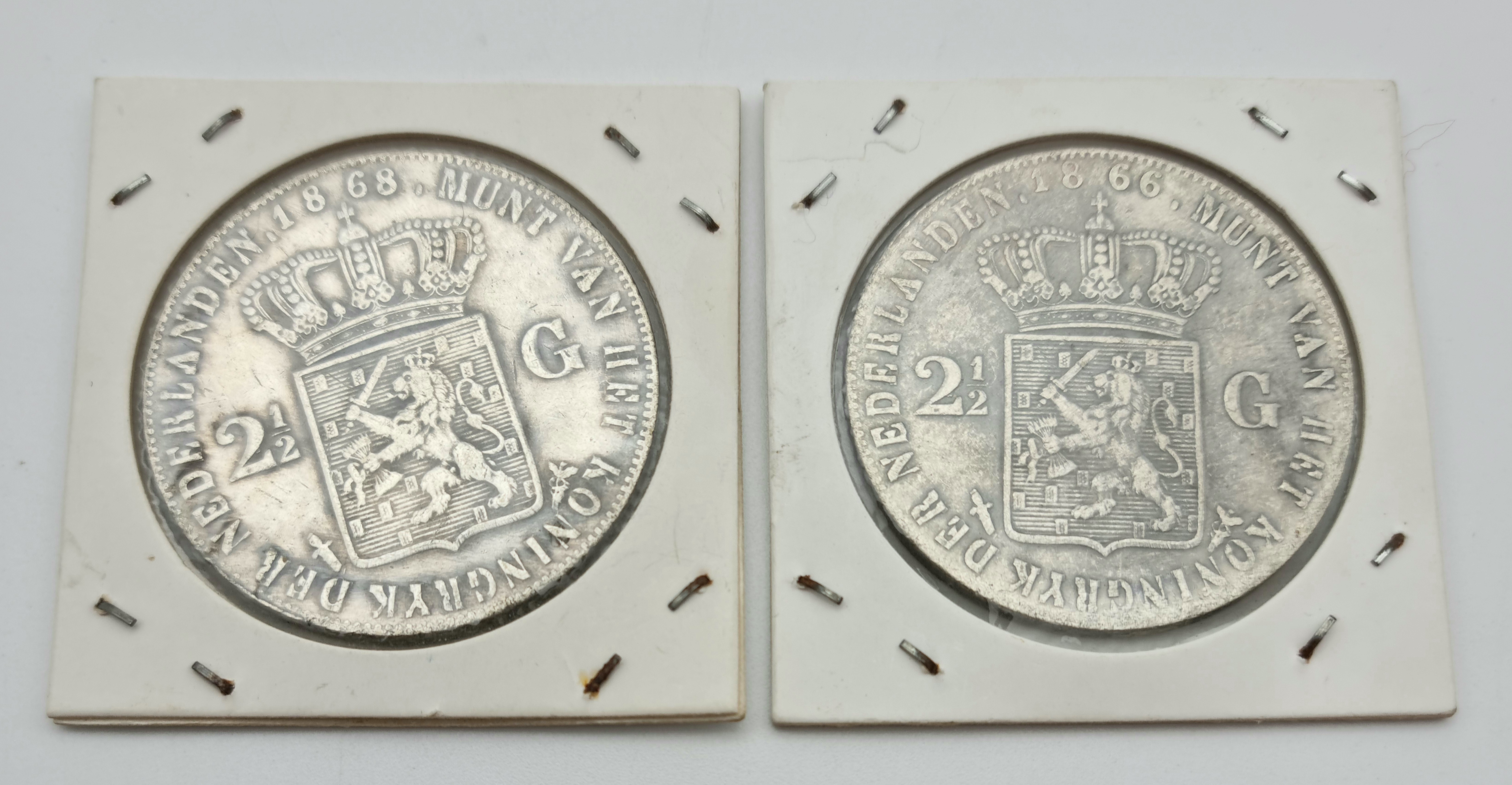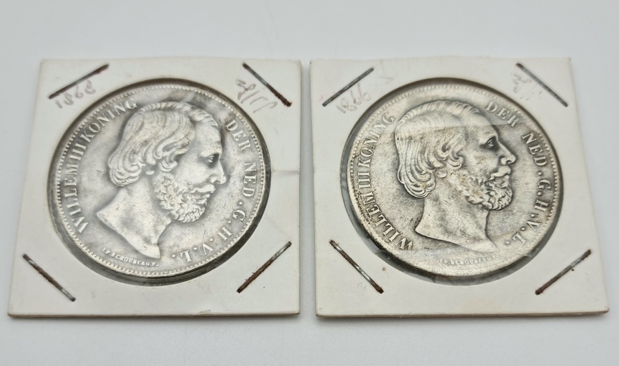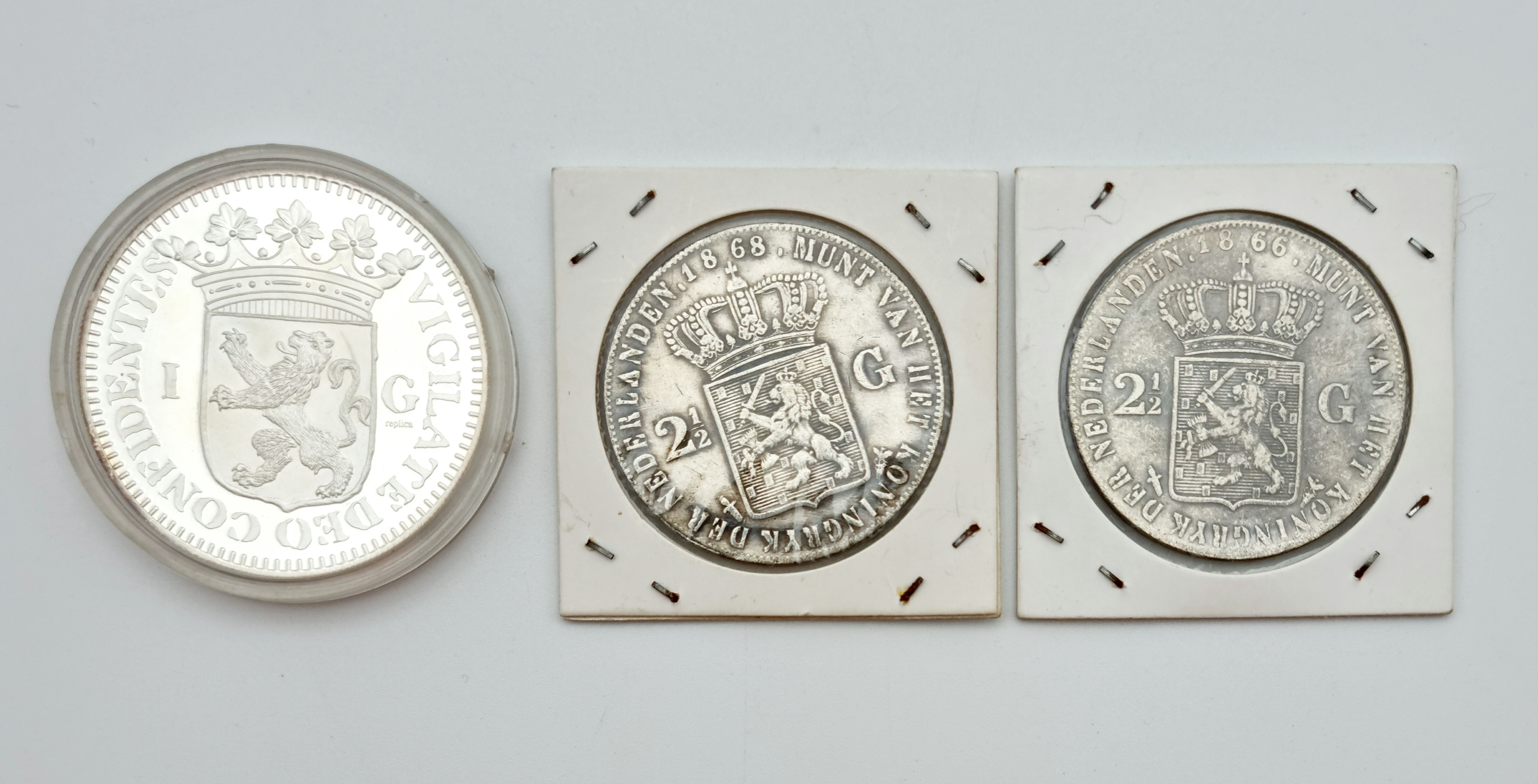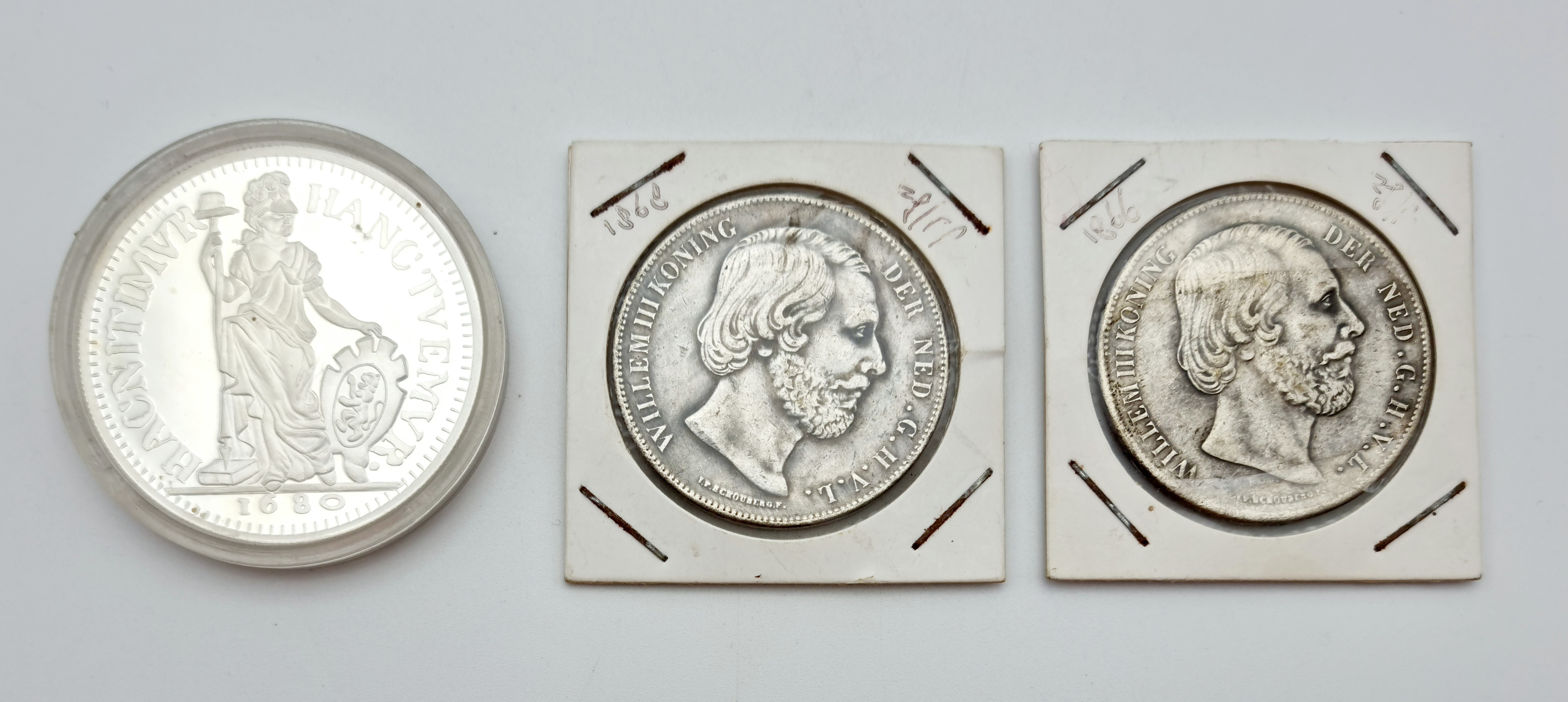 Twee zilveren rijksdaalders Koning Willem III uit 1866 en 1868 en een zilveren (925/1000) replica van 1 gulden uit 1680. |