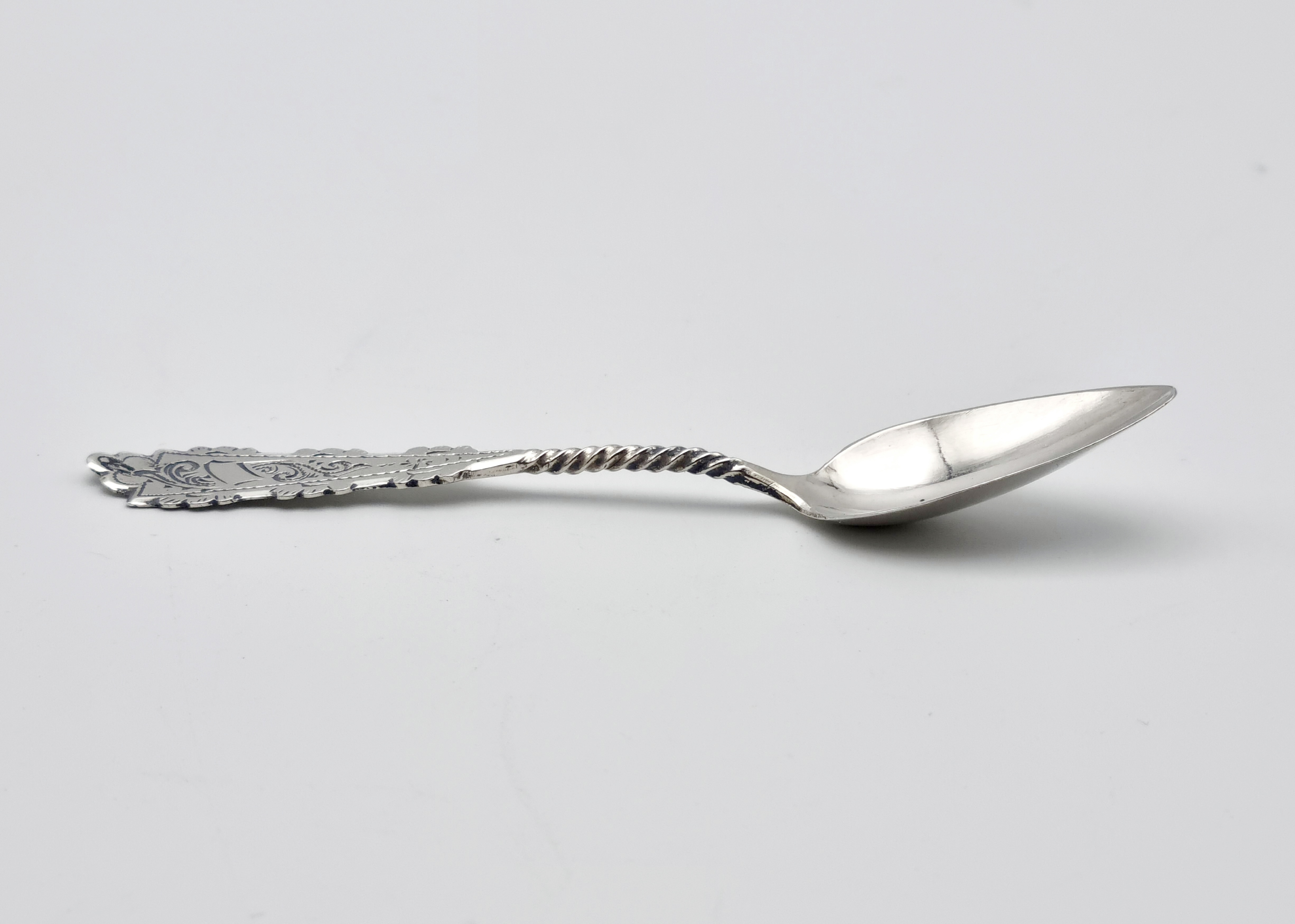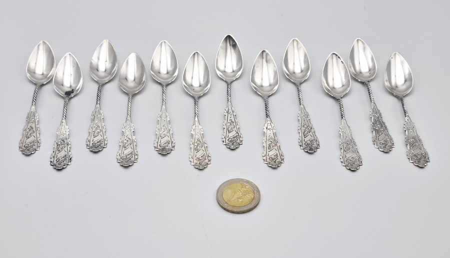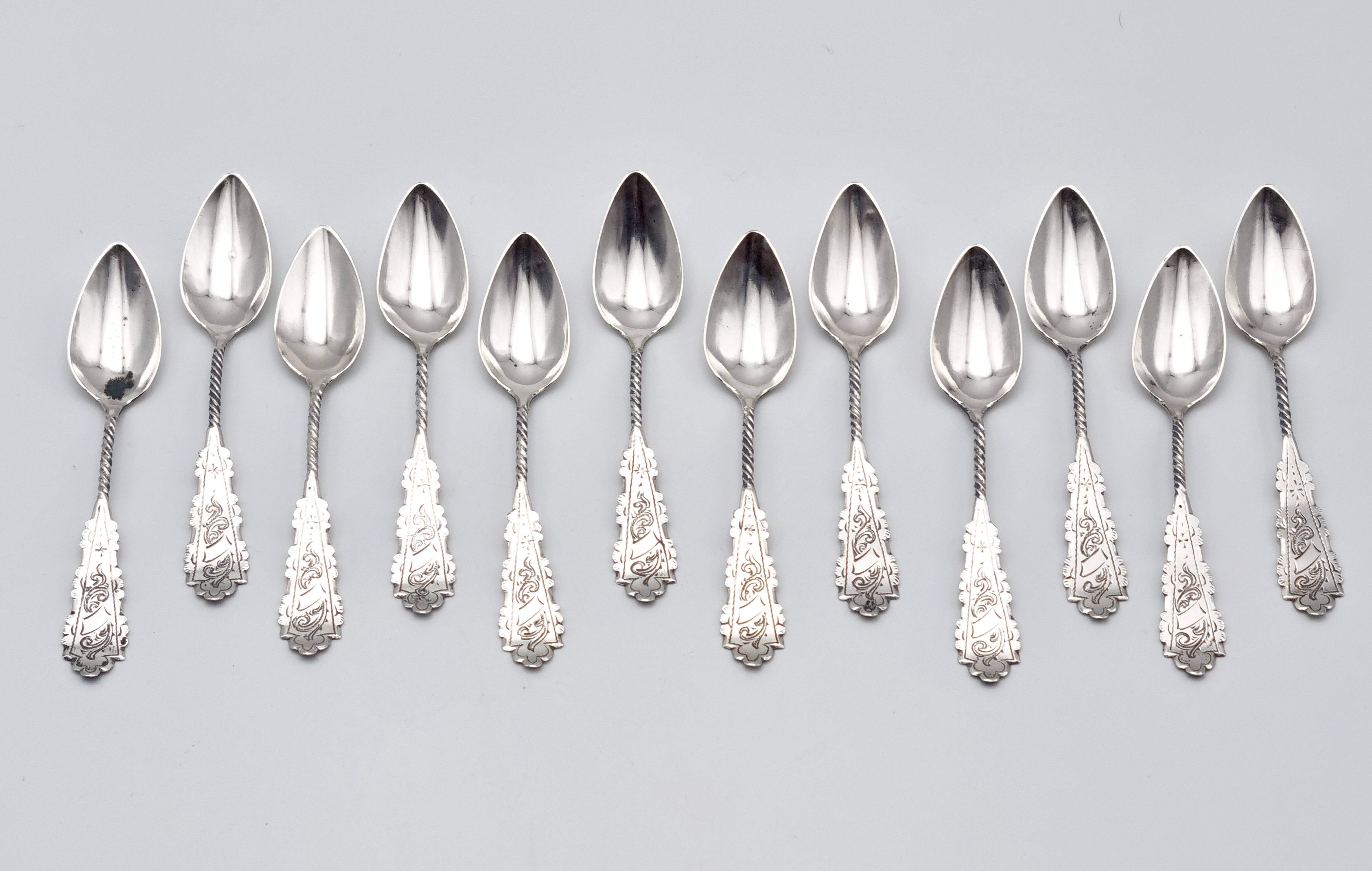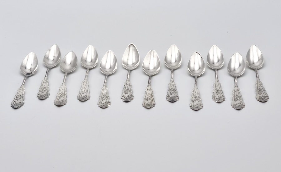 Twaalf zilveren theelepels met getorste steel en heft welke is voorzien van Biedermeier graveerwerk. De lepeltjes zijn uitgevoerd in het model Hanenkam. Gemerkt zwaardje en meesterkeur PS, 20e eeuw. |