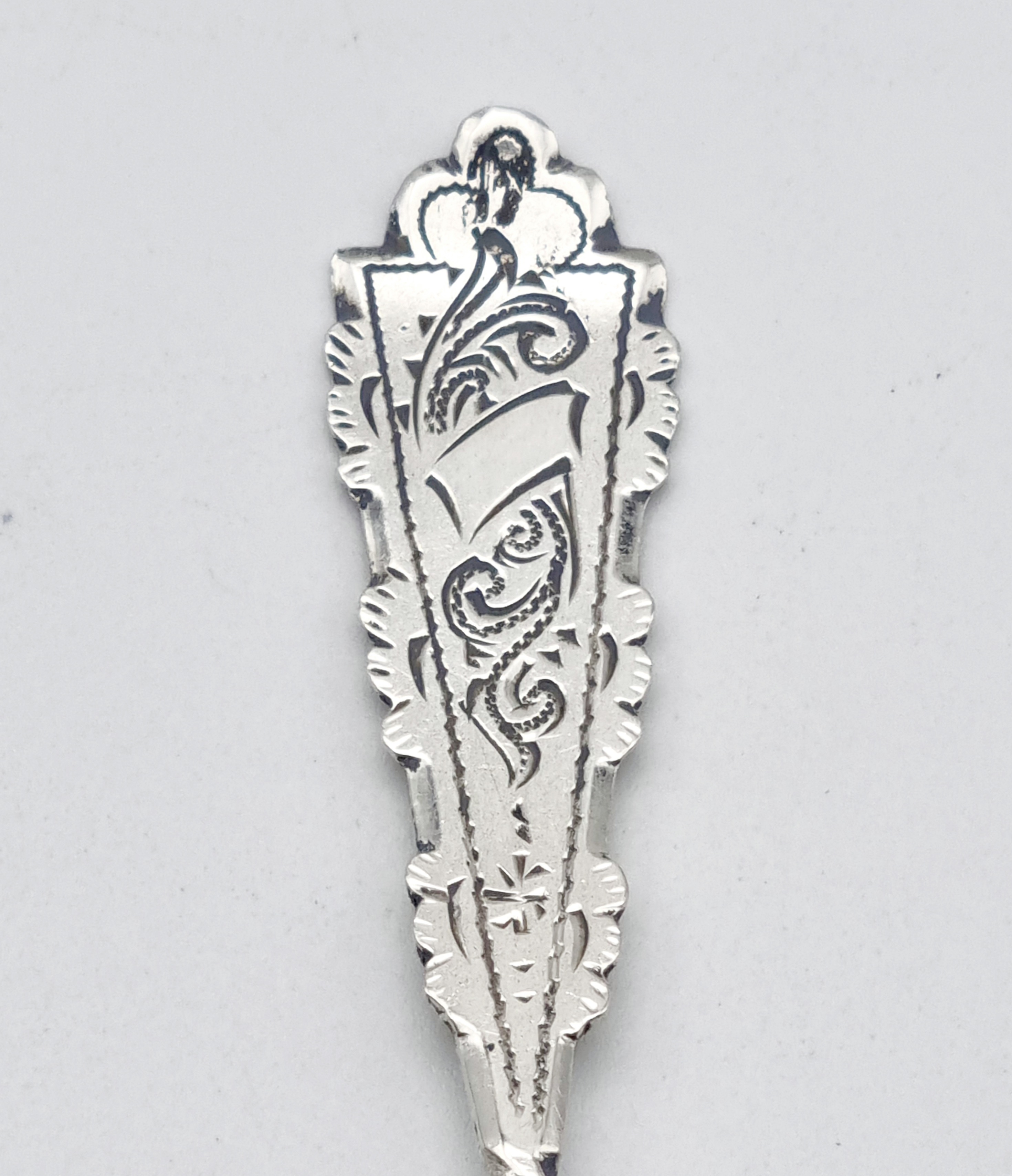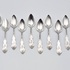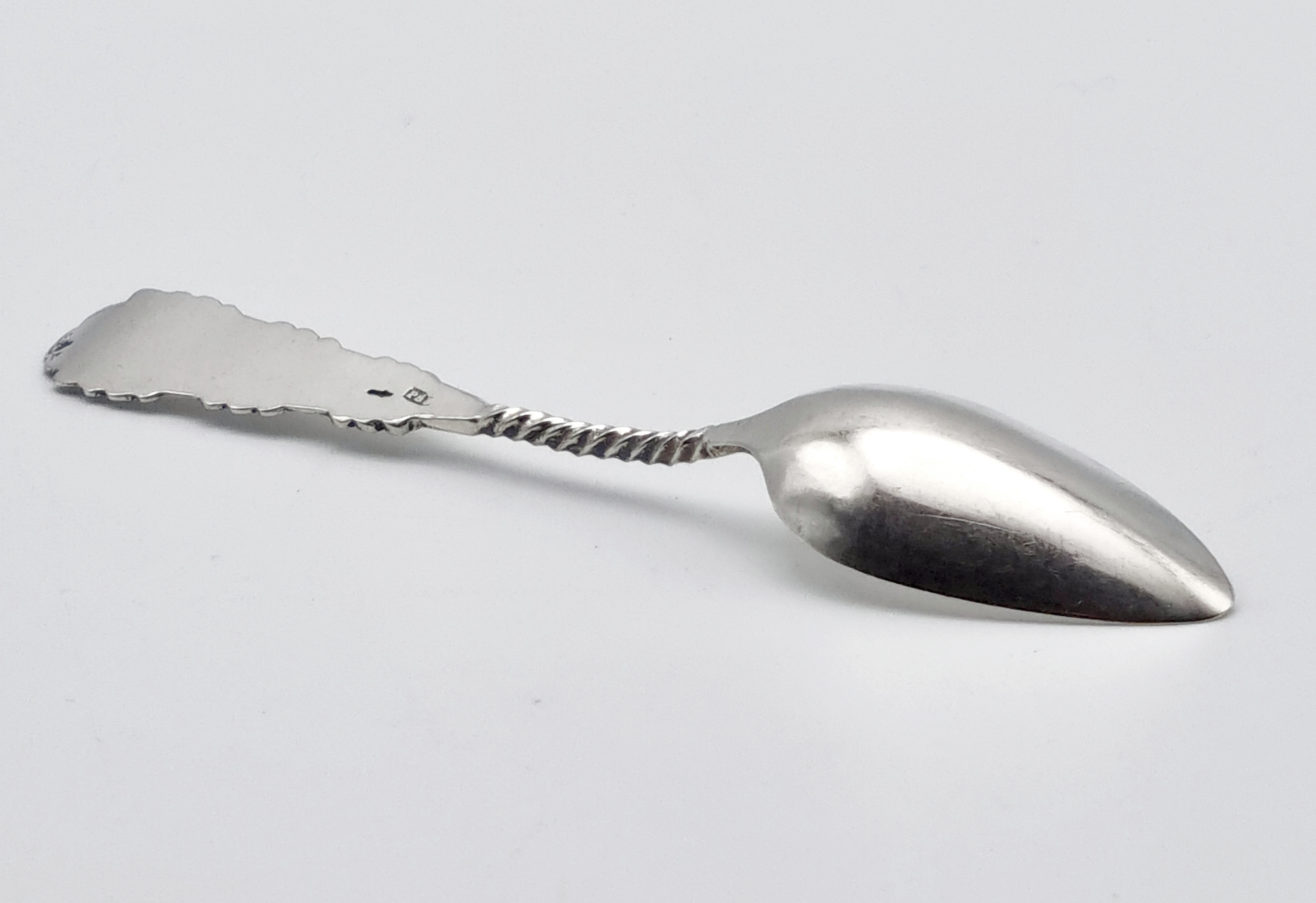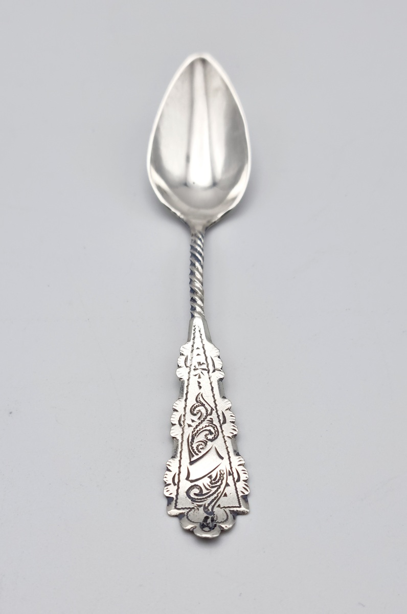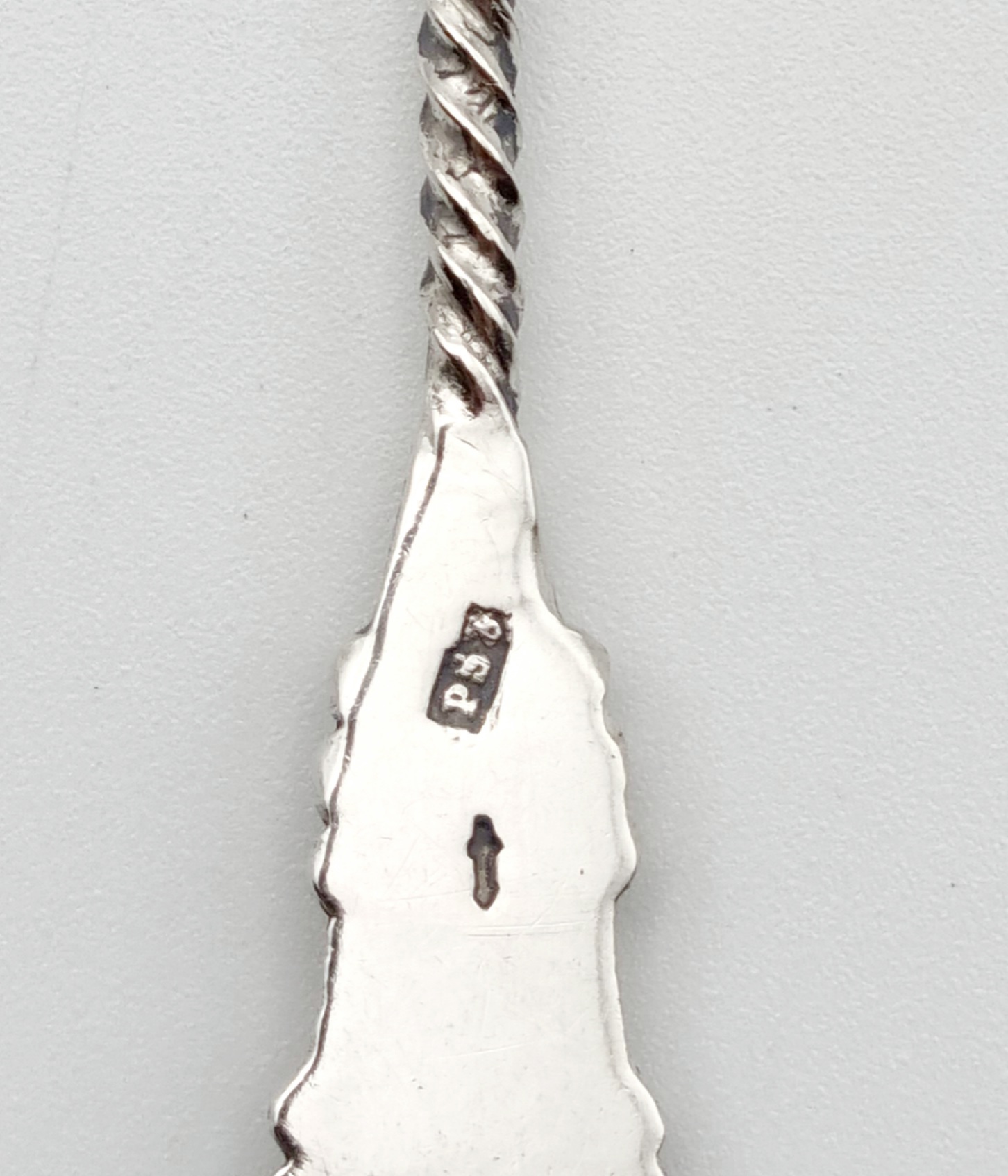 Twaalf zilveren theelepels met getorste steel en heft welke is voorzien van Biedermeier graveerwerk. De lepeltjes zijn uitgevoerd in het model Hanenkam. Gemerkt zwaardje en meesterkeur PS, 20e eeuw. |