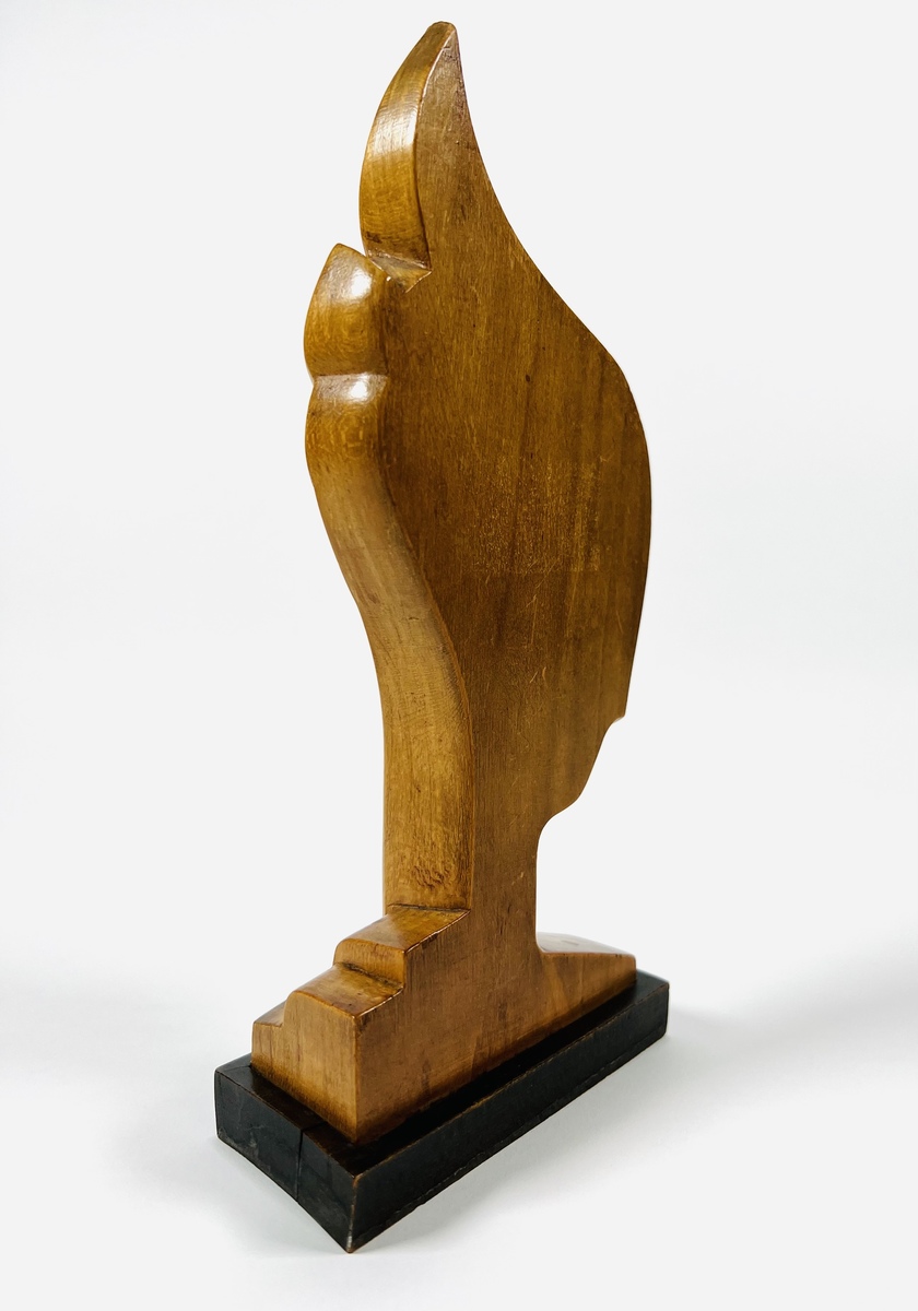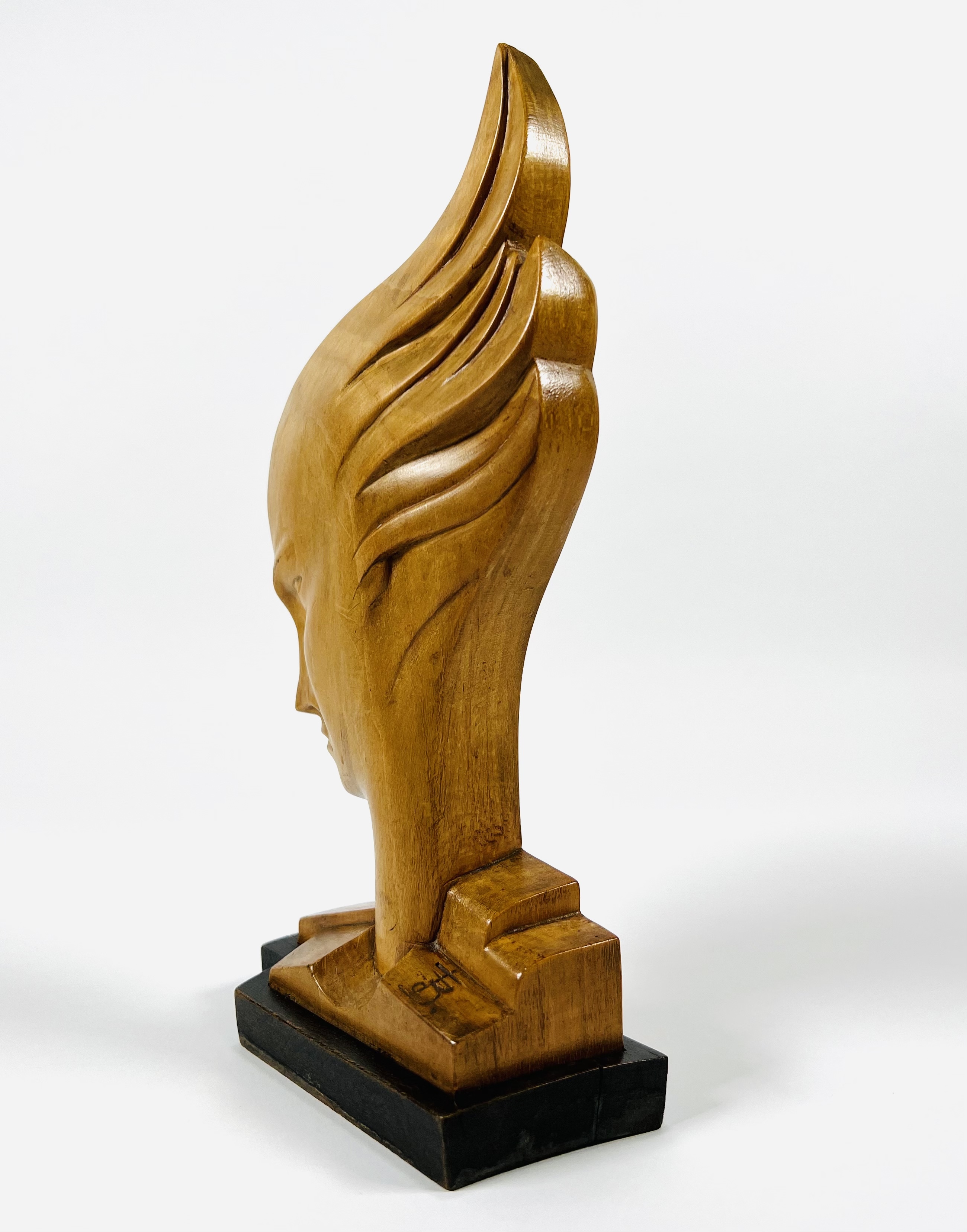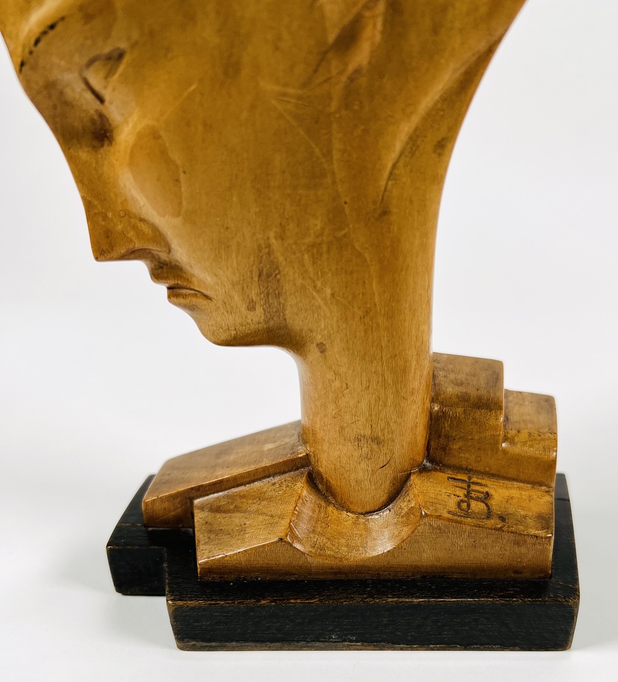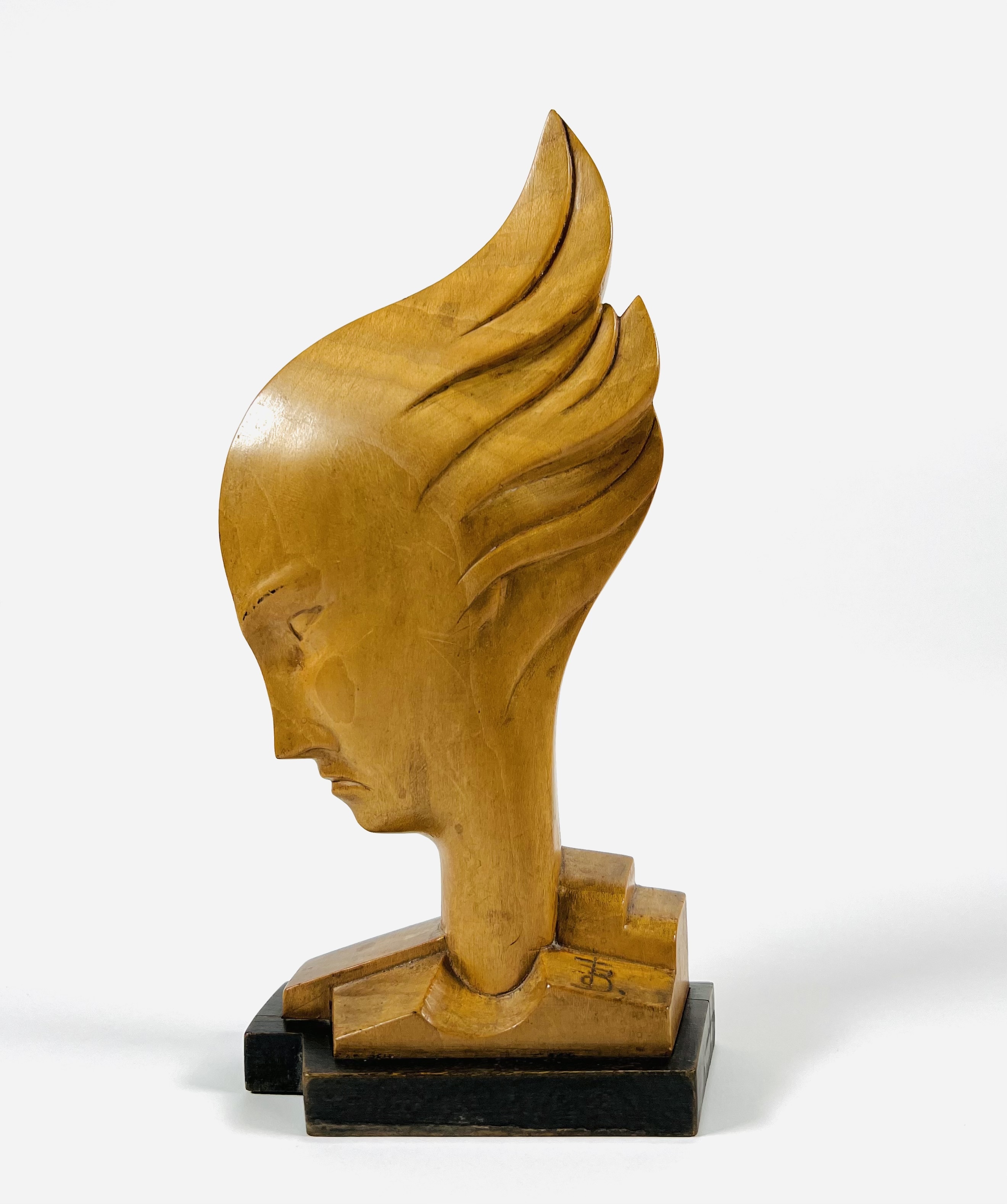 Art Deco futuristische houten sculptuur van een vrouwengezicht en profil met weelderige lokken, Naar Guido Cacciapuoti, beeld is gesigneerd met monogram TdB. Eerste helft 20e eeuw. |