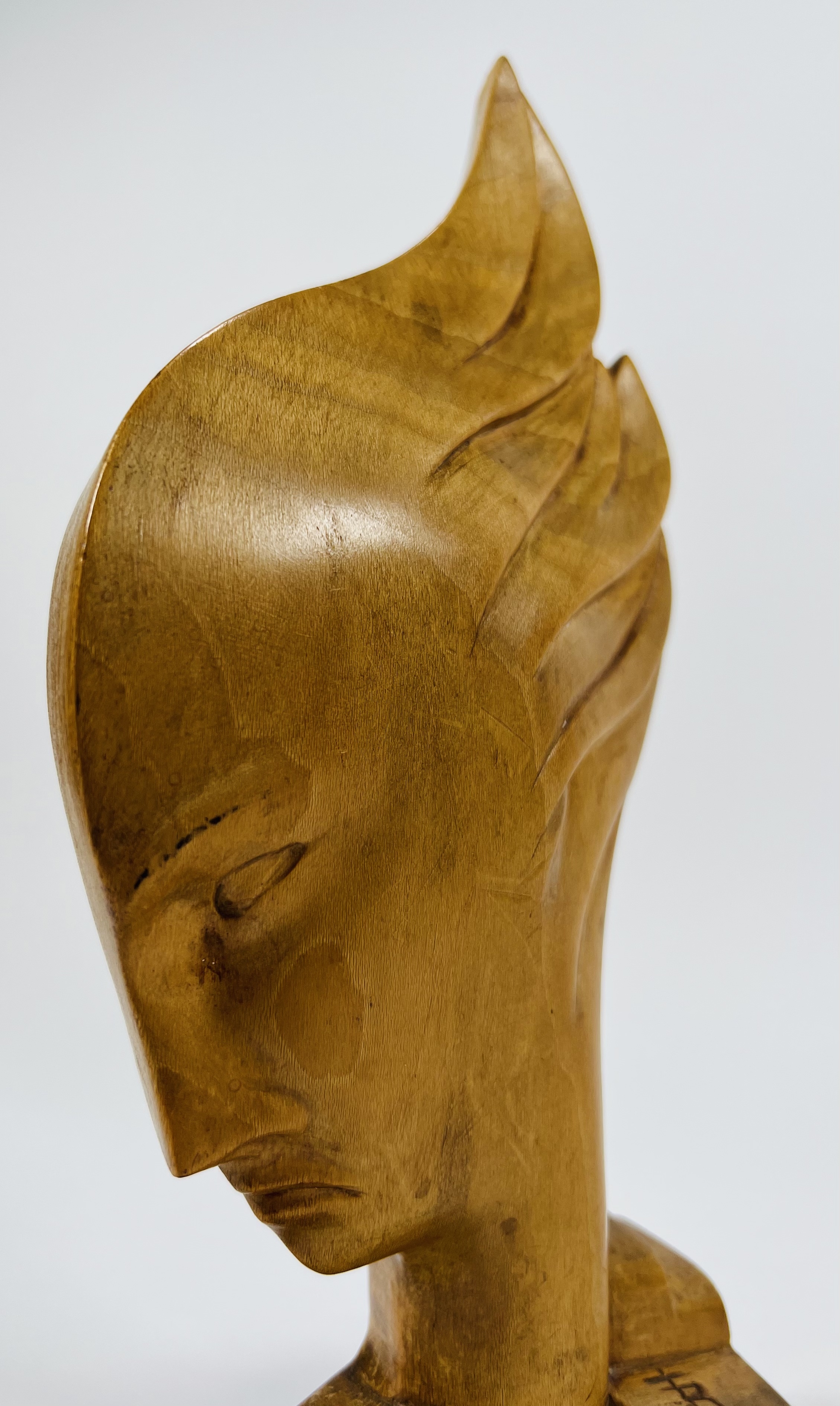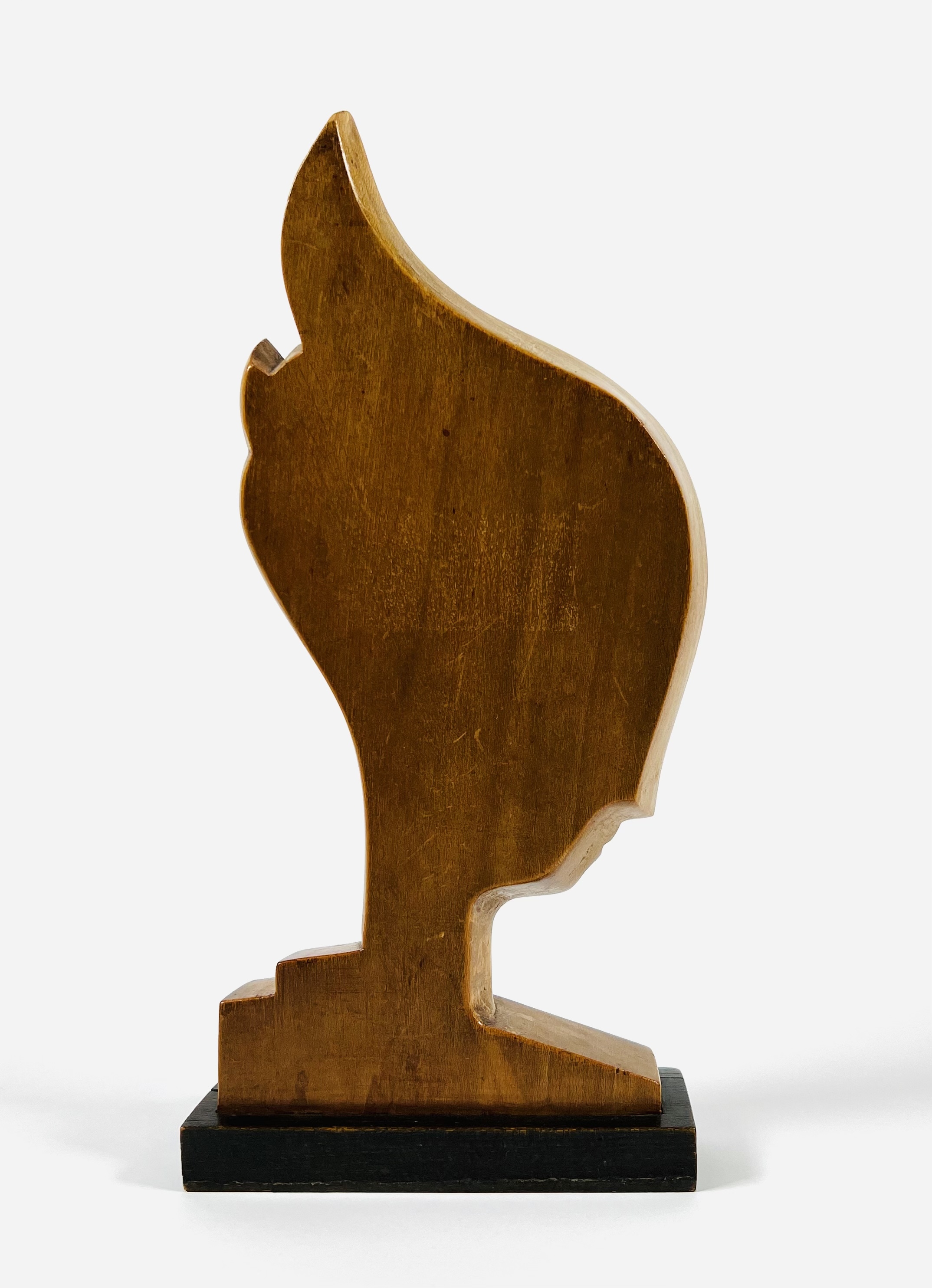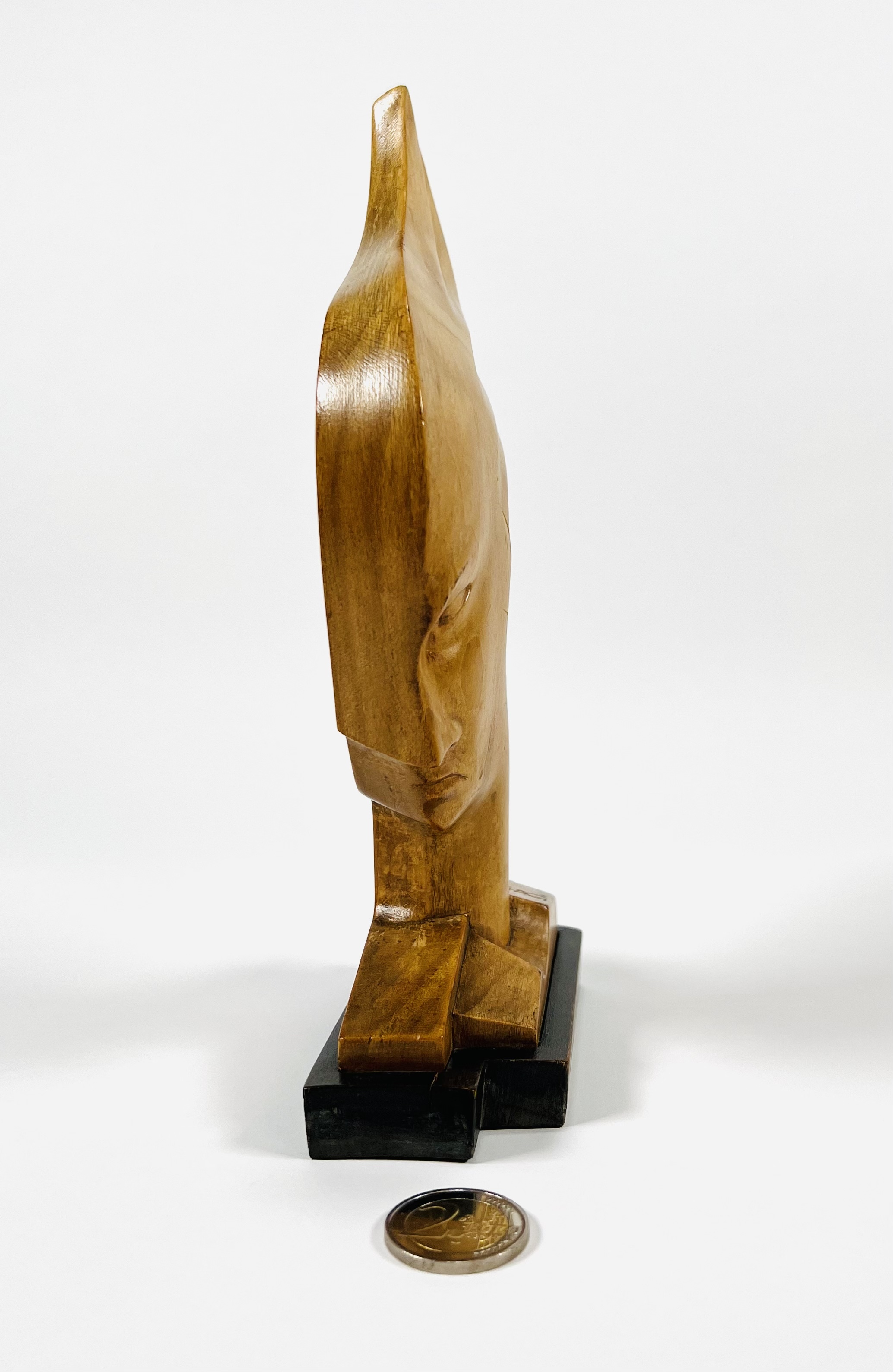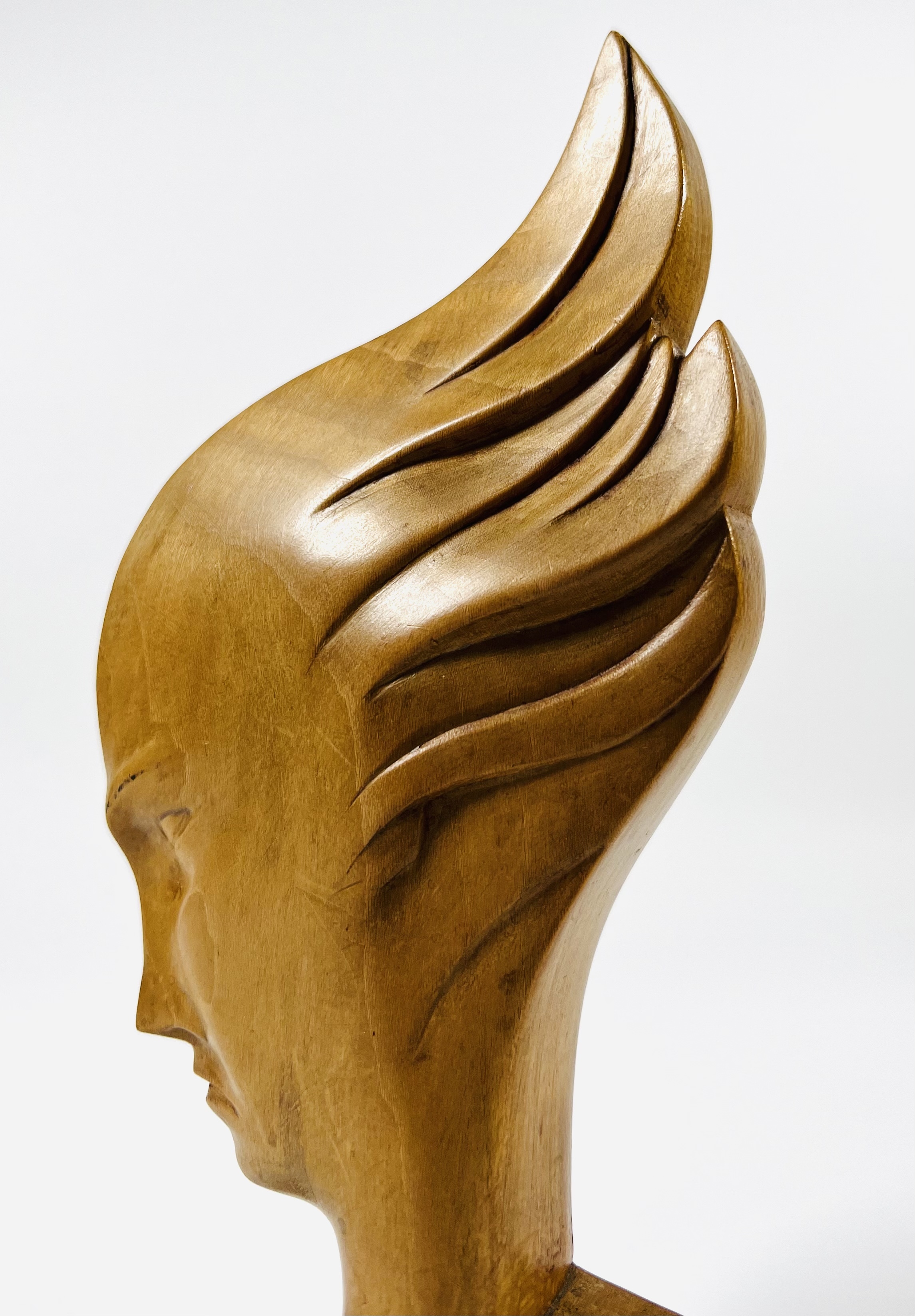 Art Deco futuristische houten sculptuur van een vrouwengezicht en profil met weelderige lokken, Naar Guido Cacciapuoti, beeld is gesigneerd met monogram TdB. Eerste helft 20e eeuw. |