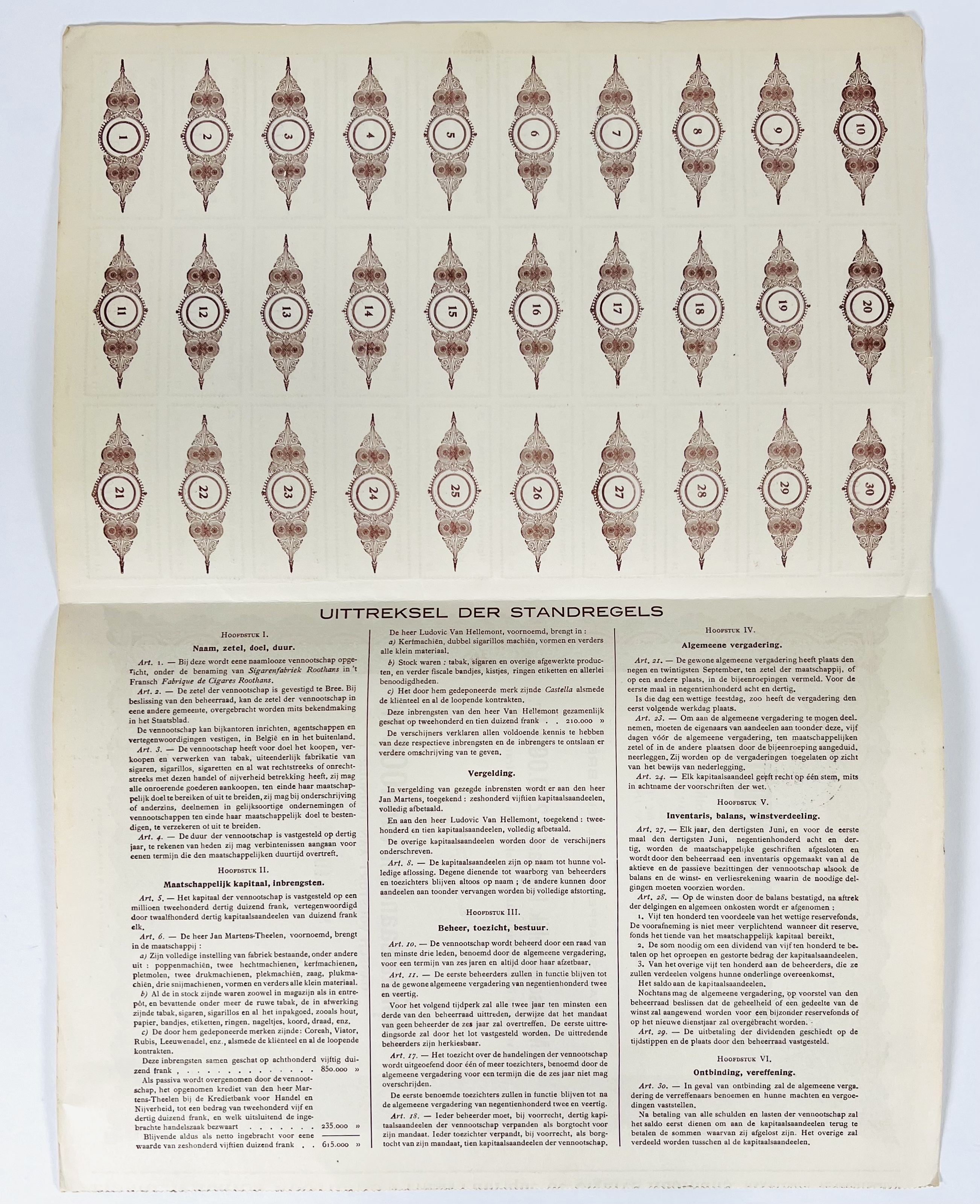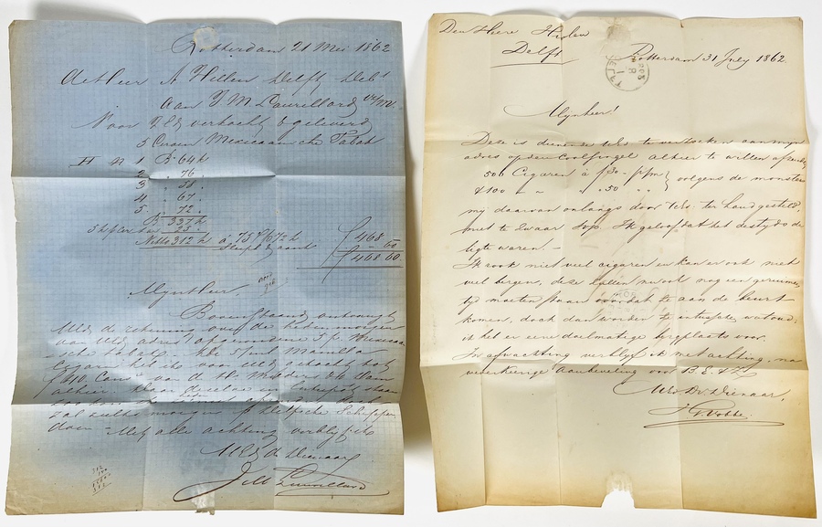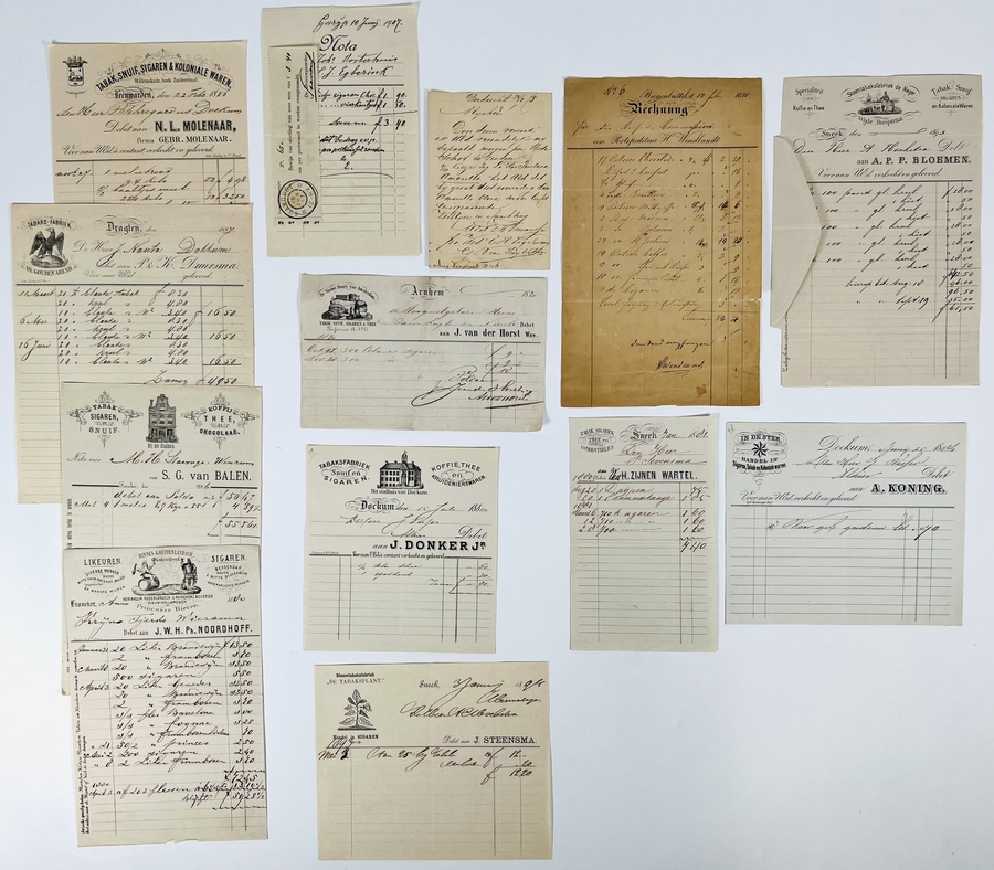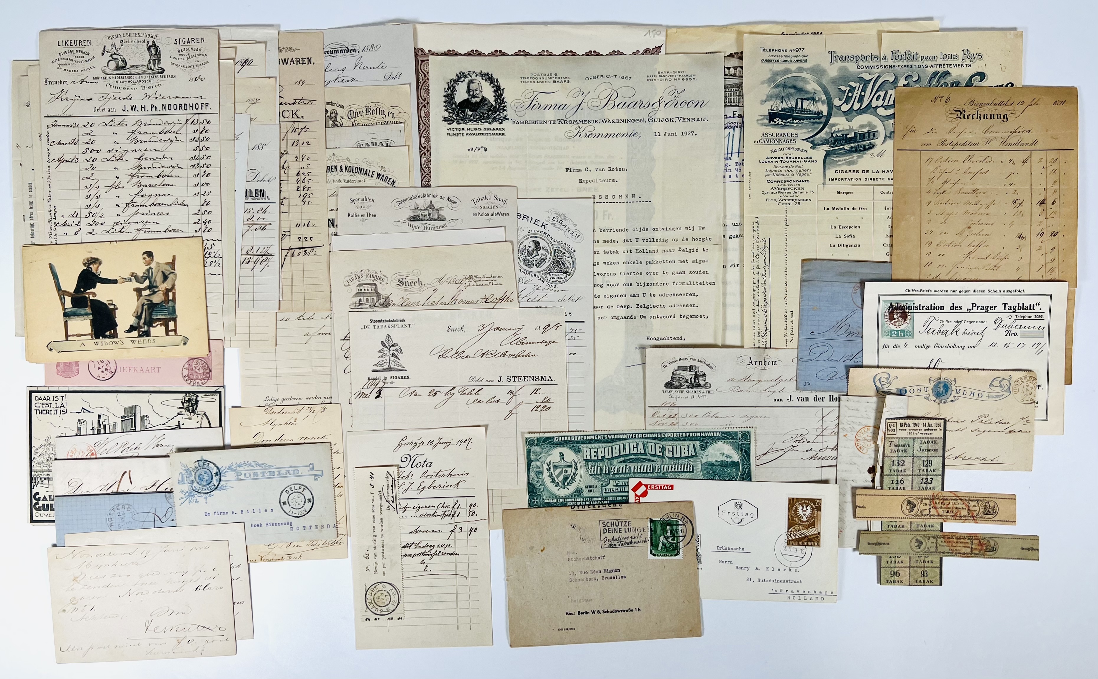 Verzameling met sigaren parafernalia waaronder Belgische-en Nederlandse correspondentie vanaf 1862, reclame uitingen, couponblad Sigarenfabriek NV Roothans en facturen. 19e/20e eeuw. |
