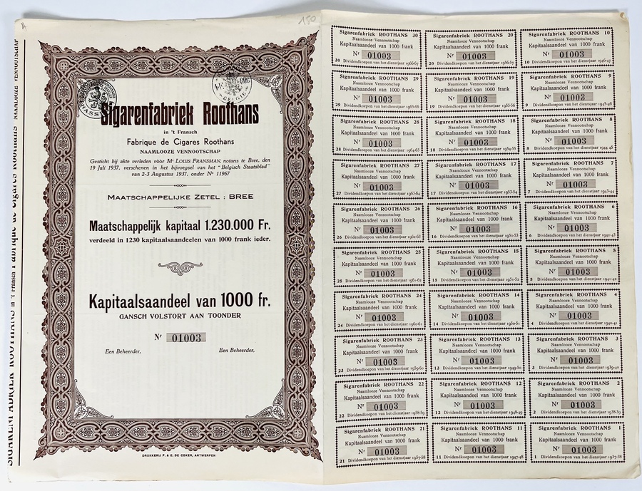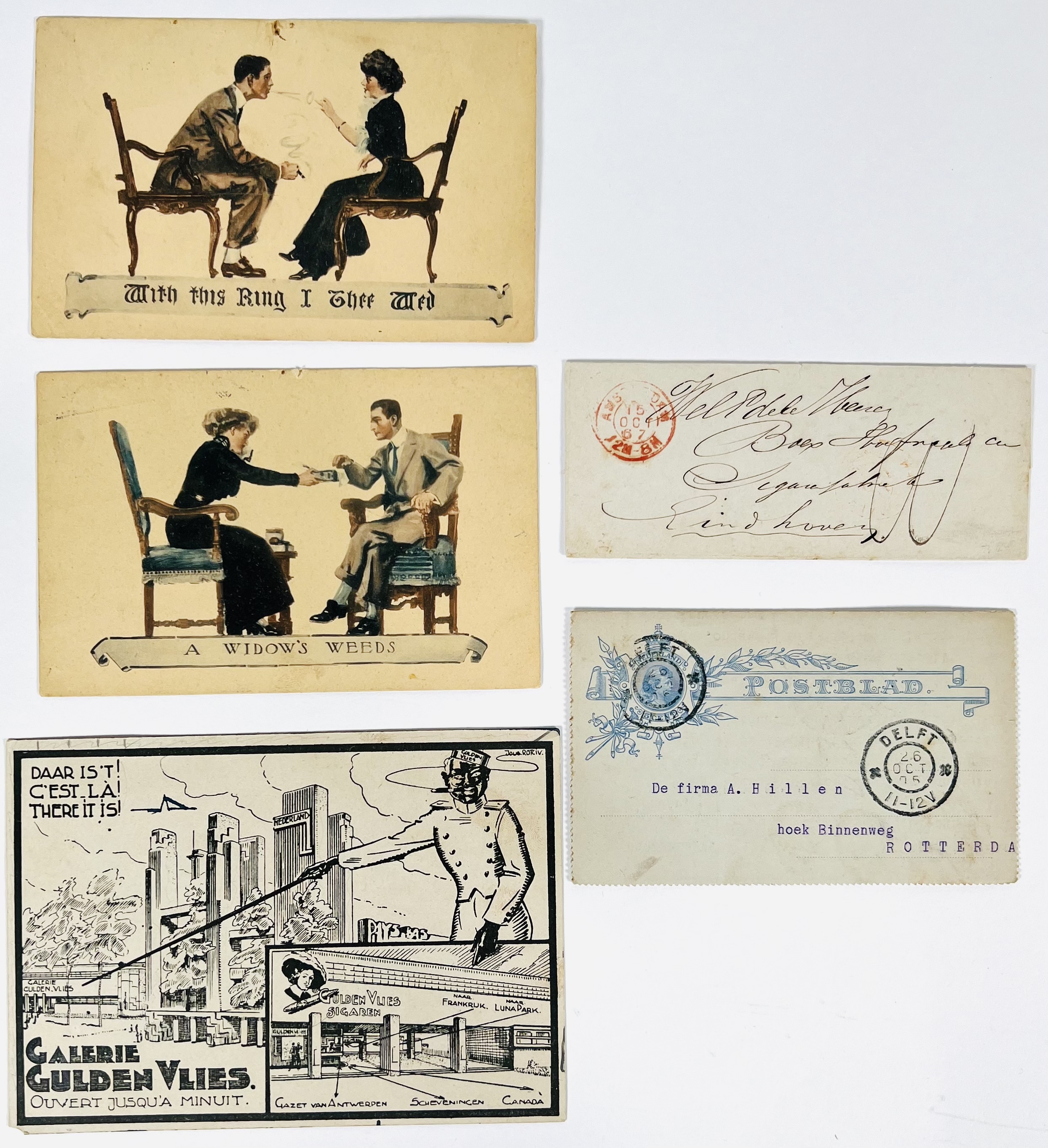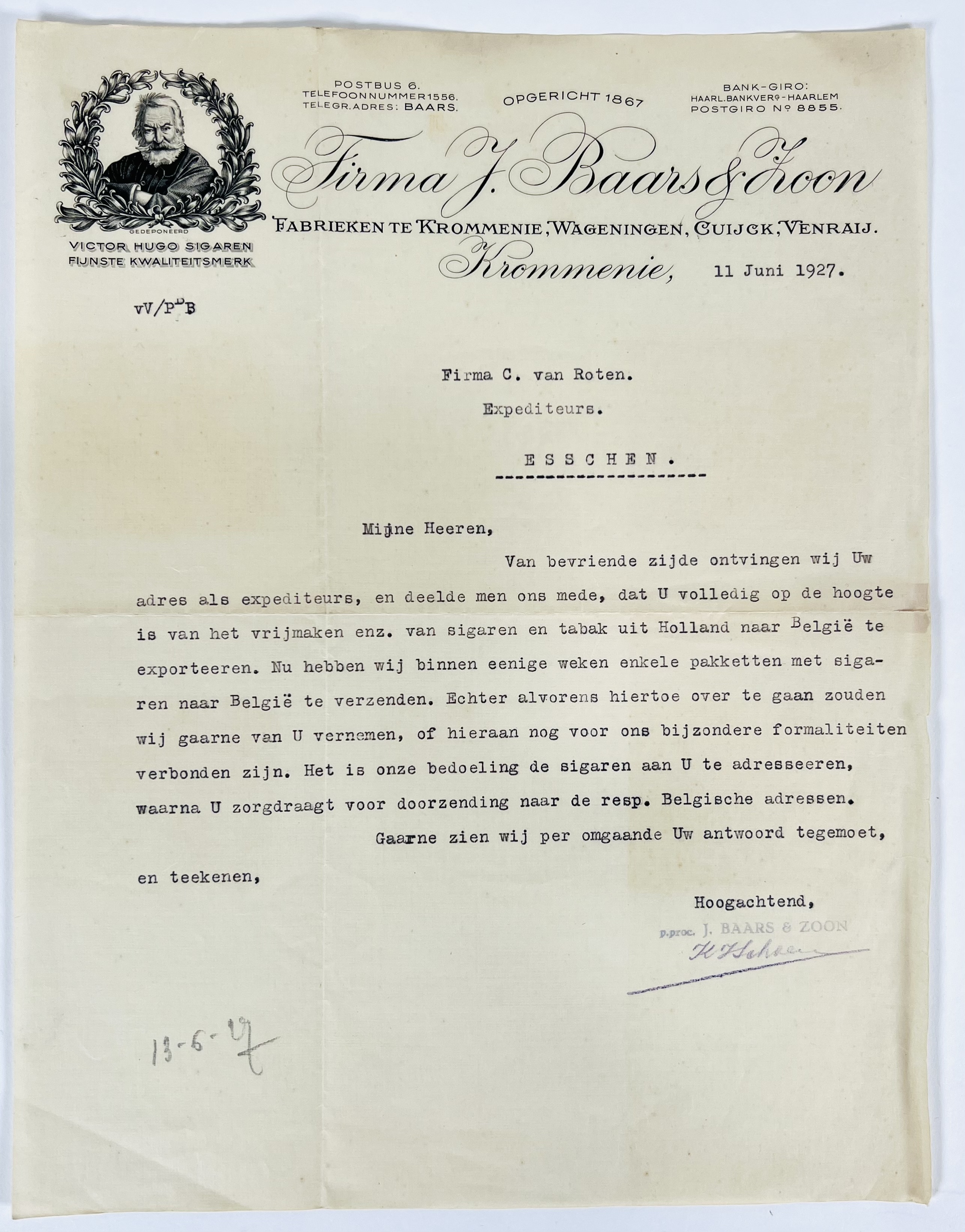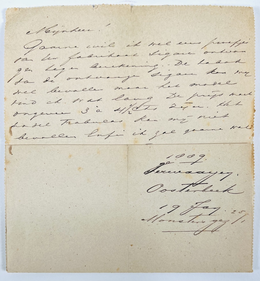 Verzameling met sigaren parafernalia waaronder Belgische-en Nederlandse correspondentie vanaf 1862, reclame uitingen, couponblad Sigarenfabriek NV Roothans en facturen. 19e/20e eeuw. |