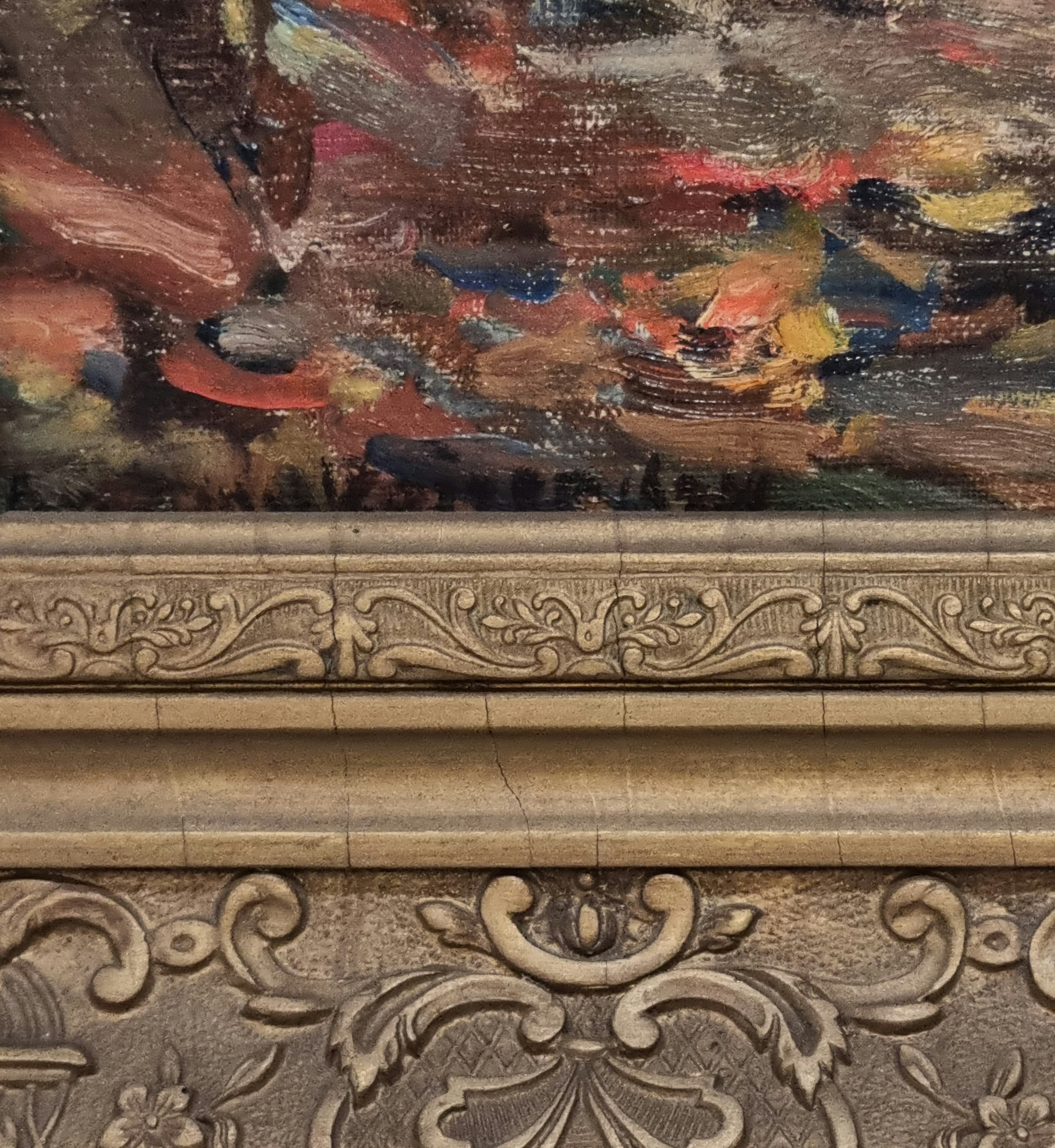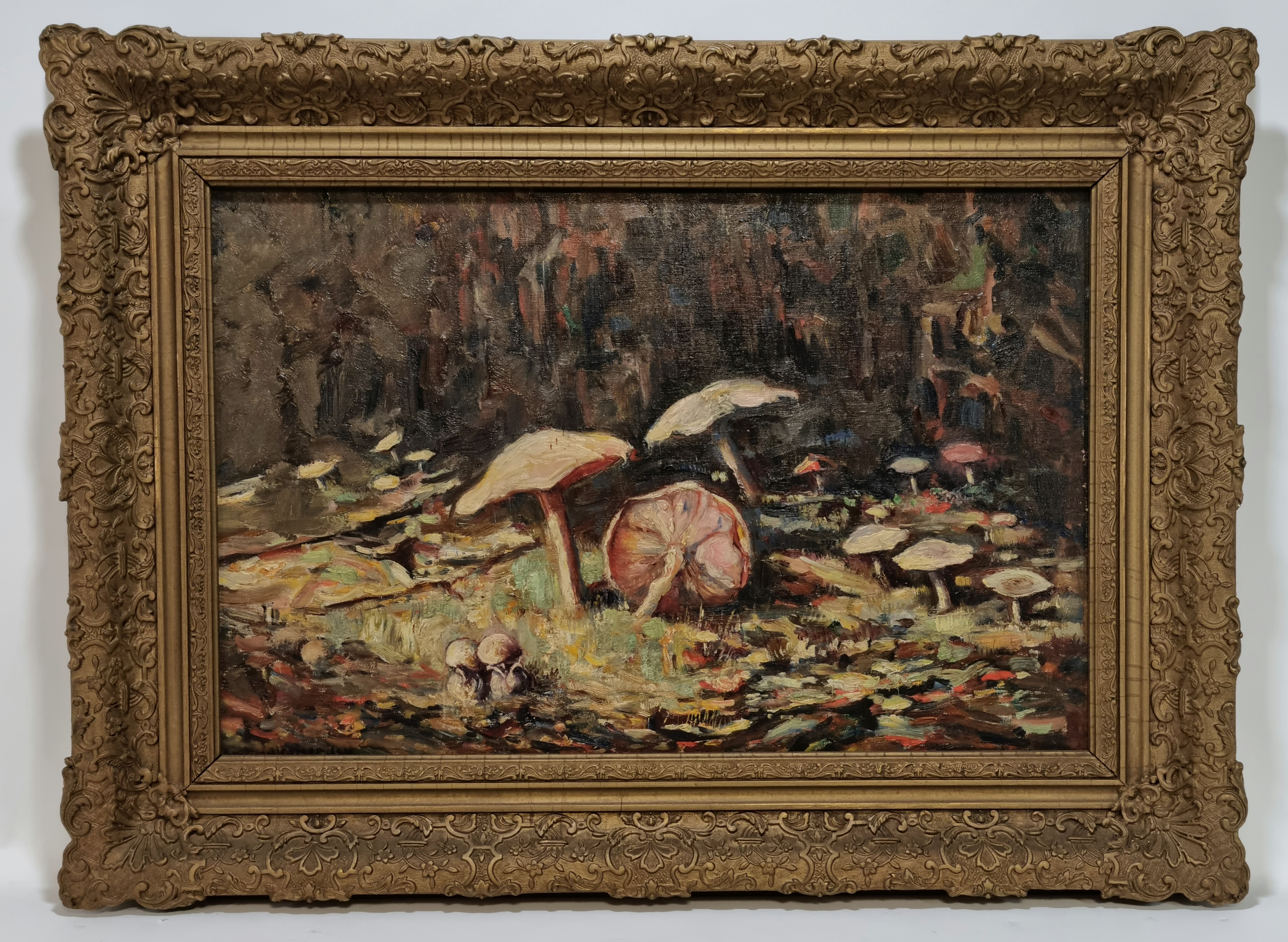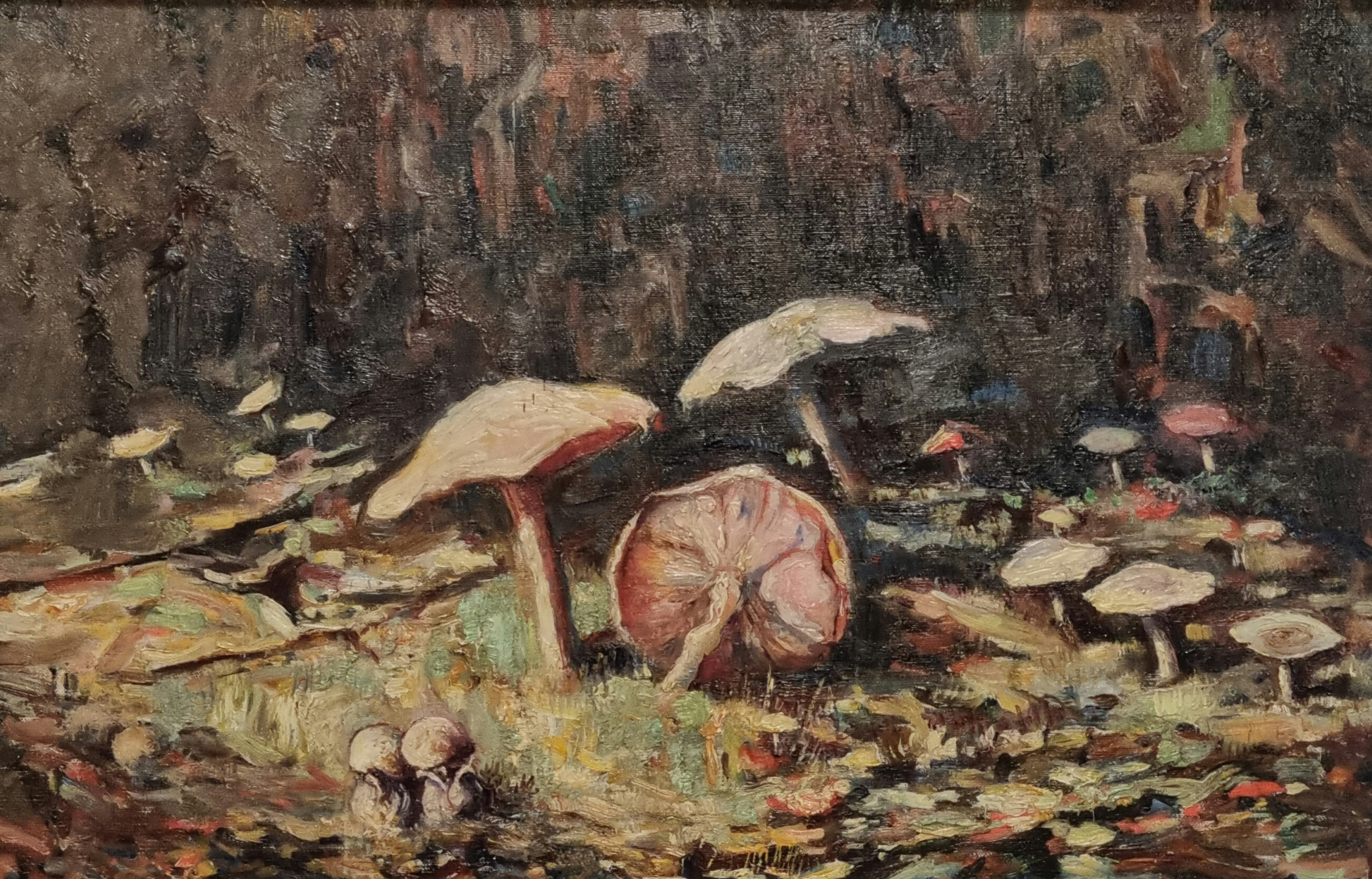 Schilderij van herfstlandschap met paddenstoelen, olieverf op doek, Anthony Keizer (1897-1961). Rechtsonder gesigneerd, tweede kwart 20e eeuw.