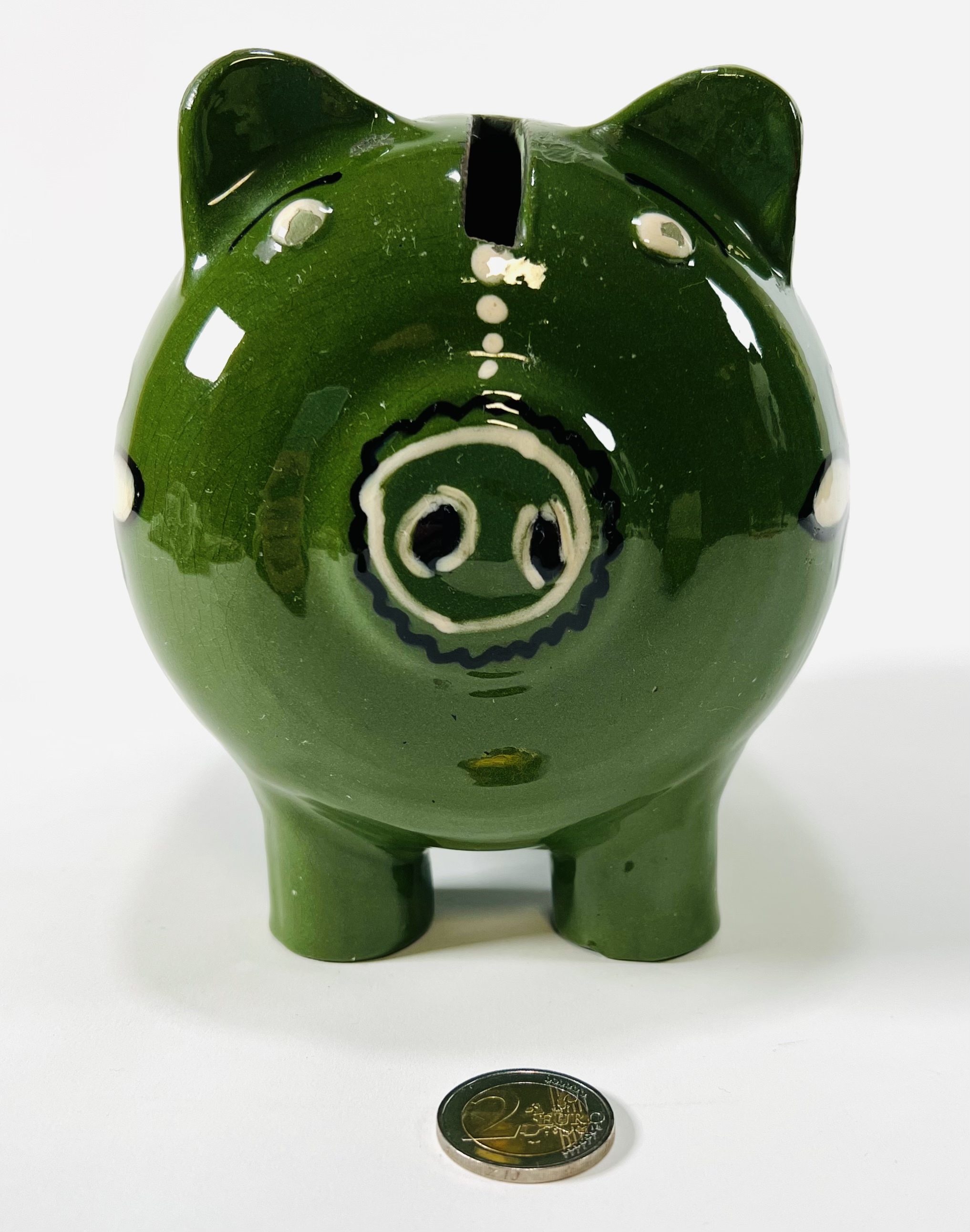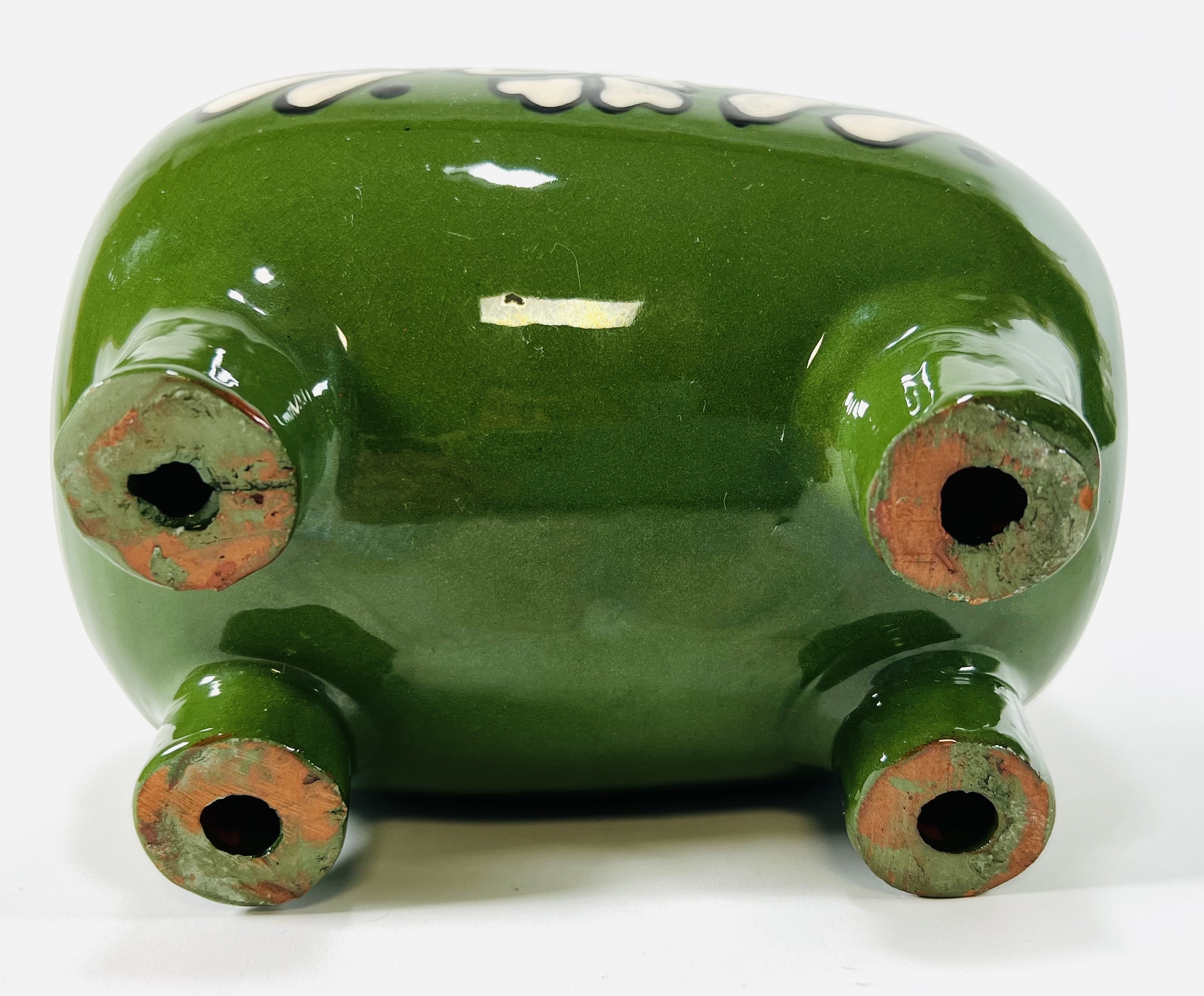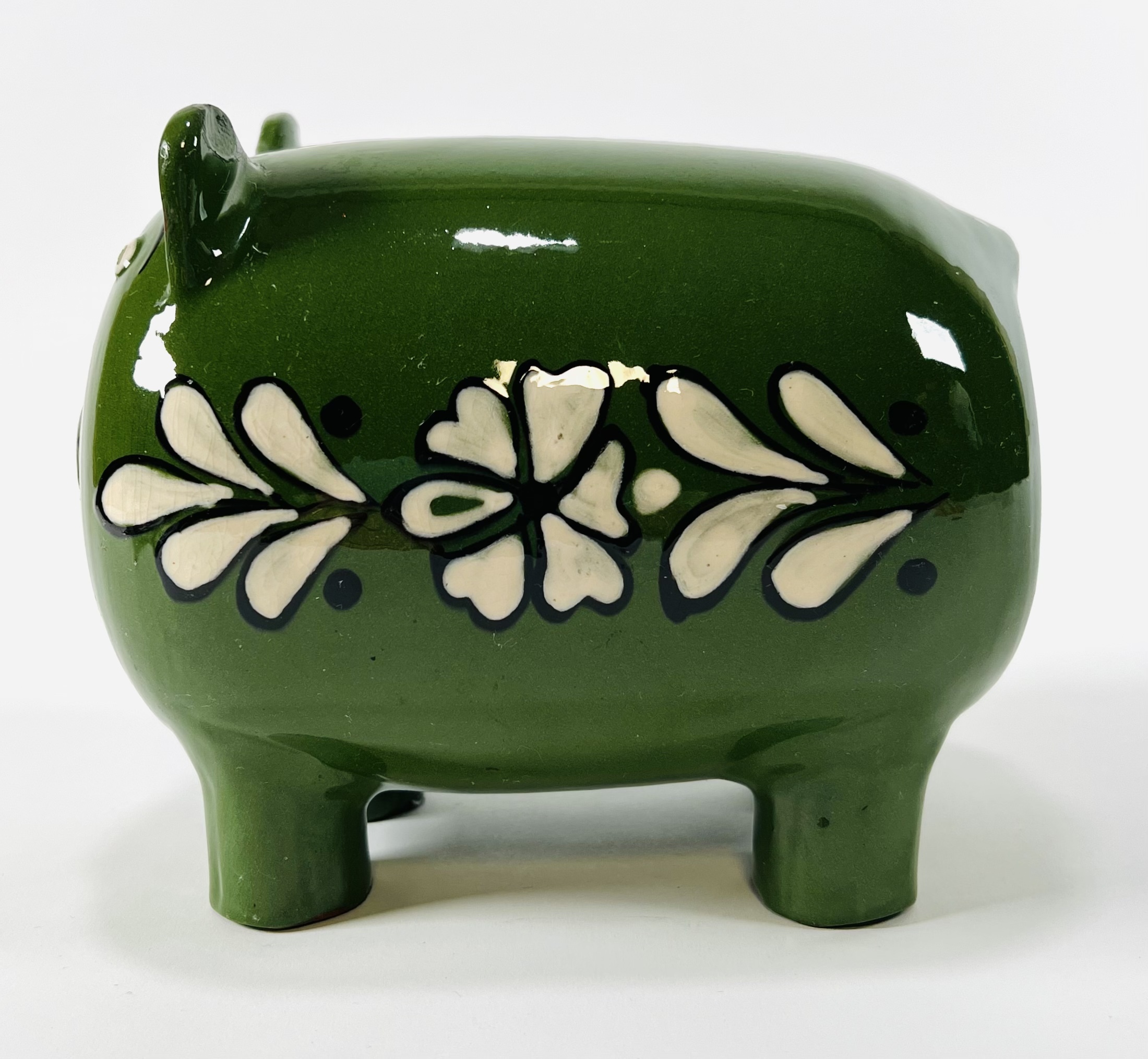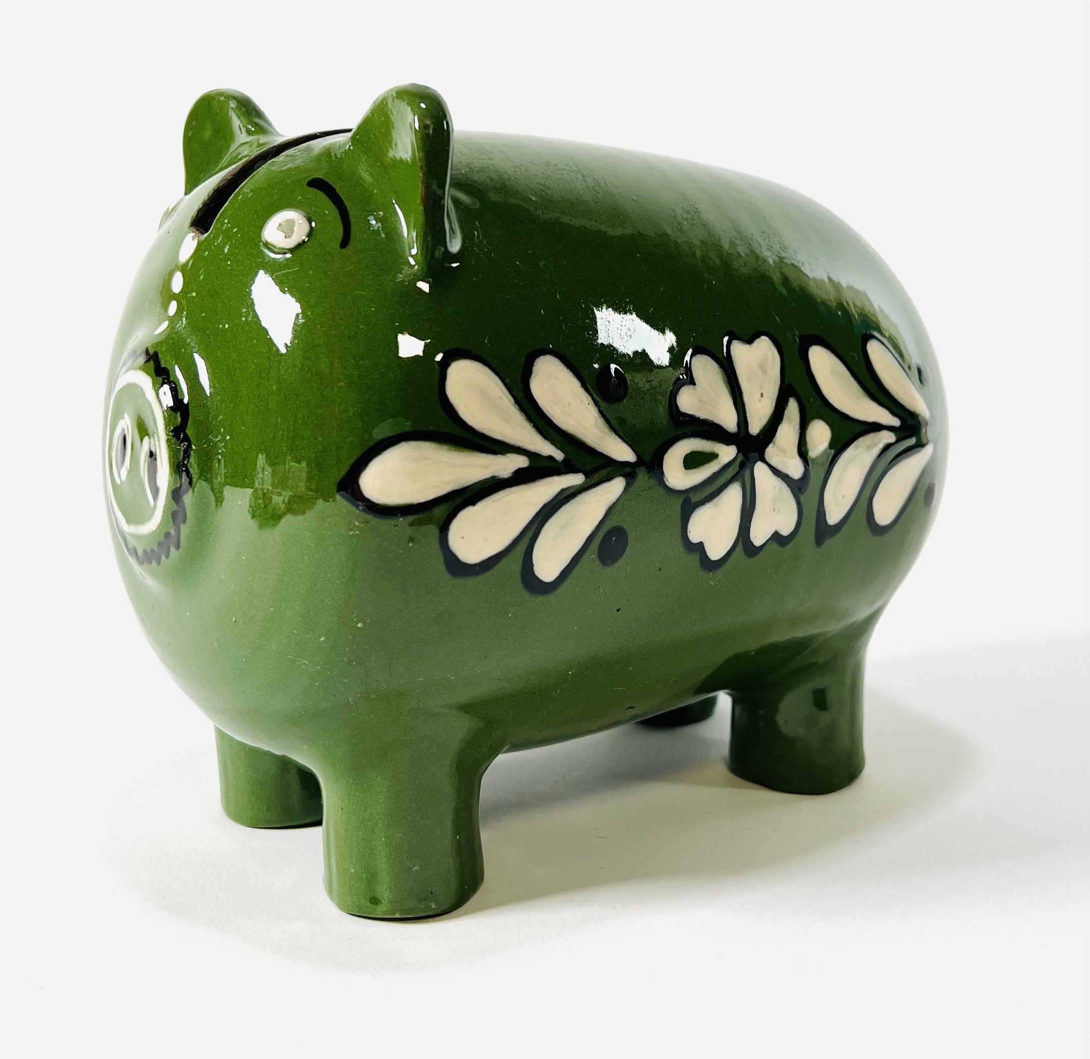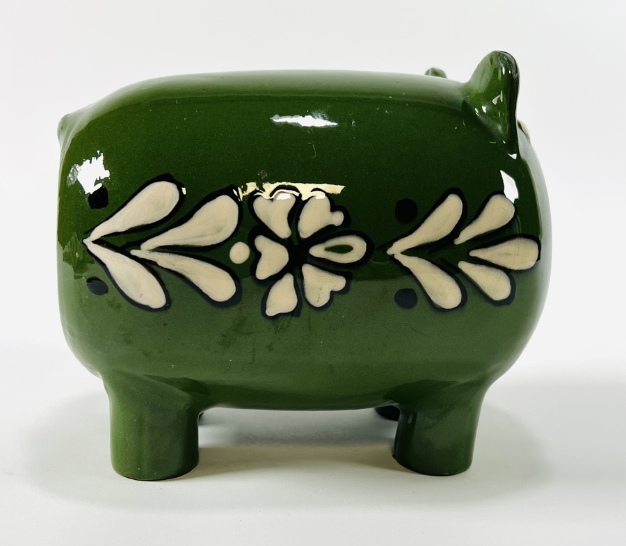 Keramieken groen geglazuurd spaarvarken met florale decoratie. Oost-Europa, omgeving Hongarije, jaren 70. |