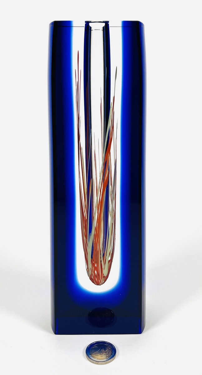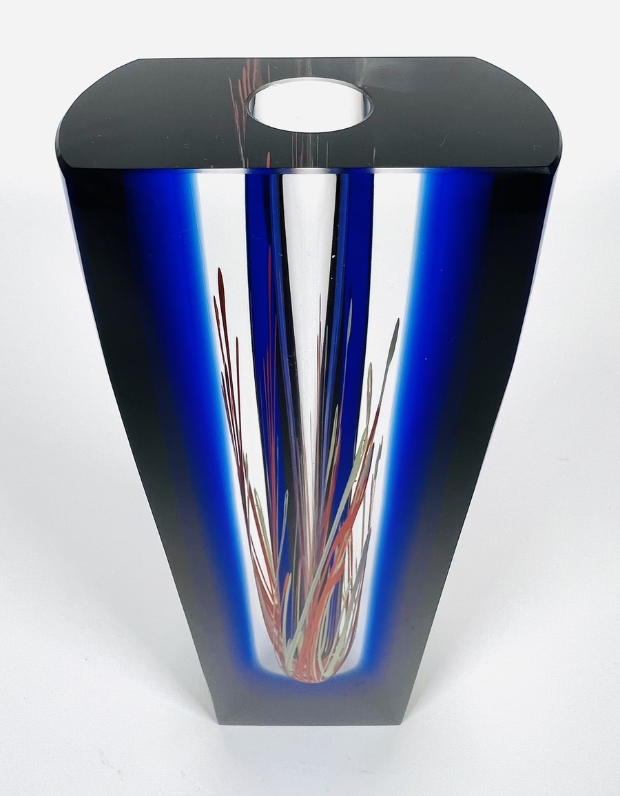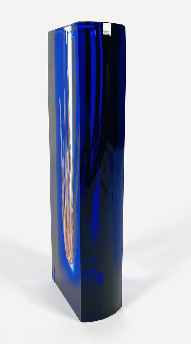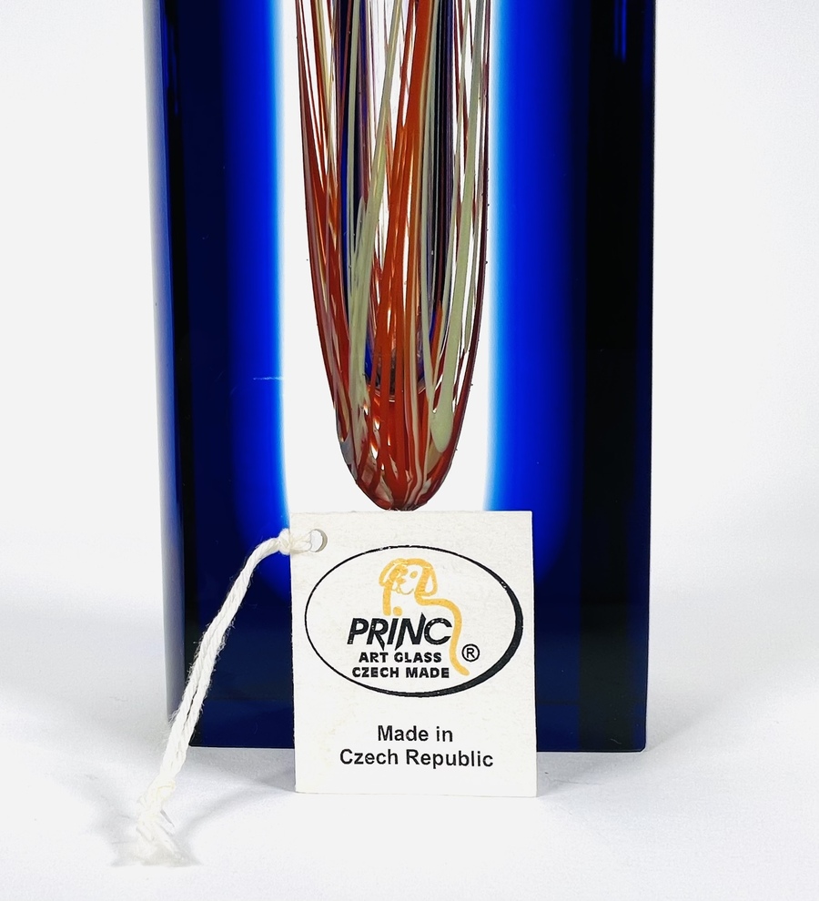Blauwe kristallen design vaas in Sommerso techniek van Hut Princ, aan de onderzijde gegraveerde signatuur. Art Glass Tsjechië, vierde kwart 20e eeuw. |