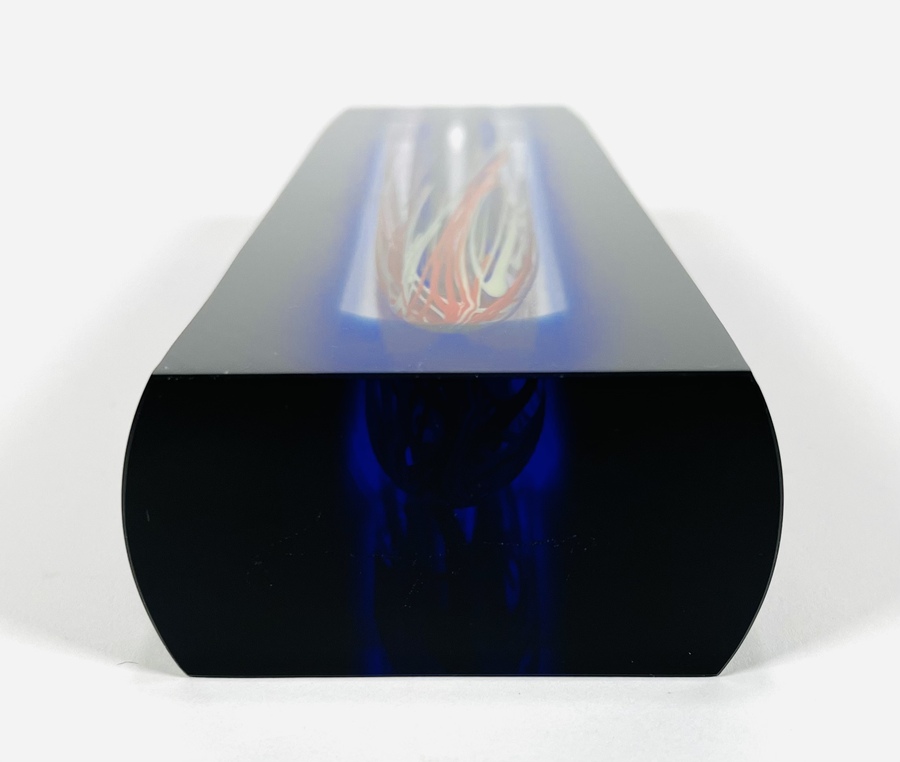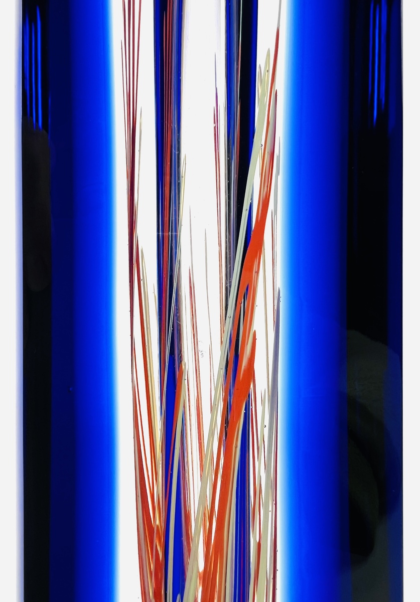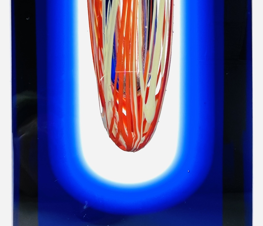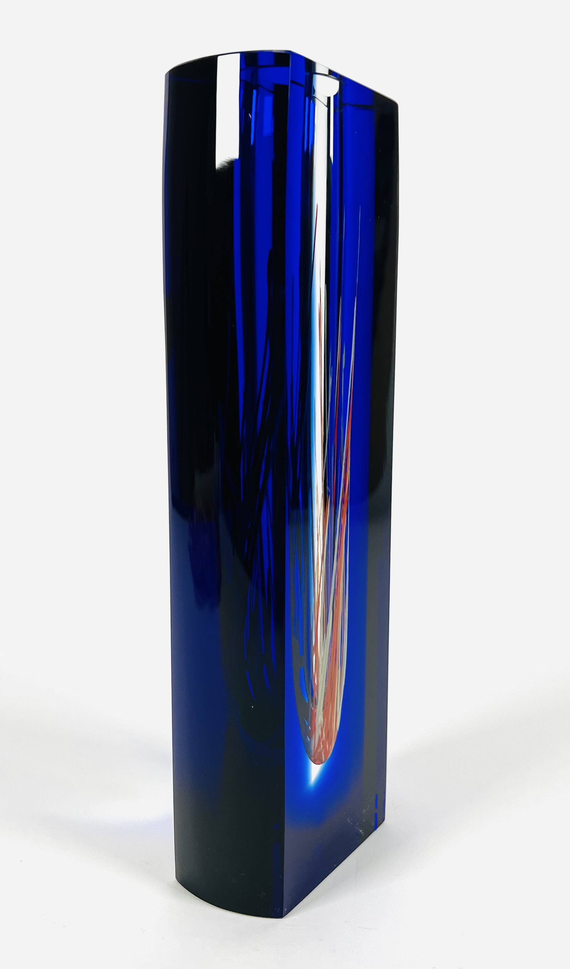 Blauwe kristallen design vaas in Sommerso techniek van Hut Princ, aan de onderzijde gegraveerde signatuur. Art Glass Tsjechië, vierde kwart 20e eeuw. |