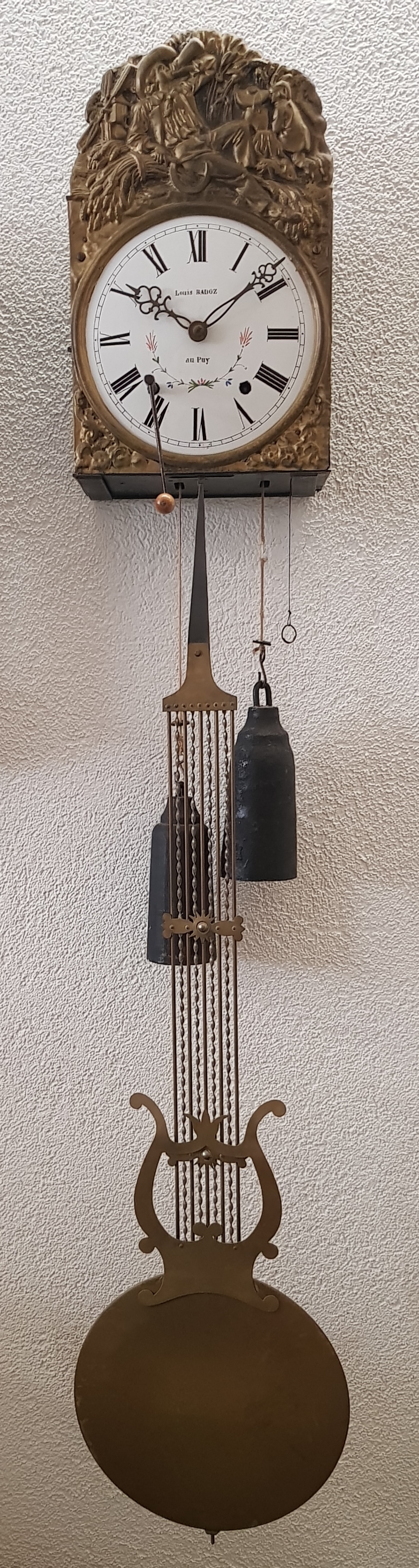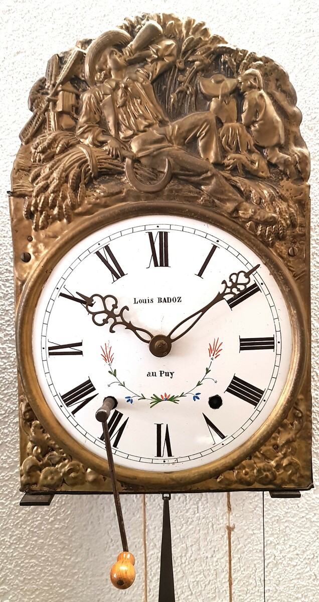 Franse latoen messing comtoise met harpslinger, voorzien van geëmailleerde wijzerplaat met florale decoratie. Gesigneerd Louis Badoz au Puy, circa 1900. |