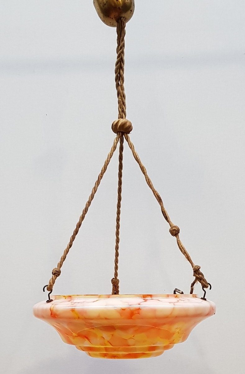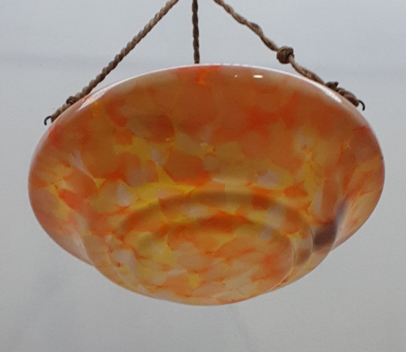 Art Deco glazen hanglamp in oranje-geel spetterglas. Frankrijk, jaren 30. |