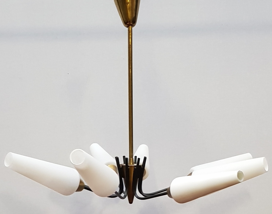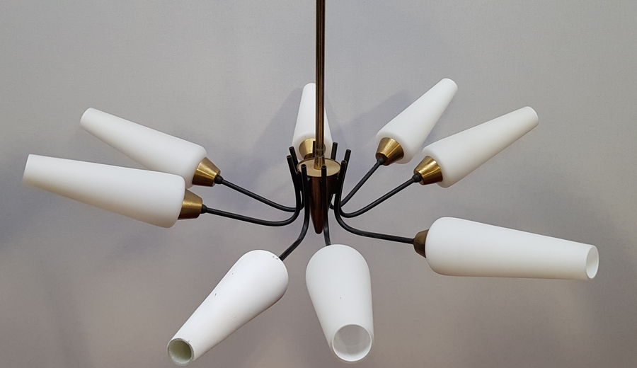 Mid-century modern plafondlamp met acht melkglazen lichtpunten, jaren 50/60. |