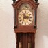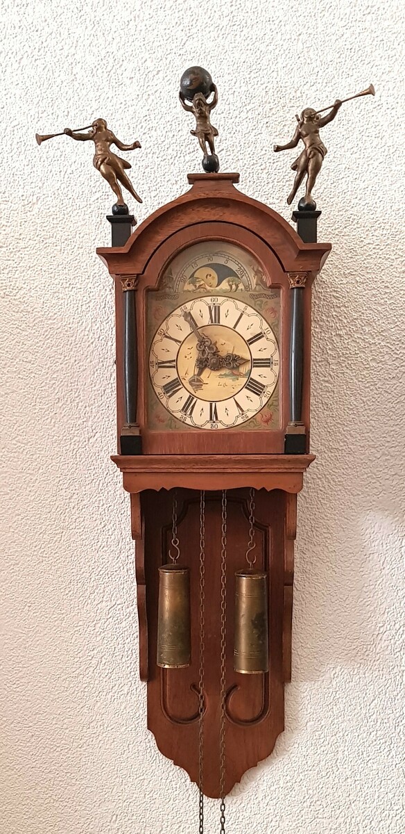 Friese eikenhouten notarisklok. De wijzerplaat is met vissersboten gedecoreerd met boven de wijzerplaat een maanfunctie, kap is voorzien van twee geëboniseerde pilaren met koperen kapitelen en bovenop de kap atlas en twee engelen. Vierde kwart 20e eeuw. |