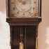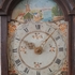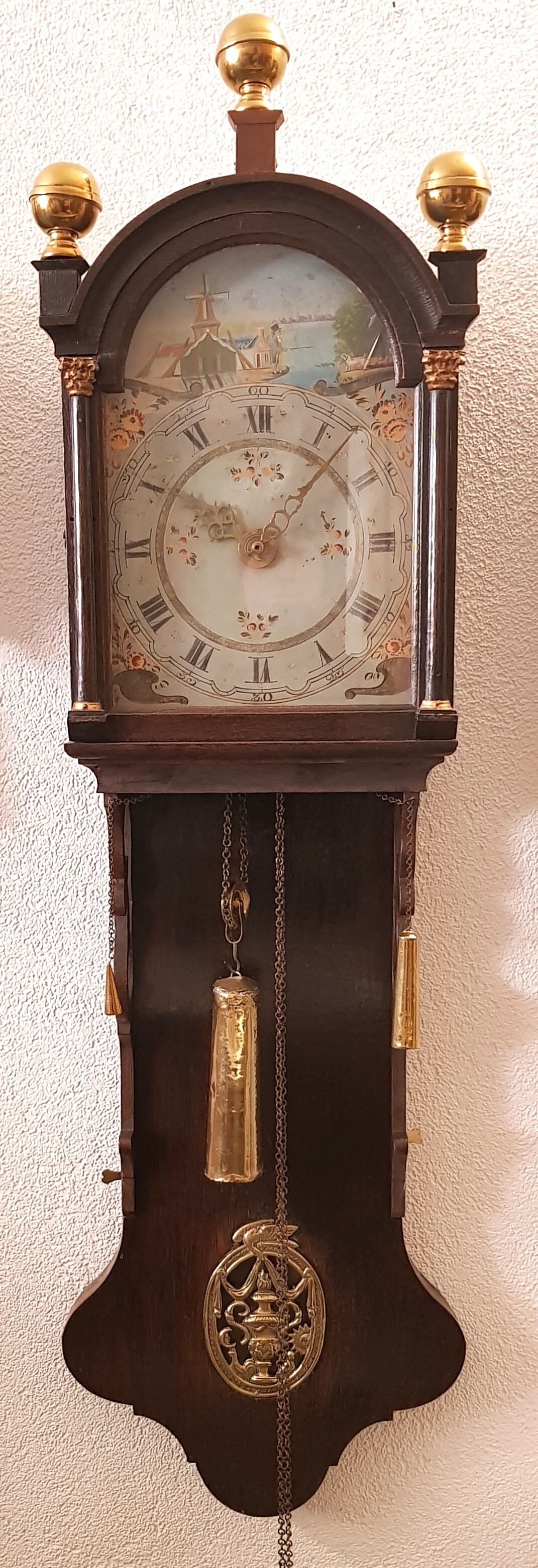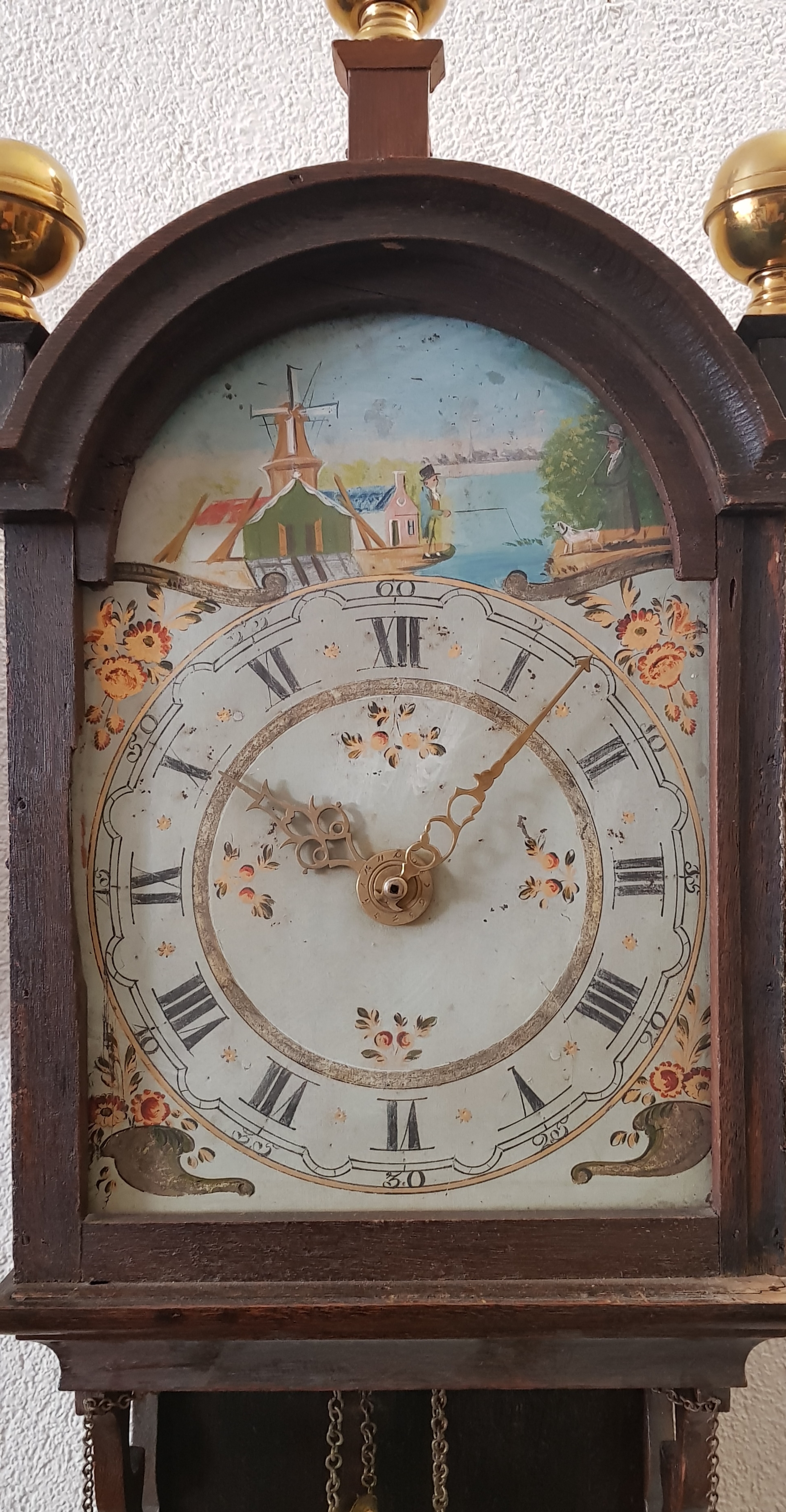 Friese eikenhouten staartklok met een schuif welke is voorzien van wangen en een ovaal venster met messing ornament. De wijzerplaat is floraal handbeschilderd met boven de wijzerplaat een Fries dorpsgezicht en onderin de hoeken hoornen des overvloeds. Kap is voorzien van twee bruine pilaren met beschilderde metalen kapitelen en bovenop de kap drie messing bollen. Eerste helft 20e eeuw. |