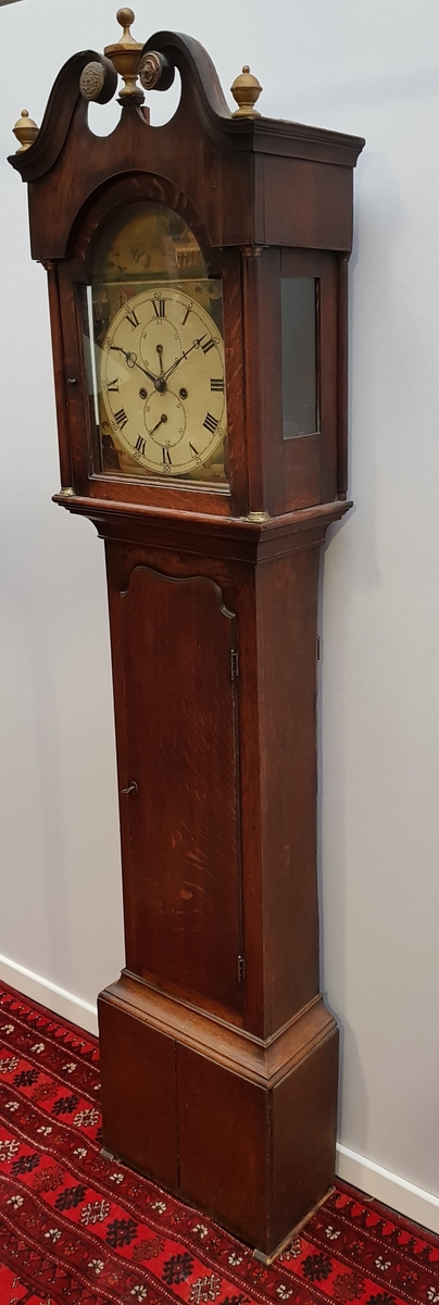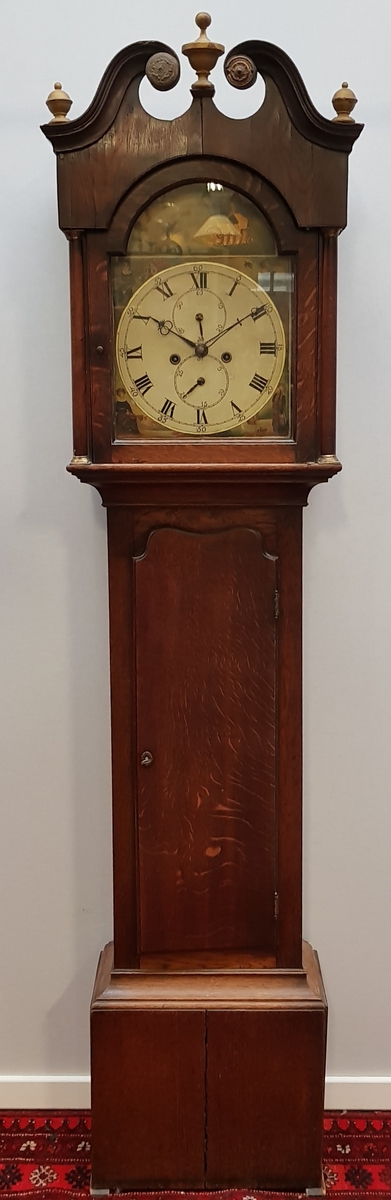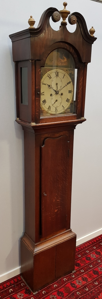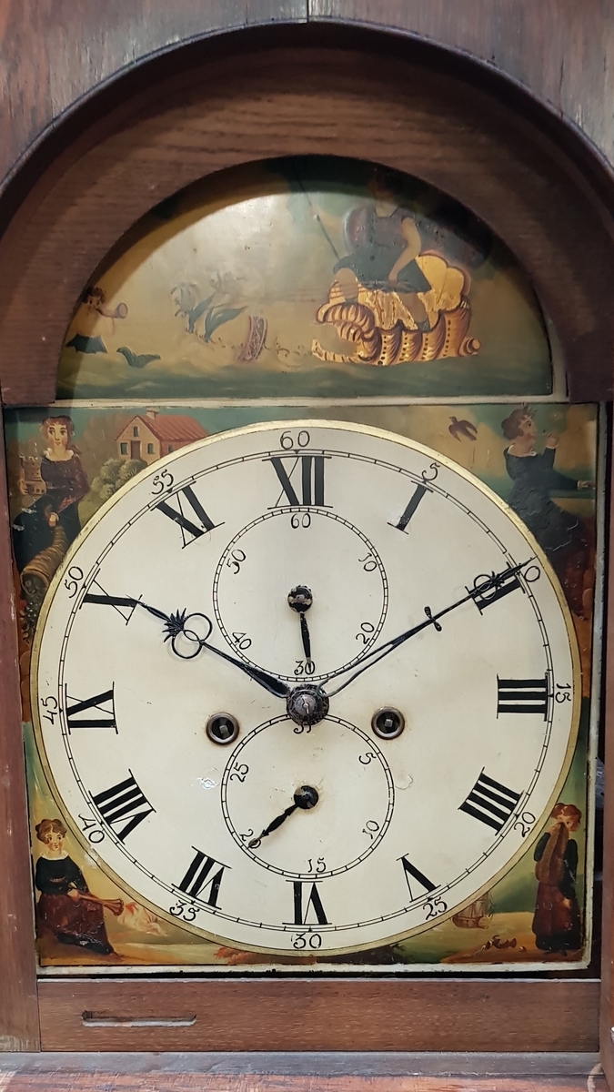 Engels staand horloge met beschilderde wijzerplaat voorzien van Romeinse cijfers en de vierjaargetijden, zogenaamde Grandfathers clock, 19e eeuw. |