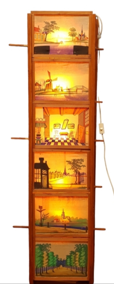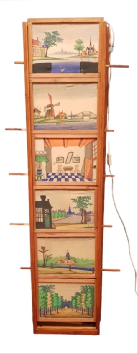 Schaduwtheater met verschillende geaquarelleerde Groningse landschappen. Jaren 60/70. |