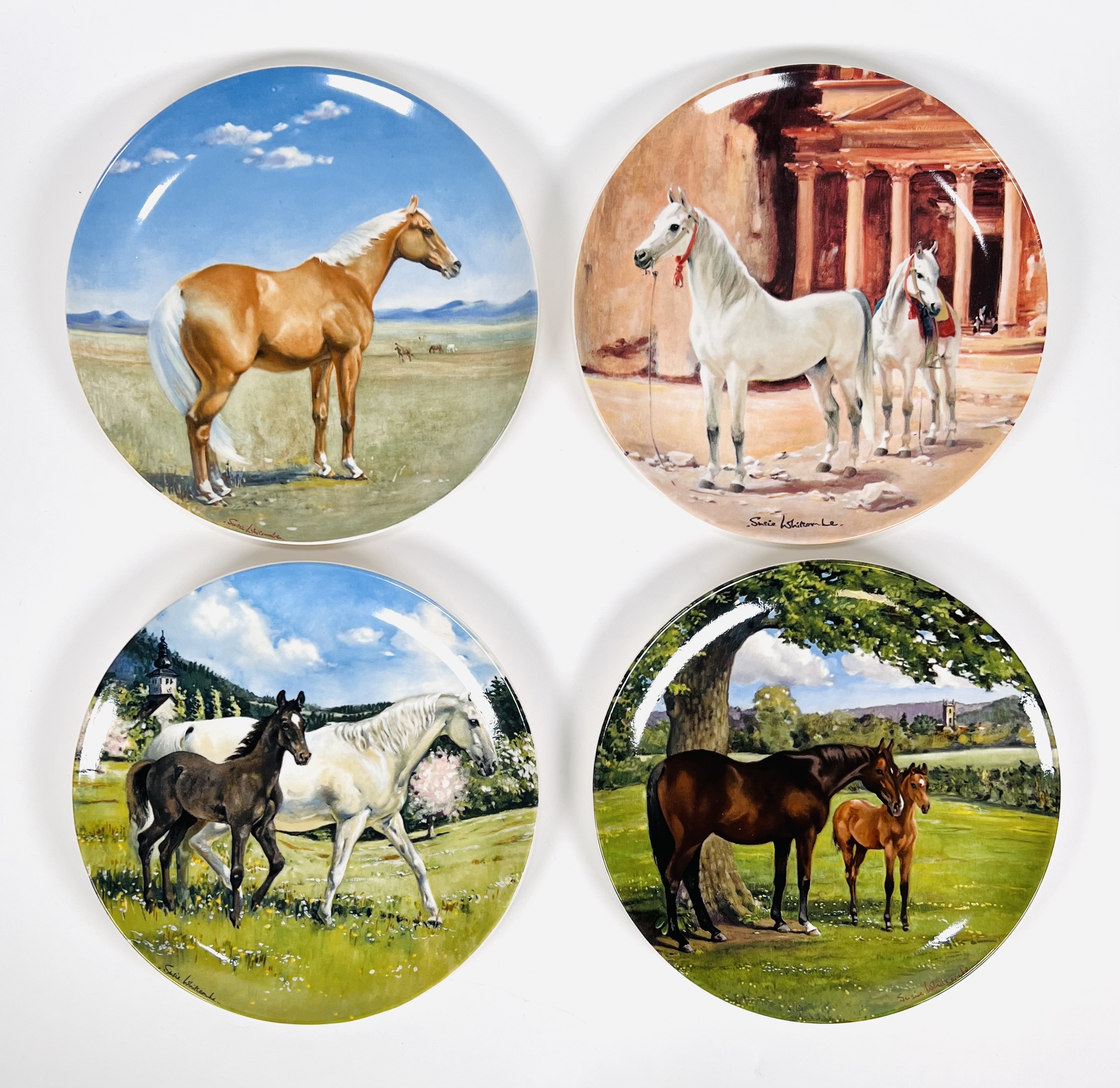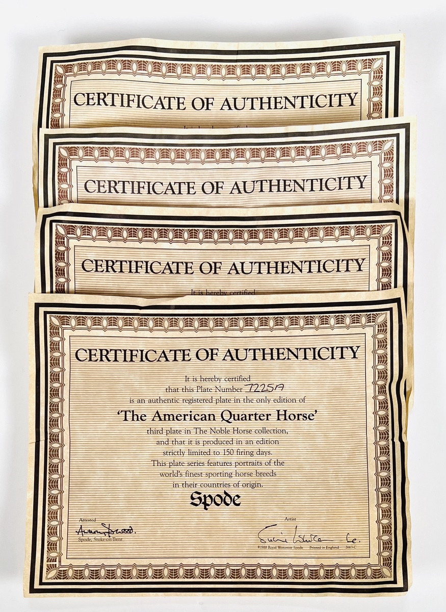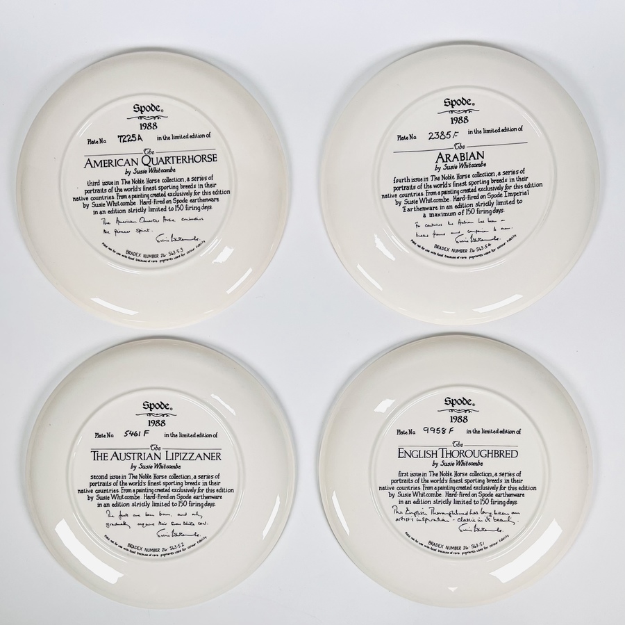 Vier keramieken sierborden uit de Noble Horse Collection; Lippizaner, Arabian, American Quaterhorse en English Thoroughbred. Ontwerp Susie Whitcombe en uitgevoerd door Spode, England. Alle vier borden met certificaat en genummerd en gedateerd 1988. |