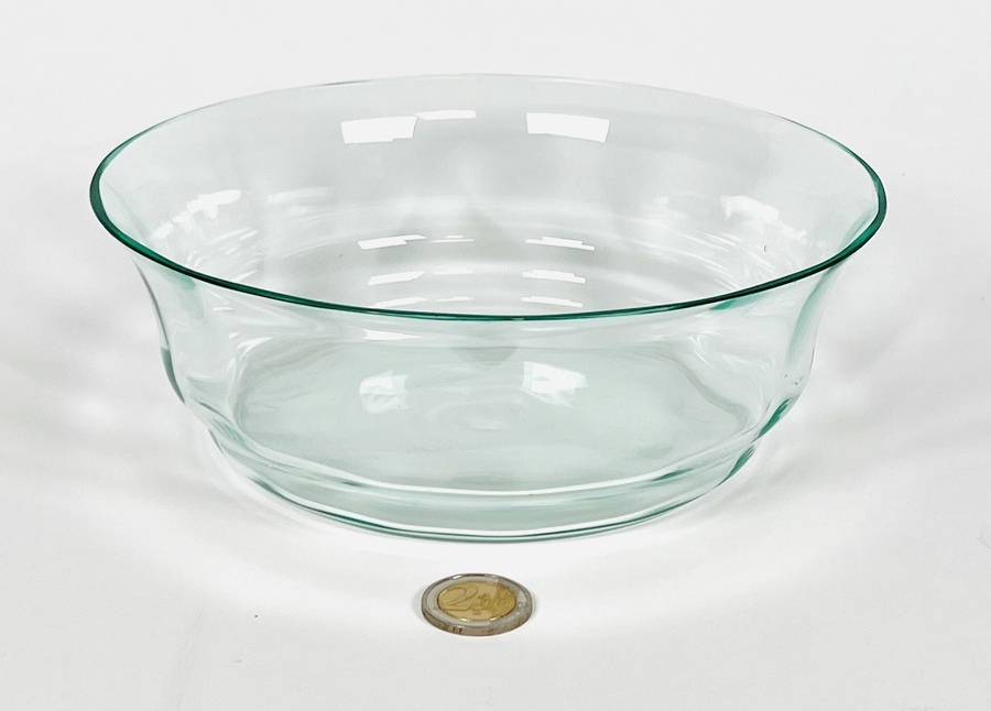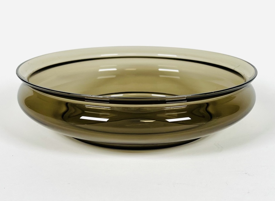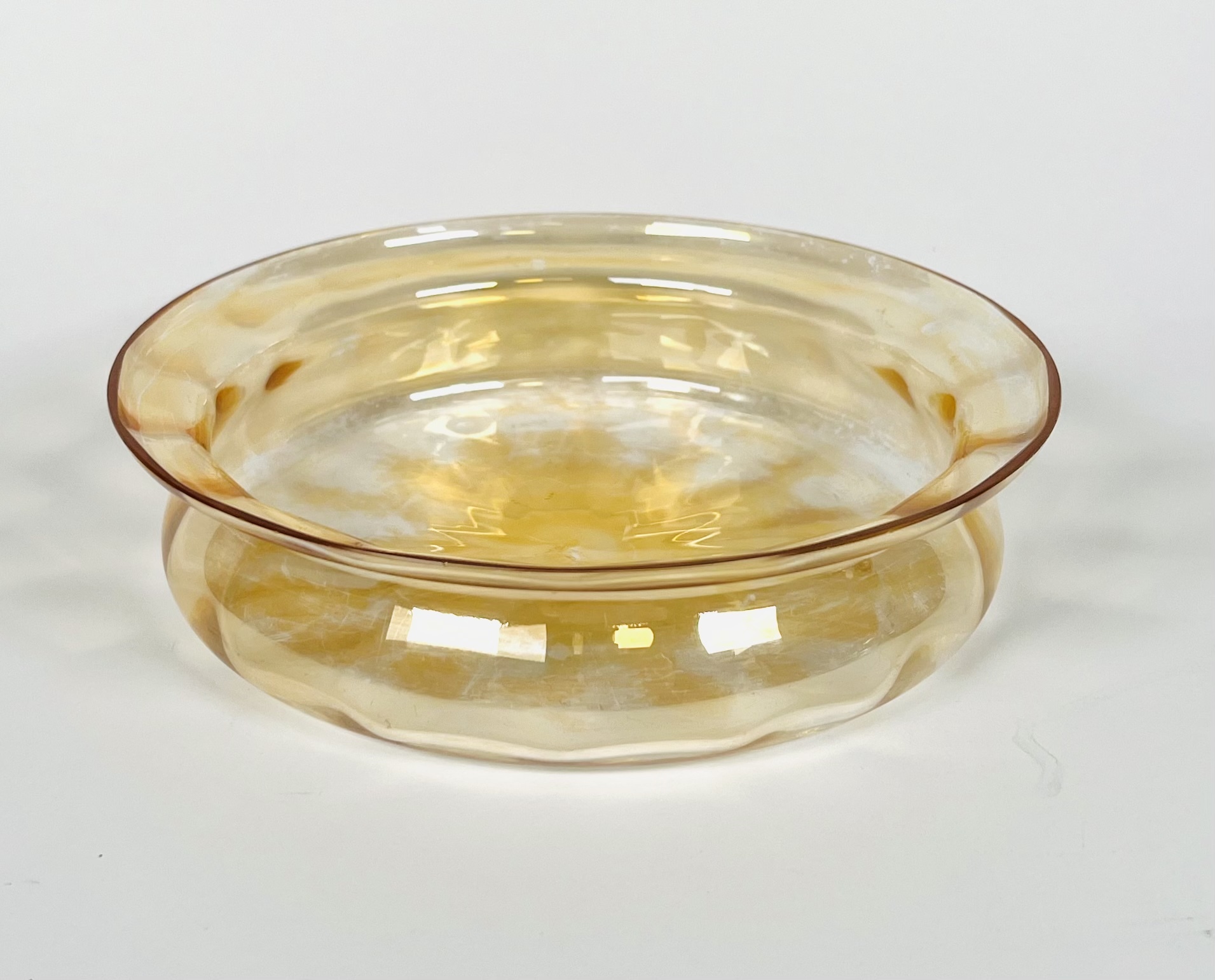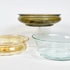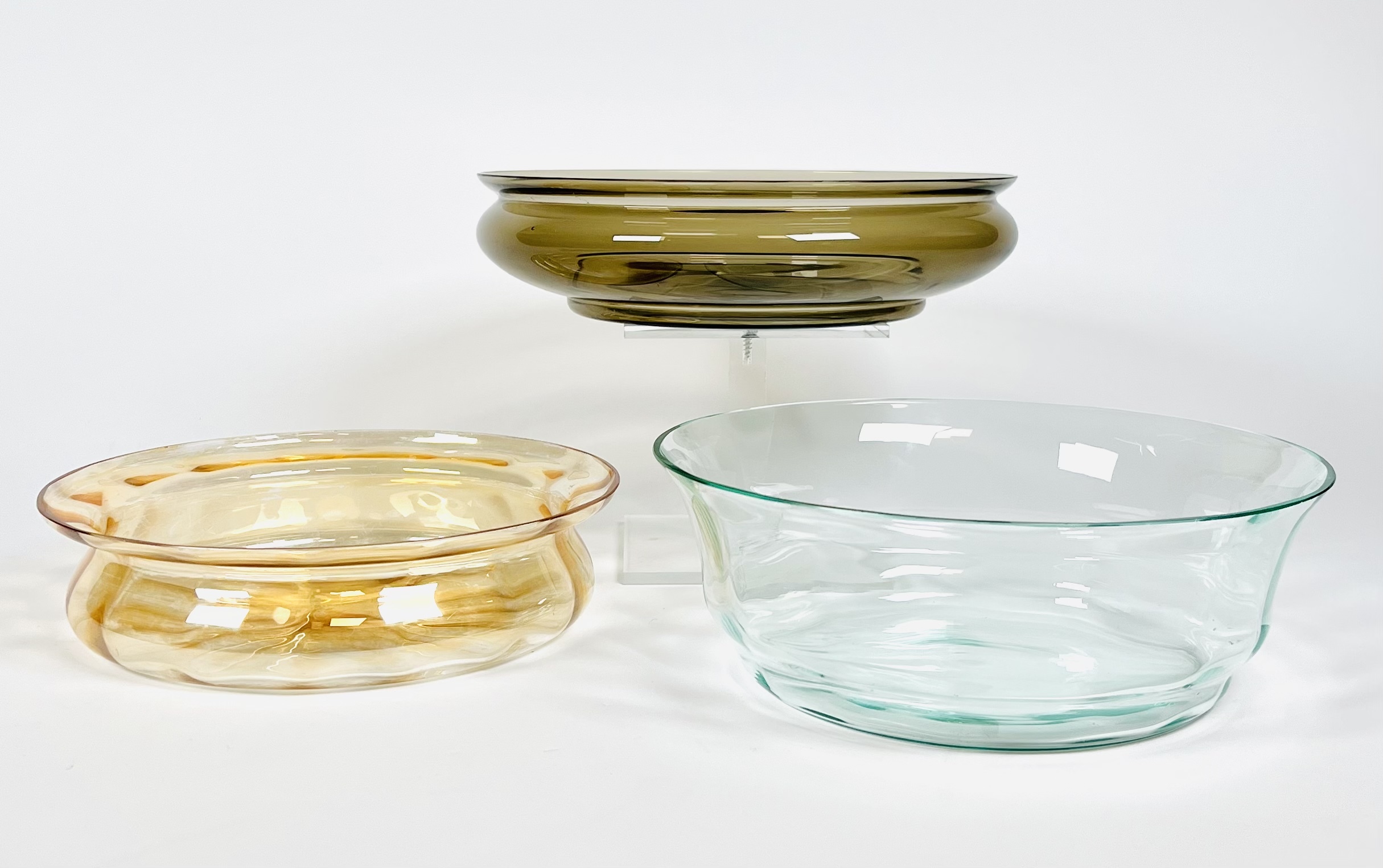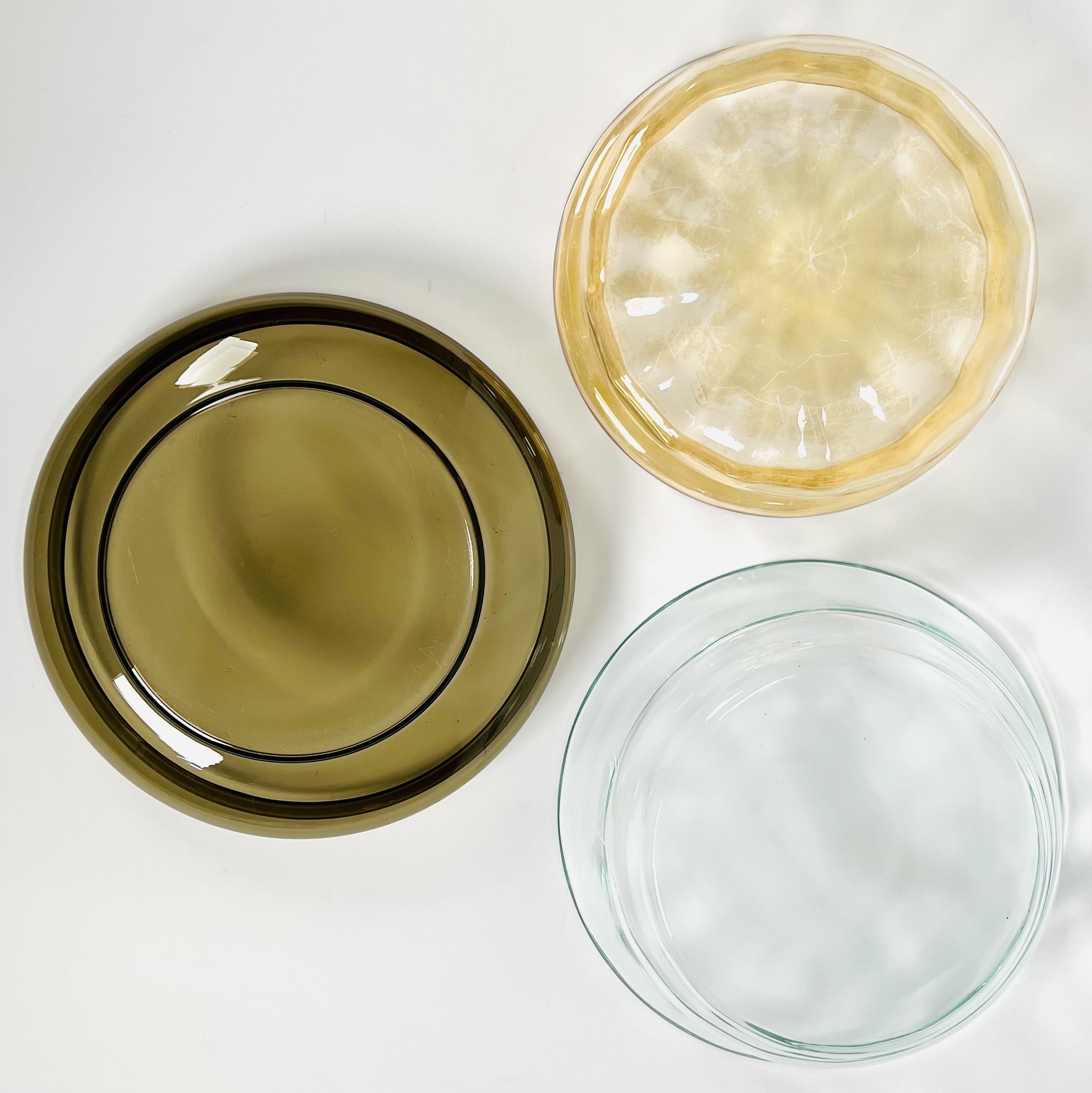 Drie glazen drijfschalen waarvan de okerkleurige een iriserende werking heeft. 20e eeuw. |