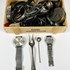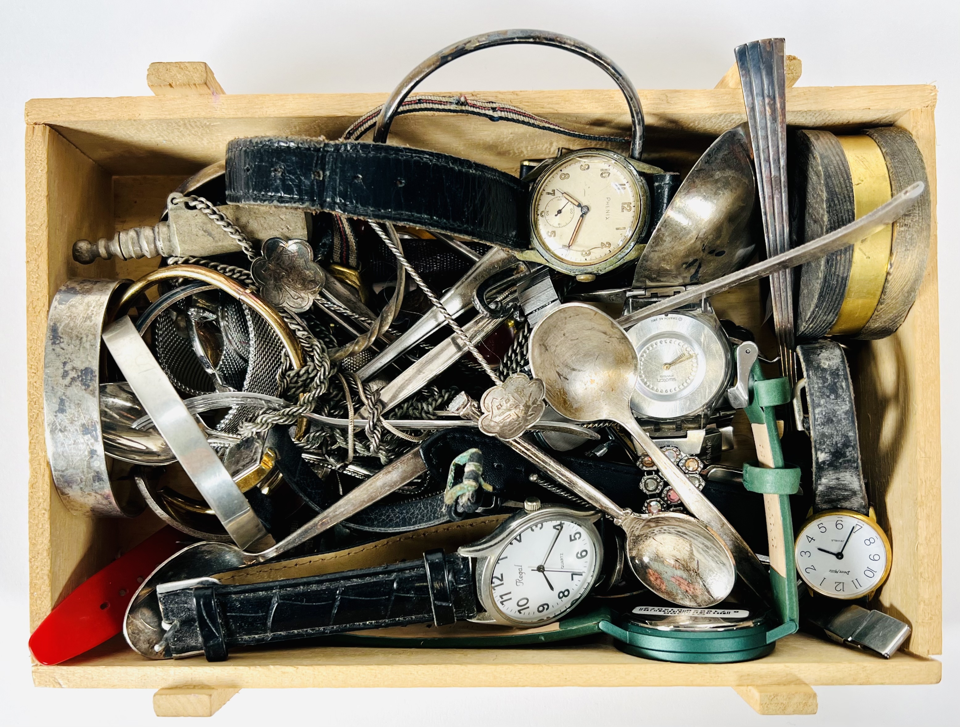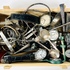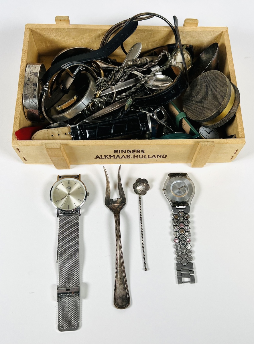 Houten kistje gevuld met zes armbanden, twee kettingen, dertien horloges, lepeltjes en vorken. 20e/21e eeuw. |