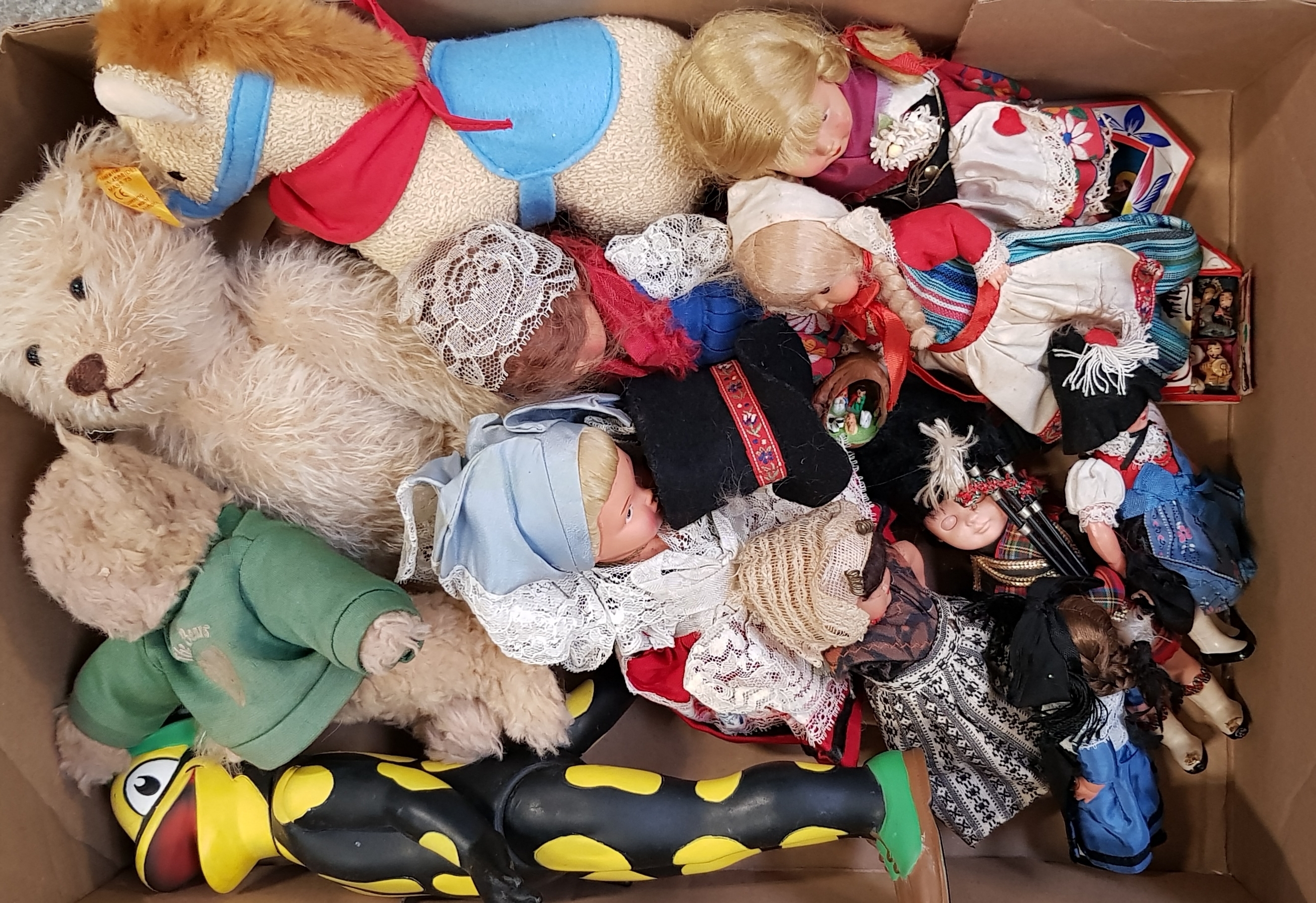 Lot speelgoed met twaalf poppen en dieren, waaronder een Steiff teddybeer. Tweede helft 20ste eeuw. |